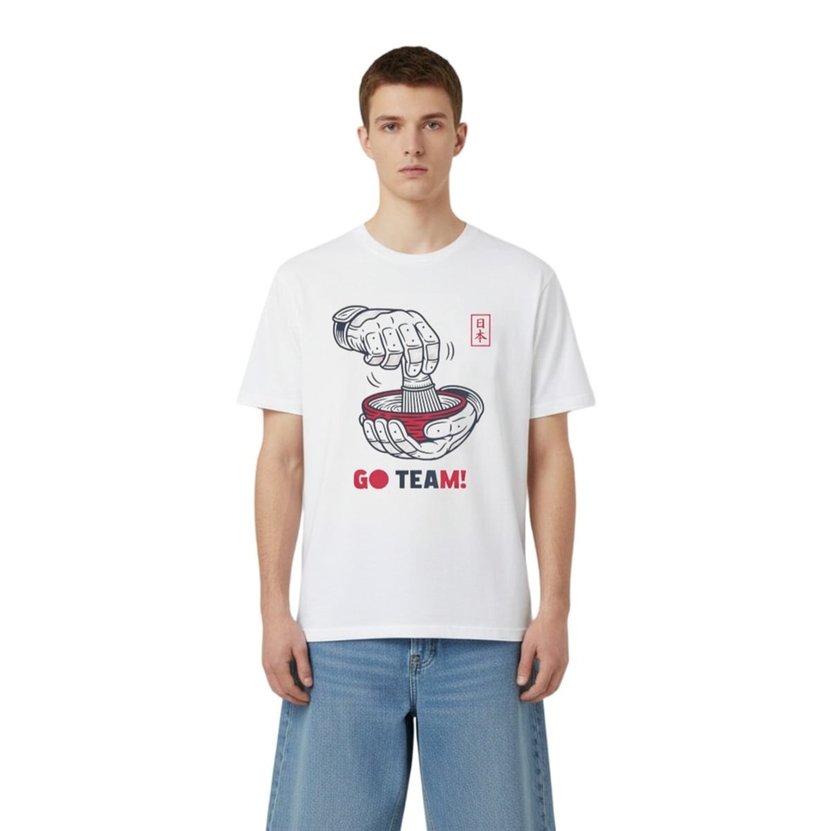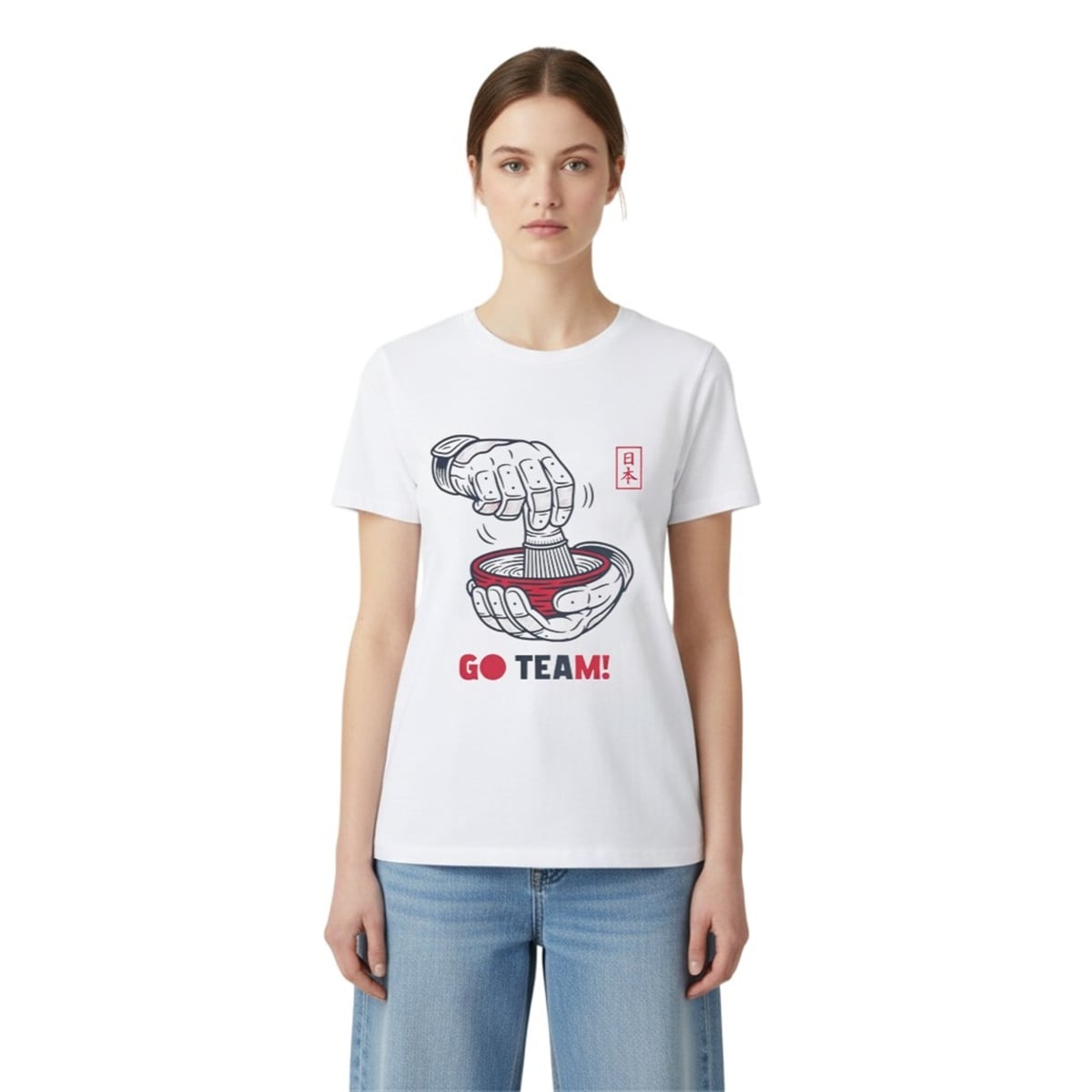 The tee is a masterclass in visual storytelling. The central illustration features finely detailed, comic-book-style hands meticulously using a chasen to froth bright green tea inside a traditional chawan (tea bowl). Hovering next to this serene action is a classic red stamp featuring the Kanji characters “日本” (Nihon), proudly translating to “Japan.” Directly below the artwork, the text “GO TEAM!” is displayed in bold, modern typography. The letter ‘O‘ in ‘GO‘ is creatively replaced with a solid red circle, instantly evoking the Hinomaru—the iconic Japanese flag. This brilliant fusion transforms an everyday item into a compelling piece of wearable art.