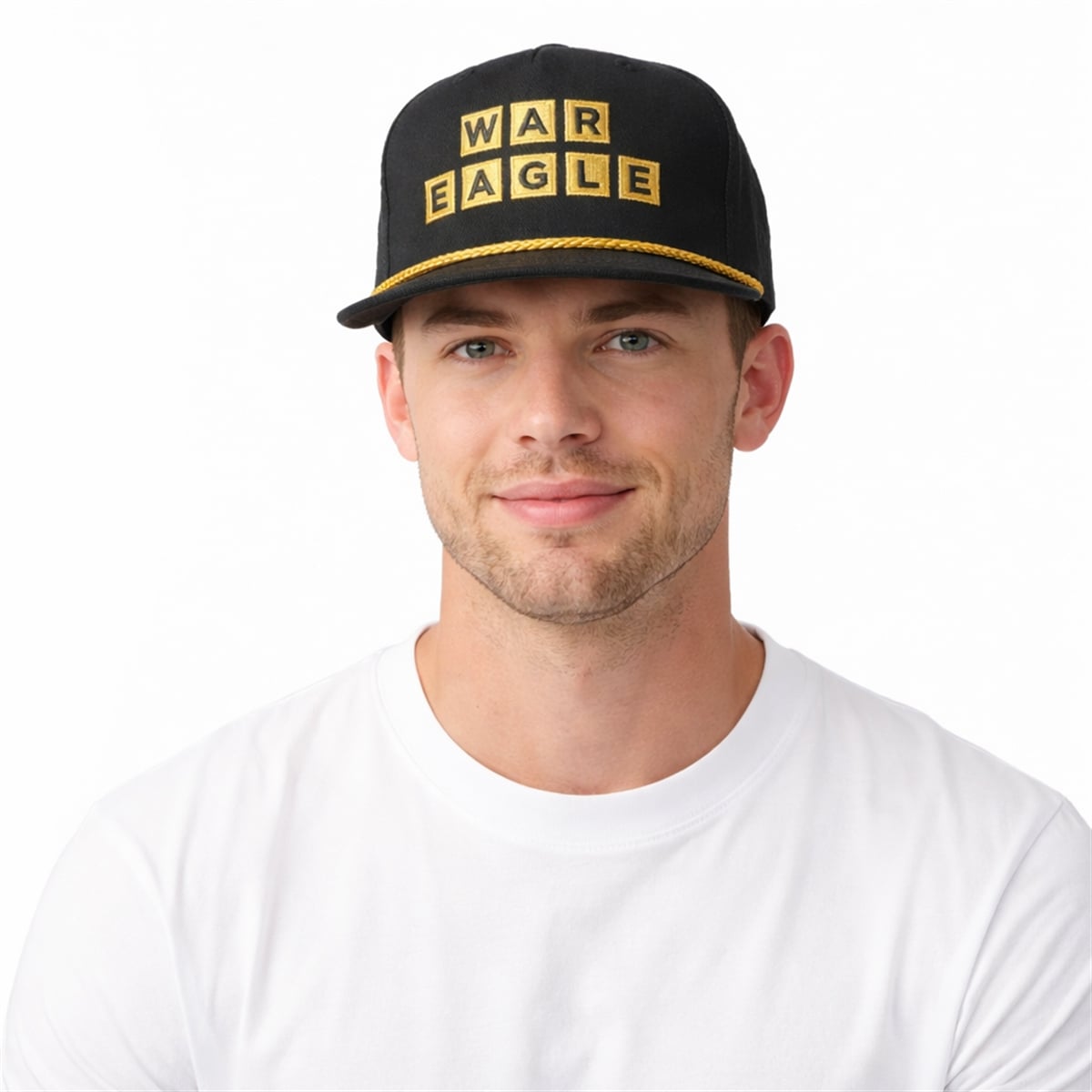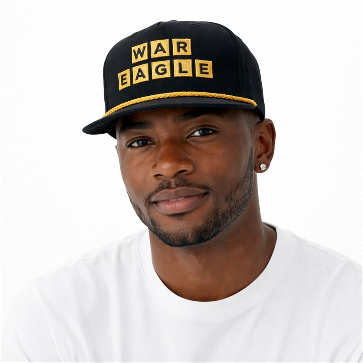 This hat is the epitome of modern college football fandom, specifically optimized for the passionate energy of the 2026 season. It represents a massive shift in sports fashion, leaning heavily into bold, unapologetic declarations of team loyalty. The sleek dark background serves as the perfect canvas, contrasting flawlessly with the striking gold “WAR EAGLE” text. These letters are separated into individual, raised squares, creating a distinct visual rhythm that absolutely commands attention in any crowd. The addition of the golden rope across the brim adds a touch of beloved vintage flair to a highly contemporary silhouette, making it an instant classic in the world of collegiate apparel.