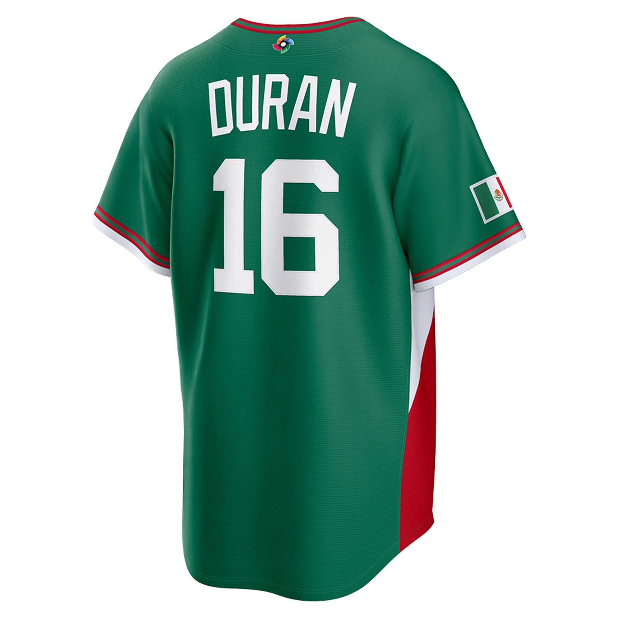 Visually, the jersey is a masterpiece of national pride. It features the deep, rich forest green that has become synonymous with Mexico’s baseball identity. across the chest, the “MEXICO” wordmark is displayed in a classic, bold font with red and white outlining, ensuring the team name pops against the dark background. The back showcases “DURAN” and his signature number “16” in large, legible block lettering, making it instantly recognizable from a distance. The sleeves are accented with the Mexican flag patch, adding a final touch of patriotic detail that completes the look. The silhouette offers a modern, athletic cut that looks sharp whether worn open over a hoodie or buttoned up for a classic game-day appearance.