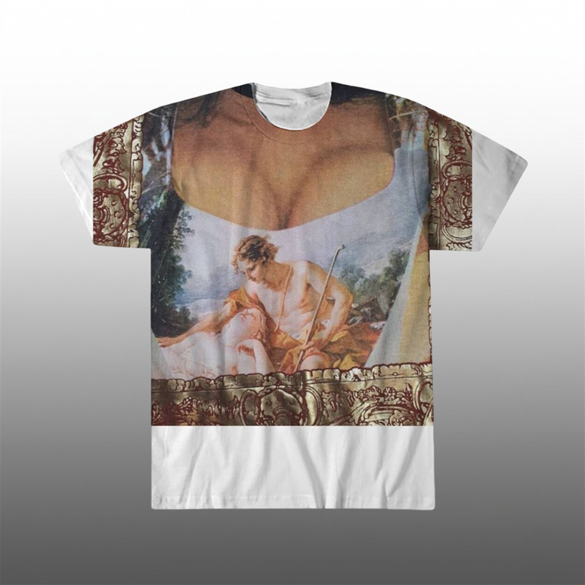The design features a high-definition, all-over print of a classical Rococo scene—often identified as a shepherdess or nymph from the works of François Boucher. The genius of the design, however, lies in its placement. The print creates a hyper-realistic illusion of a low-cut, heaving corset, juxtaposing the modesty of a crewneck t-shirt with the provocative silhouette of 18th-century court wear. This “fake cleavage” aesthetic was a hallmark of Vivienne Westwood’s “Portrait” collections in the early 90s and has since been immortalized by Jay Manuel’s iconic television appearance.