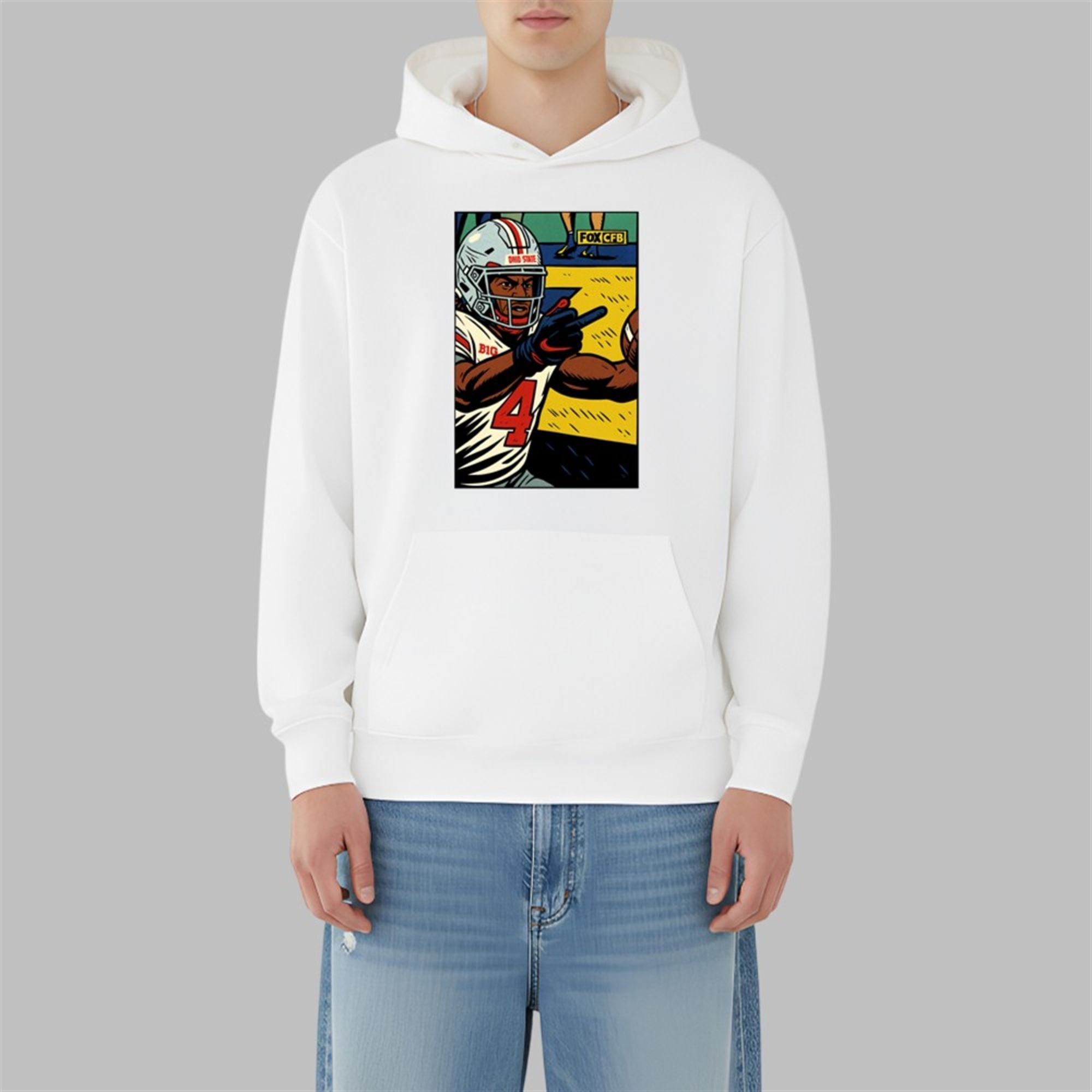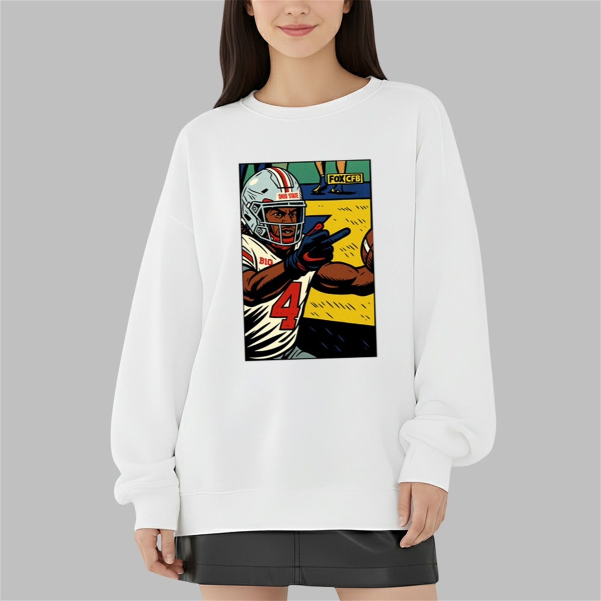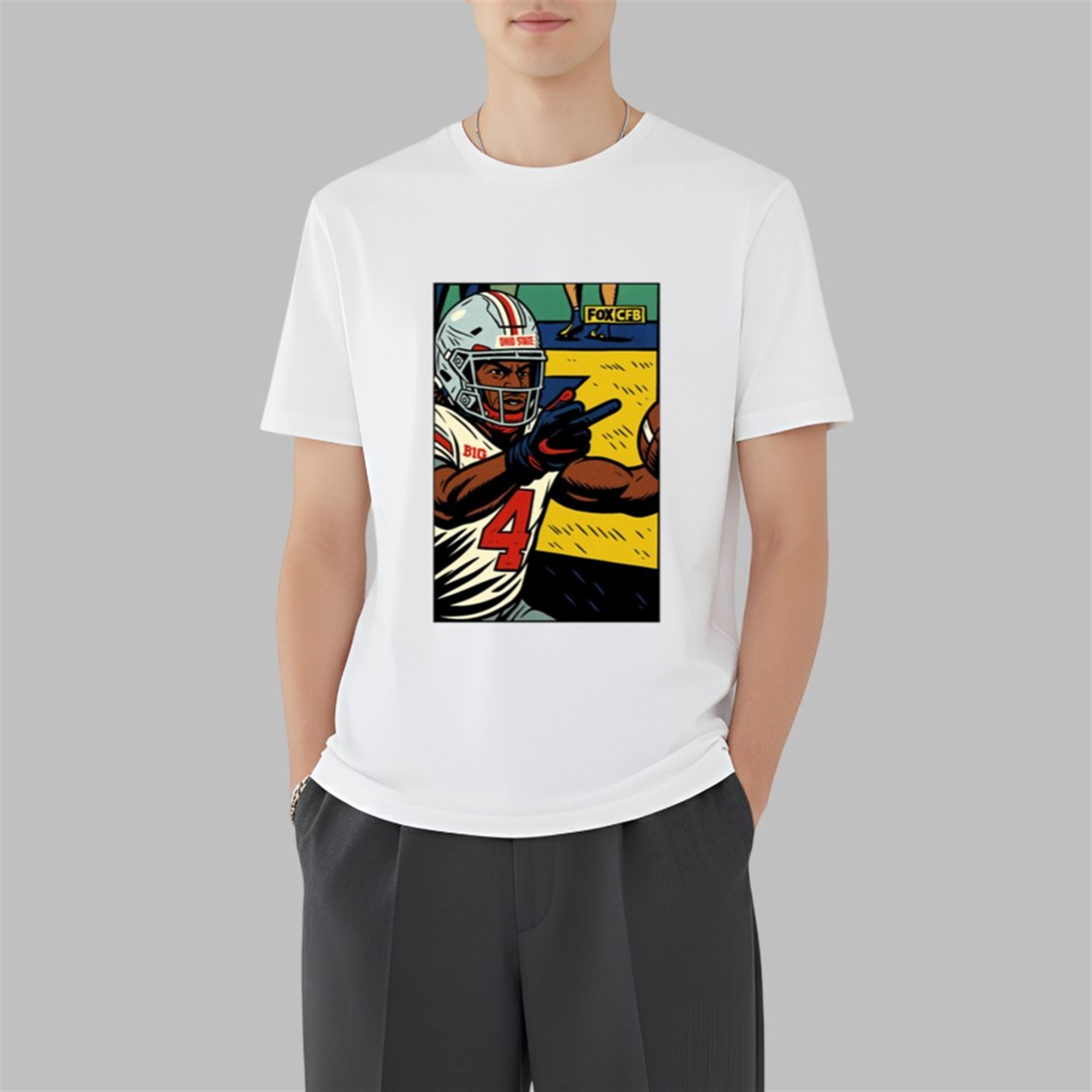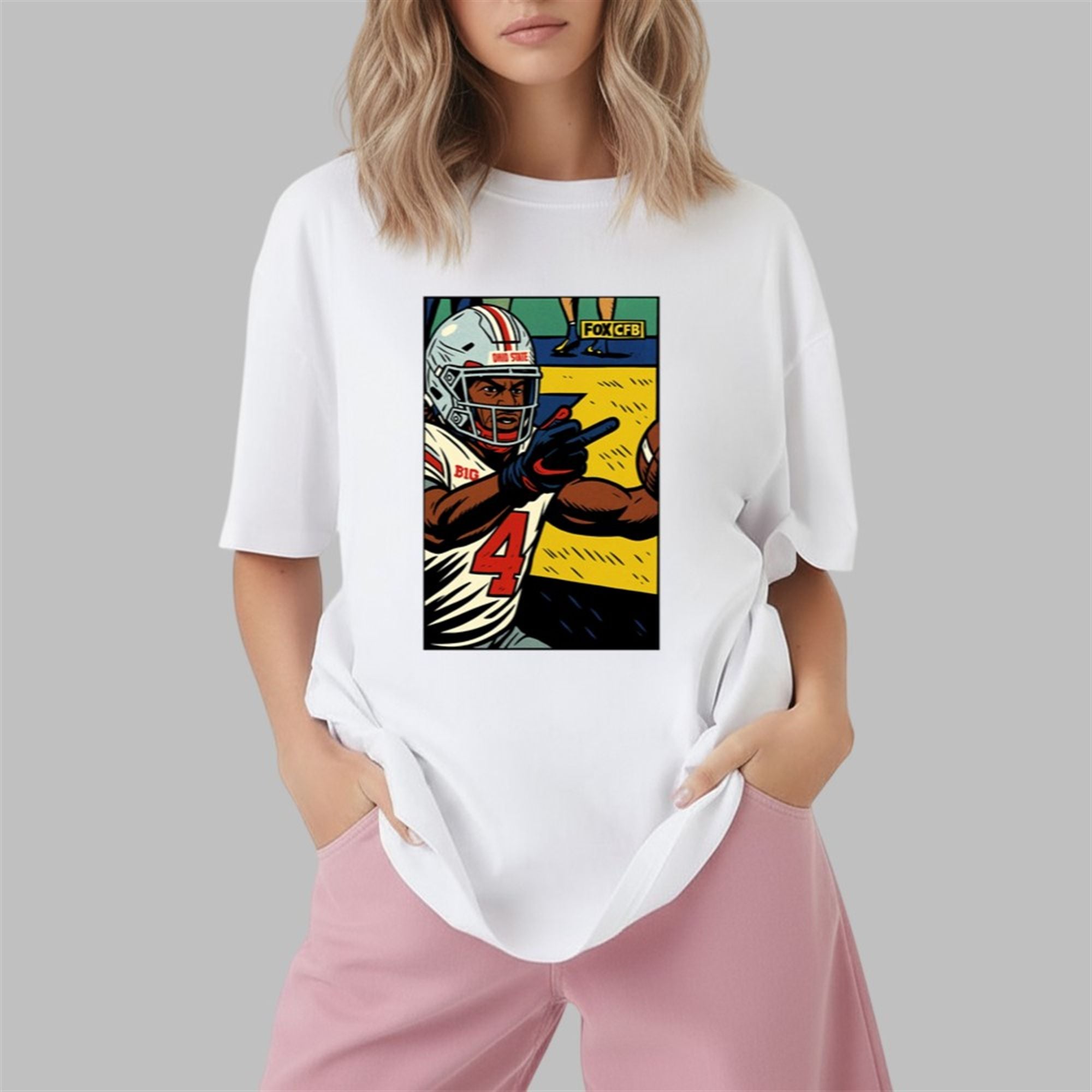 Perfect for the Buckeye fan who wants to relive the glory of The Game 2025, this tee features a bold, comic-book-style illustration of Smith in his signature #4 jersey, silencing the doubters and the “Big House” faithful. It’s more than just apparel; it’s a piece of rivalry history. Wear the moment that broke the streak and celebrate the return of the Gold Pants to where they belong.