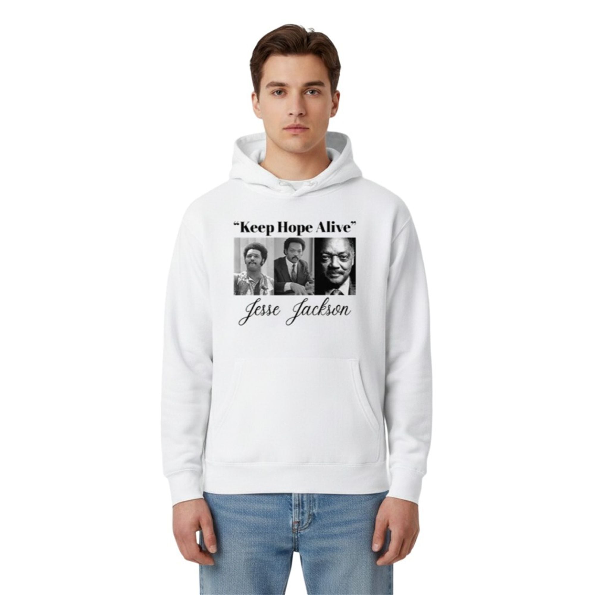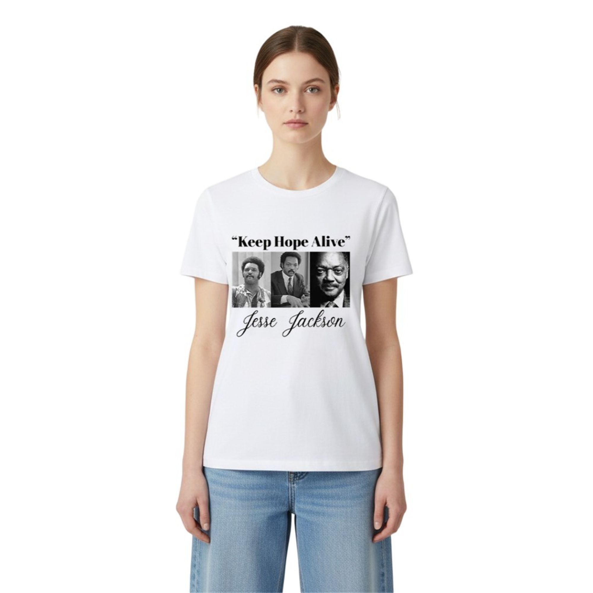 Above the striking portraits, the legendary phrase “Keep Hope Alive” is printed in bold, commanding typography. This slogan, famously delivered during his impassioned 1988 Democratic National Convention speech, remains a rallying cry for marginalized communities striving for a better future. Below the photographs, Jesse Jackson’s name is beautifully rendered in an elegant, flowing script, adding a touch of personal authenticity to the design. By blending historical photography with bold graphic text, this piece transcends standard graphic tees, offering a museum-worthy aesthetic that pays respect to a pivotal era in American history.