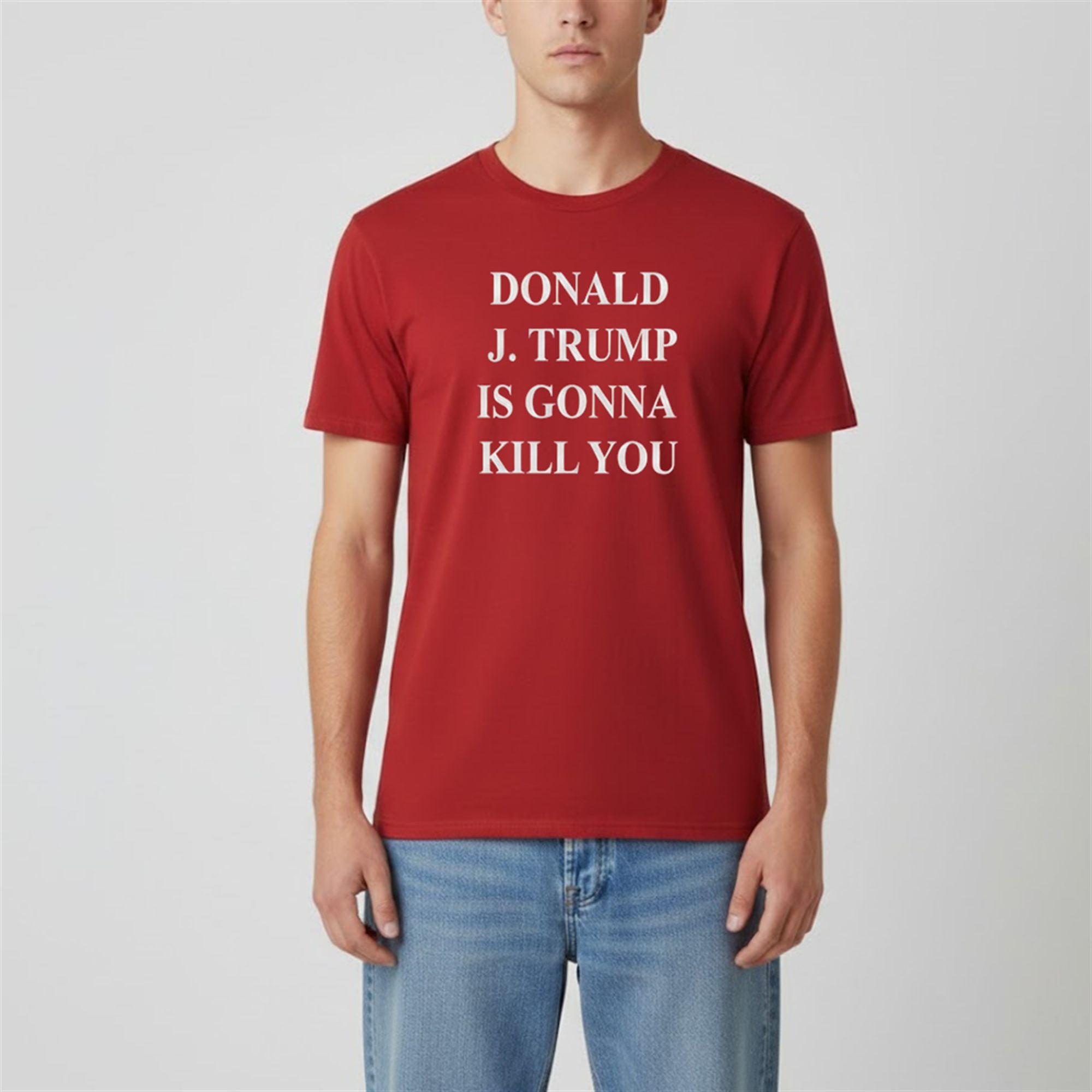 From a distance, the “Campaign Red” and white lettering look like standard support gear. Up close, the text “Donald Trump Is Gonna Kill You” delivers a shock value that guarantees a reaction. This “trojan horse” style of design makes it a powerful tool for social commentary.
