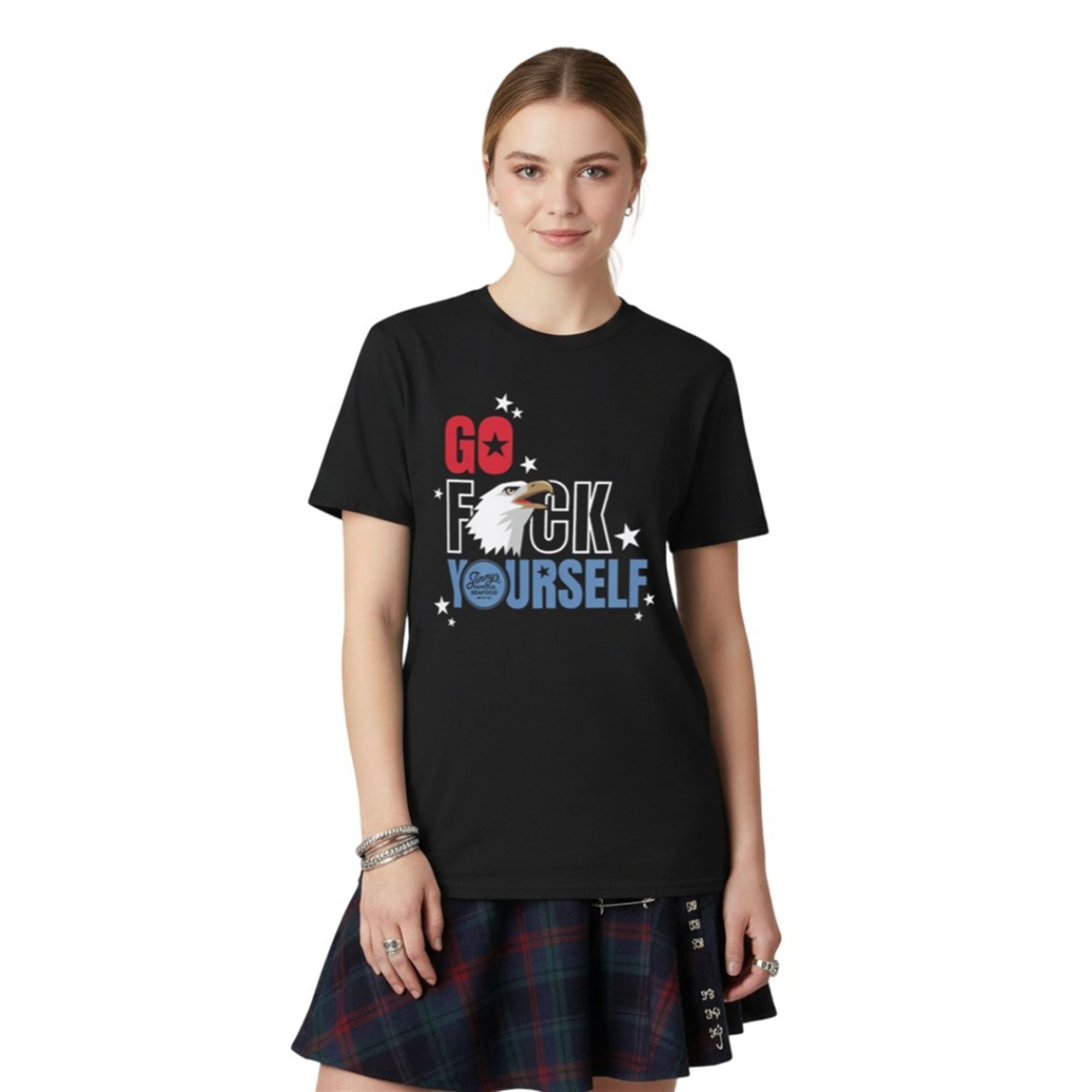 The design of the shirt is a masterclass in visual irony and bold typography. It features a striking, stacked text layout using a classic Americana color palette. The bright red “GO” sits atop the brilliant white “F[Eagle]CK,” where a screaming bald eagle head cleverly replaces the letter ‘U‘. Anchoring the design is the word “YOURSELF” in a cool, contrasting blue, seamlessly integrating the classic Jimmy’s Famous Seafood circular logo into the letter ‘O’.