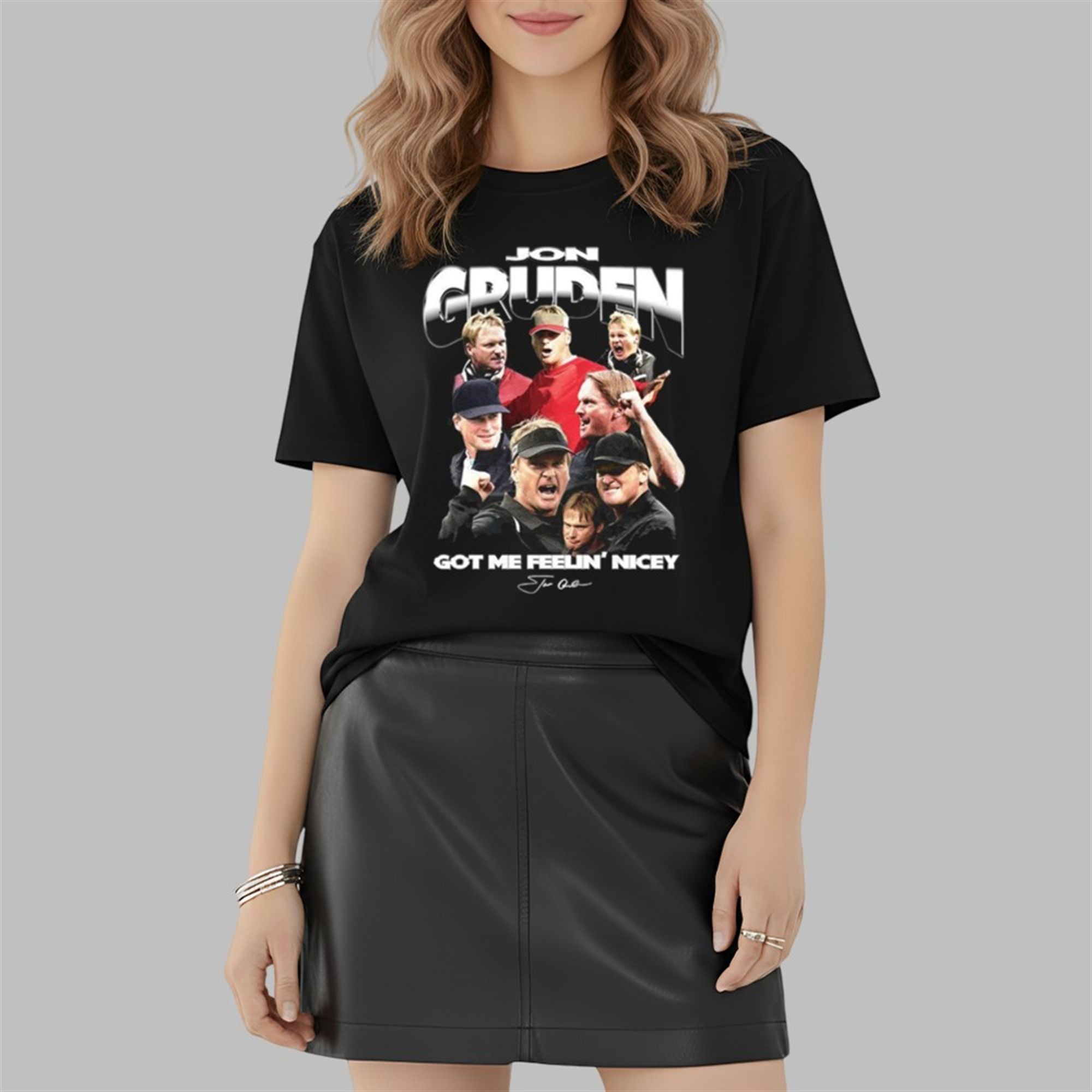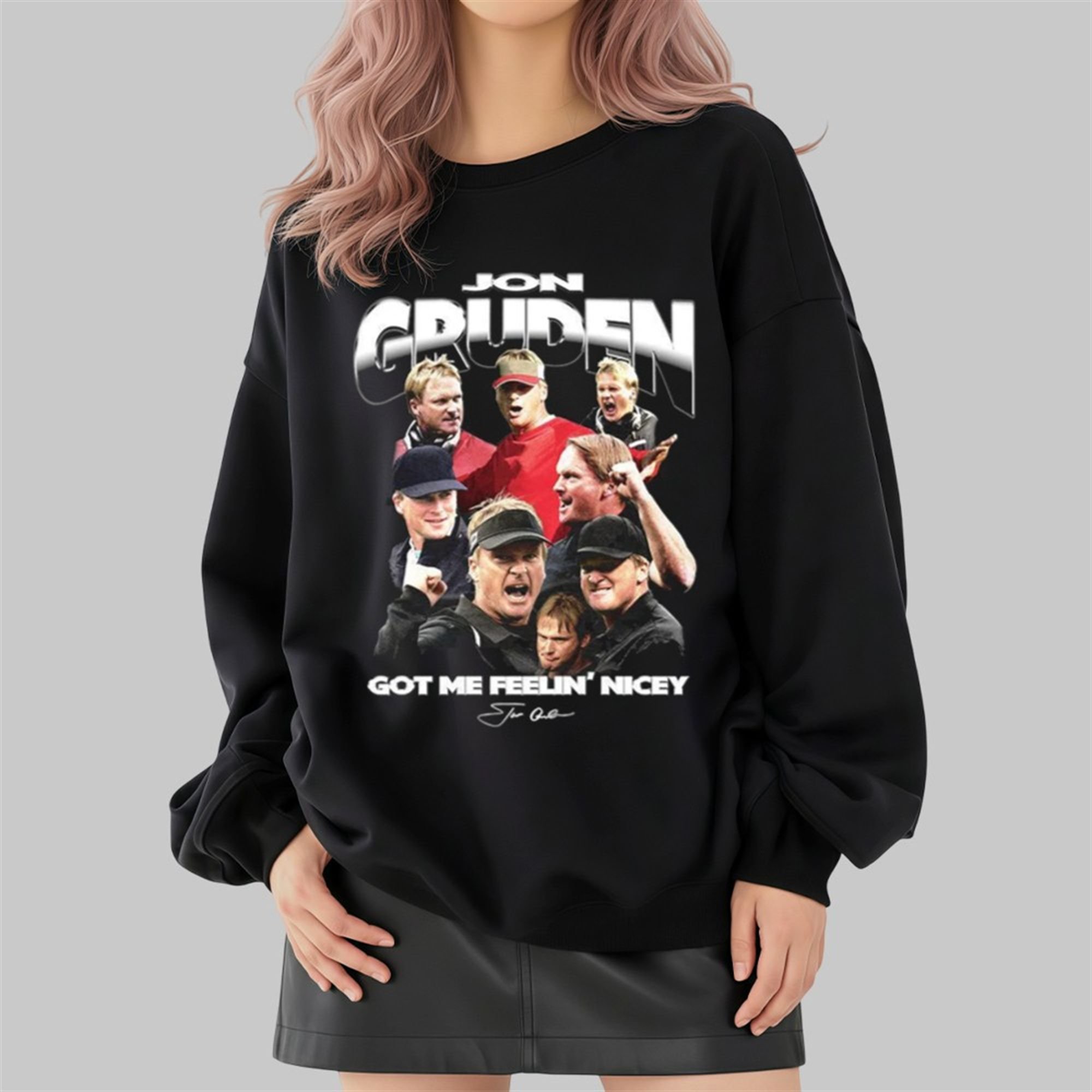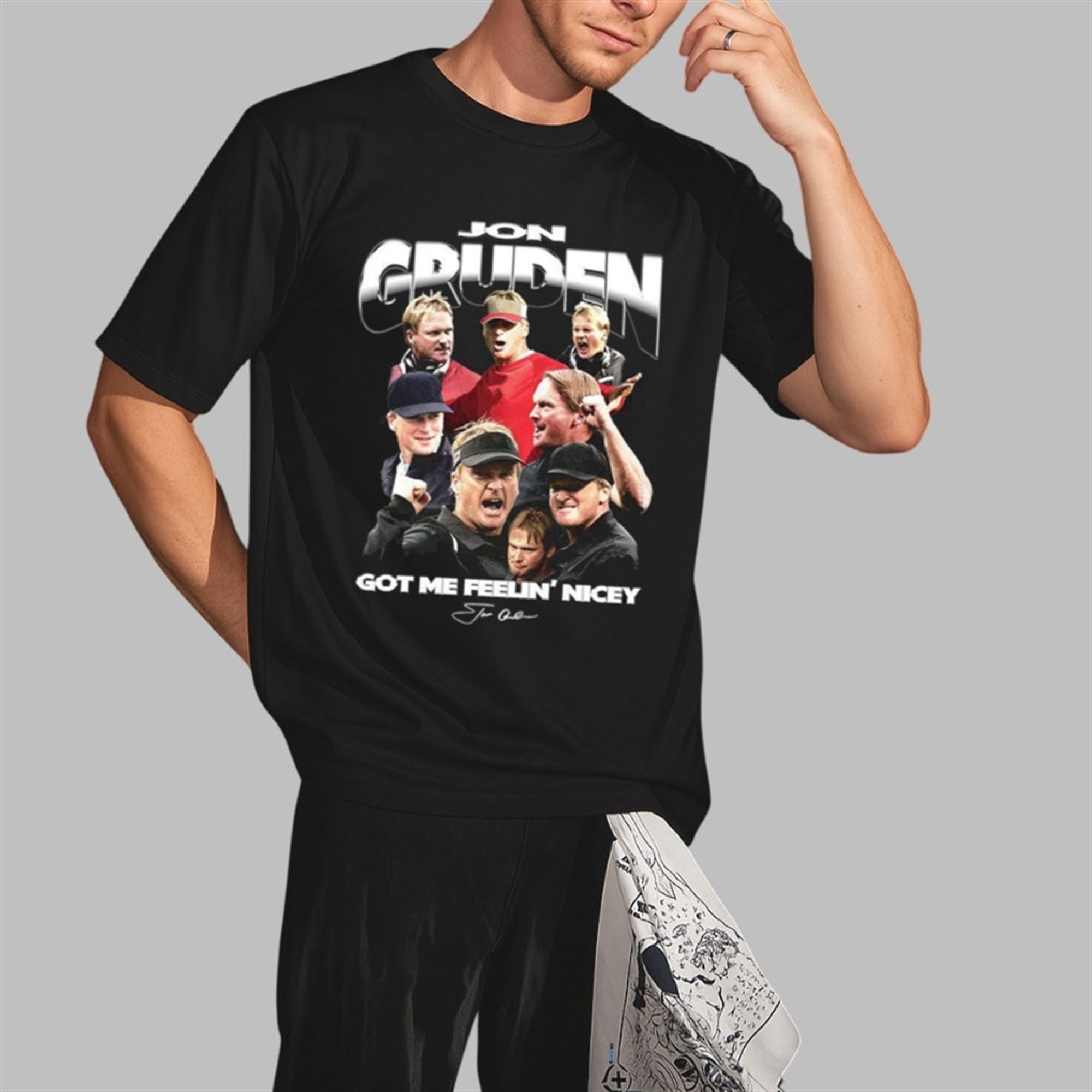 The design features a bold, oversized “JON GRUDEN” header in retro chrome lettering that pops against the classic black background. Below, a meticulously arranged collage showcases Gruden in his natural habitats: on the sideline, in the headset, and mid-shout. The centerpiece is the viral catchphrase “GOT ME FEELIN’ NICEY,” scrawled in a bold font that encapsulates the quirky, high-energy soundbites that have made Gruden a content king in the 2025 sports landscape.