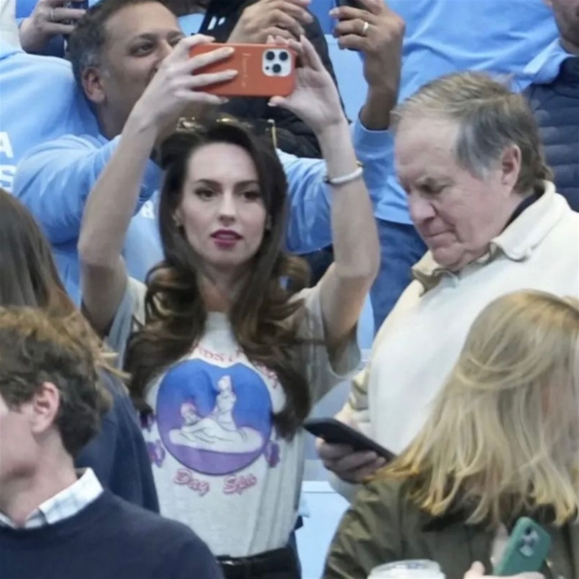 This specific shirt exploded across social media because of the sheer audacity of the messenger; having Bill Belichick’s younger girlfriend wear a shirt referencing his former boss’s most embarrassing scandal is seen as “4D chess” trolling. It shattered the public perception of the couple as serious or private, showing they are aware of the noise and willing to lean into the chaos. The image perfectly combined celebrity relationship intrigue with a callback to one of the wildest headlines, creating a perfect storm for engagement.