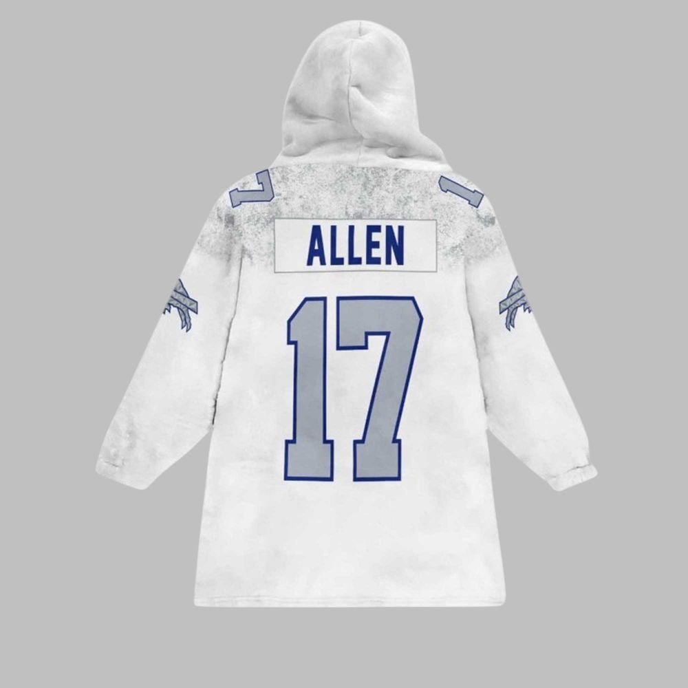 This wearable blanket is a true tribute to Buffalo’s star quarterback, Josh Allen. The design perfectly mirrors the Bills’ iconic away jersey, featuring “BUFFALO” emblazoned across the chest above a bold, screen-printed number “17”. The back proudly displays “ALLEN” and his number “17” in authentic team font, leaving no doubt about where your allegiance lies. The design is completed with Bills logos on the sleeves and distinctive jersey-style shoulder details, giving you that on-field look with off-field comfort. The large front kangaroo pocket is perfect for keeping your hands warm or stashing your phone and snacks, ensuring you’re fully equipped for hours of cheering.