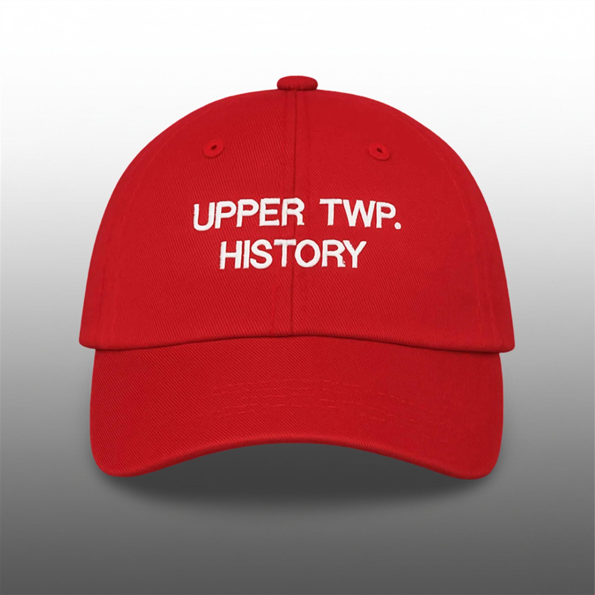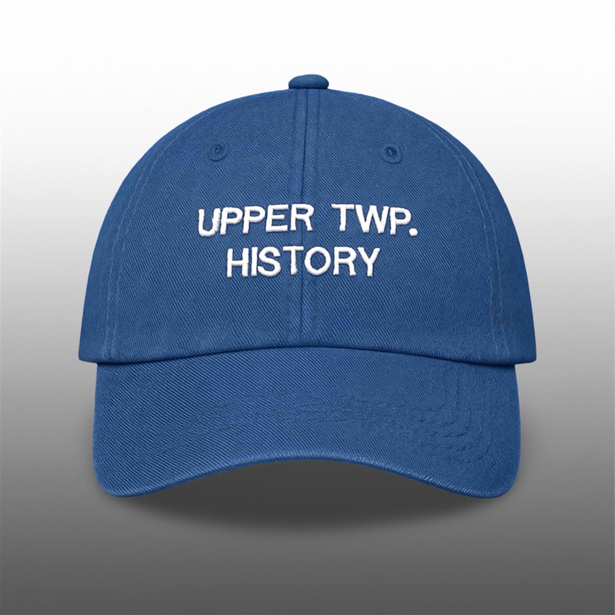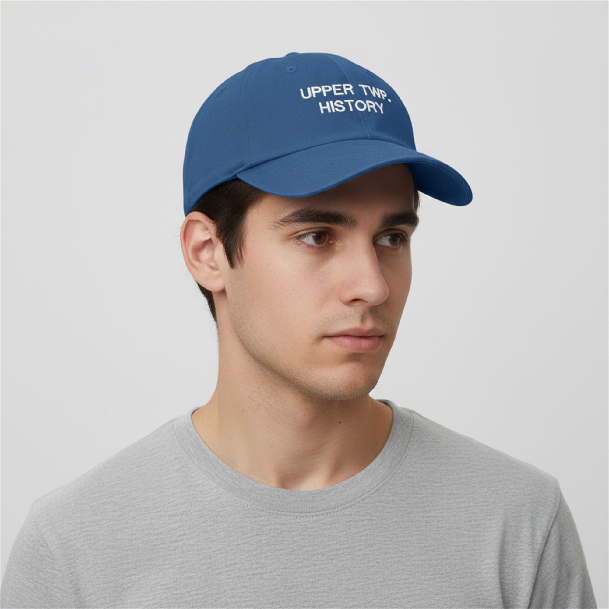 The hat features a classic unstructured “dad cap” silhouette in a rich royal blue, contrasting sharply with the stark white that reads “UPPER TWP. HISTORY.” Referring to the Historical Preservation Society of Upper Township, New Jersey, the design channels a distinct “vintage gift shop” energy that aligns perfectly with current trends favoring obscure, hyper-specific local merchandise. It is the antithesis of fast fashion—a piece that feels lived-in, authentic, and effortlessly cool.