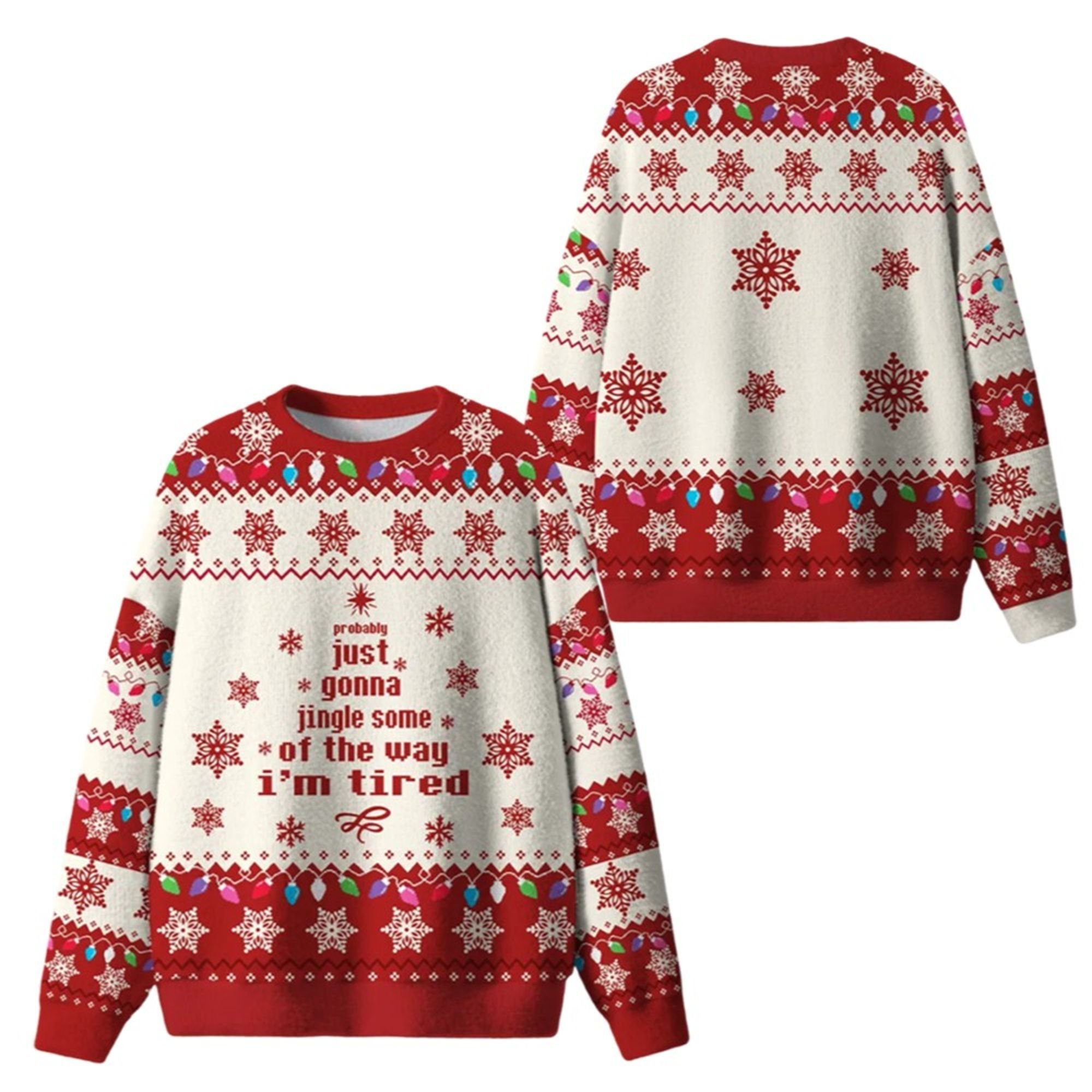 This isn’t just another holiday pullover; it’s a statement piece for a generation that understands the holiday hustle is real. Crafted with the perfect “ugly sweater” aesthetic, it features a classic red and cream-white knit-style pattern. The design is adorned with all the essentials: snowflakes, twinkling Christmas lights, and festive borders. But the real star, centered perfectly, is the mantra that defines a modern Christmas: “I’m just gonna jingle some of the way, I’m tired.” It’s the perfect blend of sarcastic humor and genuine seasonal style.