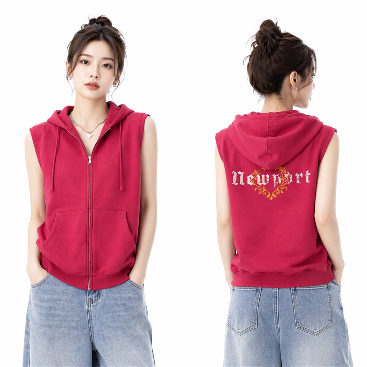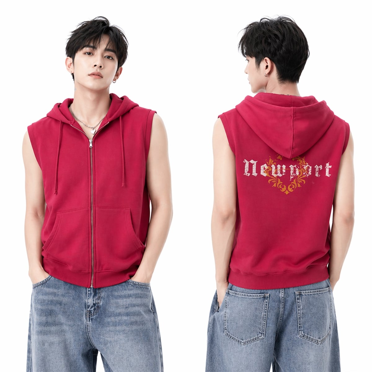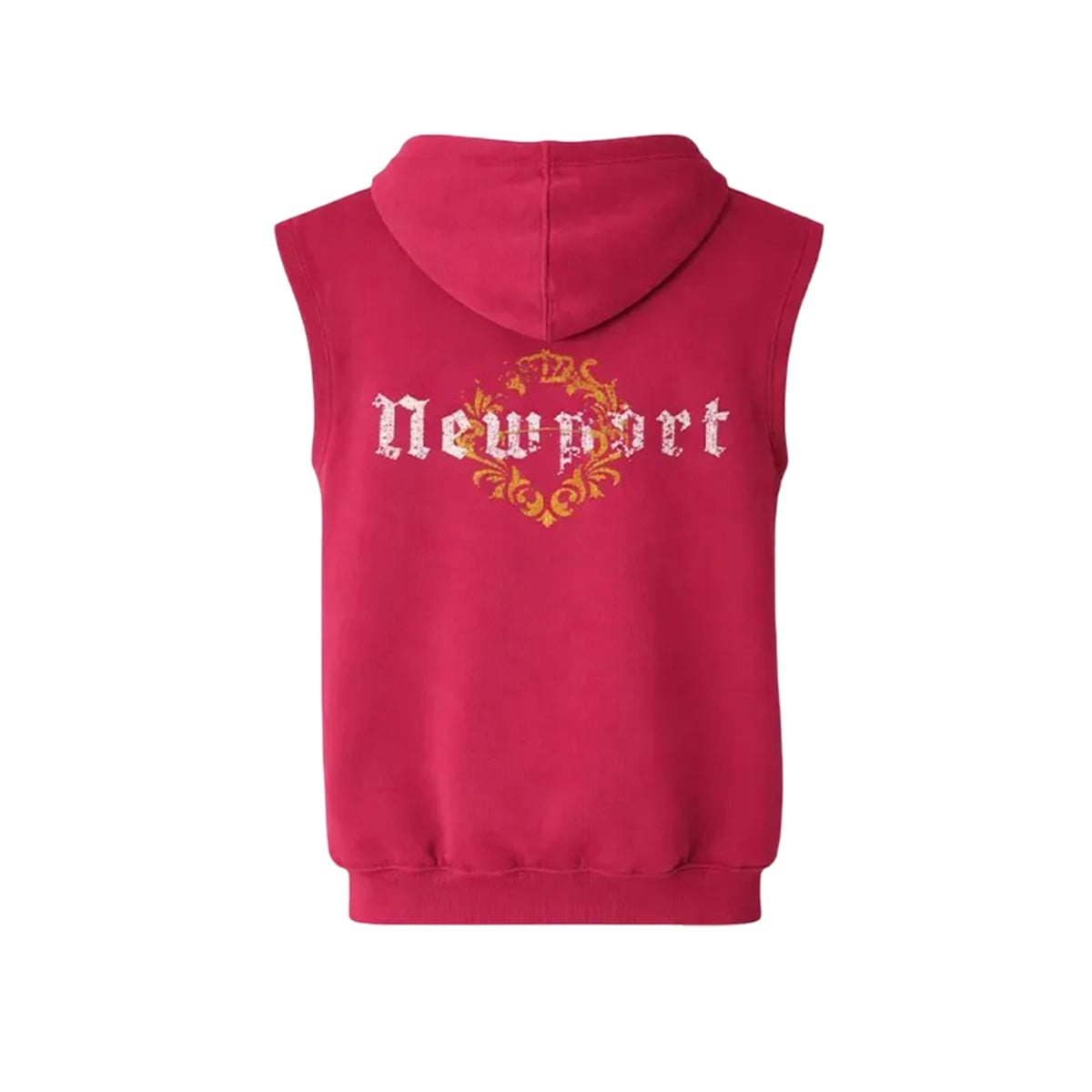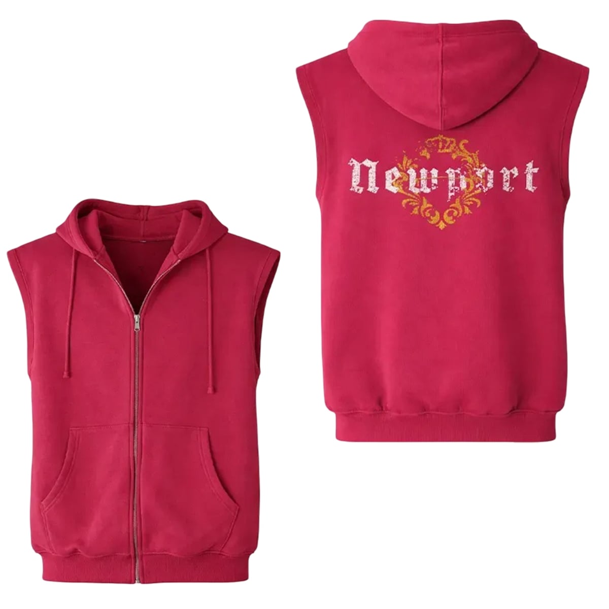 The hoodie is a masterstroke of contemporary casual wear, designed to mimic the exact aesthetic popularized by Justin Bieber’s highly publicized stage performances. The garment features a classic zip-up front, a spacious drawstring hood, and split kangaroo pockets, all anchored by a striking, vibrant crimson red colorway. The true focal point, however, lies on the back. It showcases a large, ornate golden crest overlaid with the word “Newport” in a heavily stylized, distressed Old English typography. The sleeveless cut offers a relaxed, athletic drape that modernizes the traditional hoodie silhouette, making it an essential addition to any fashion-forward closet.