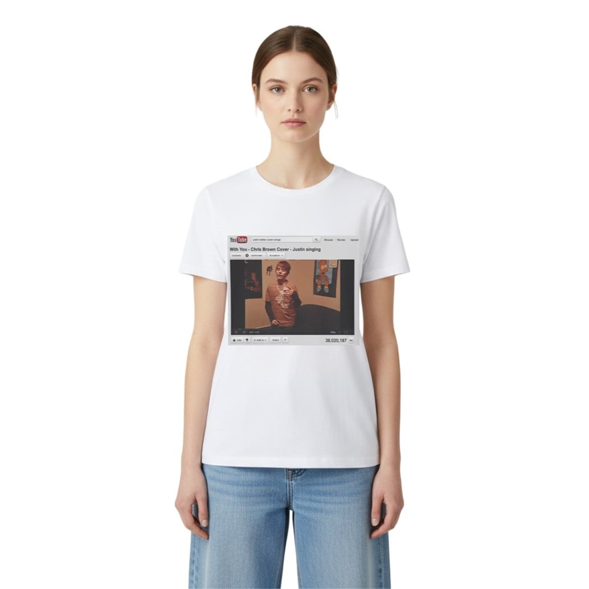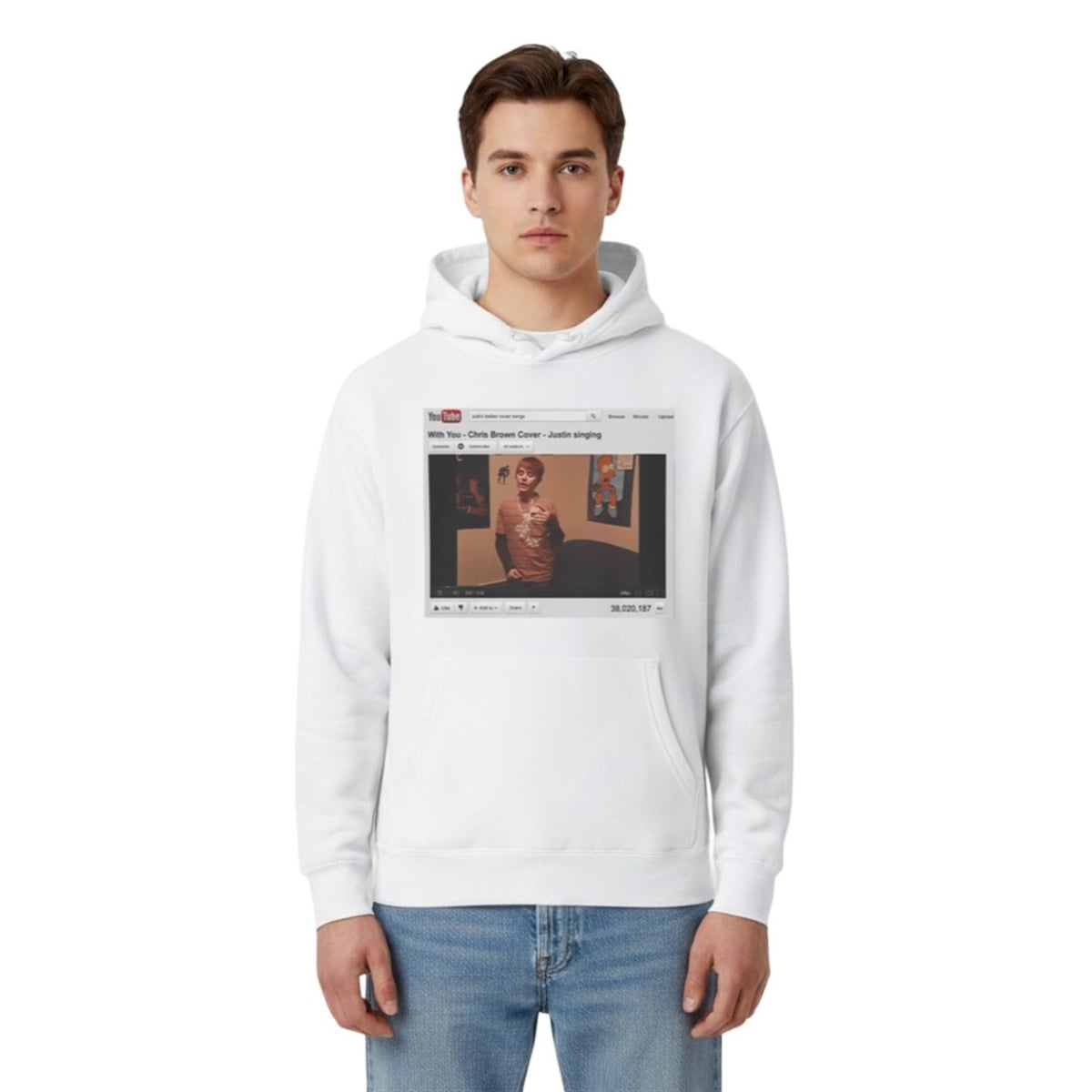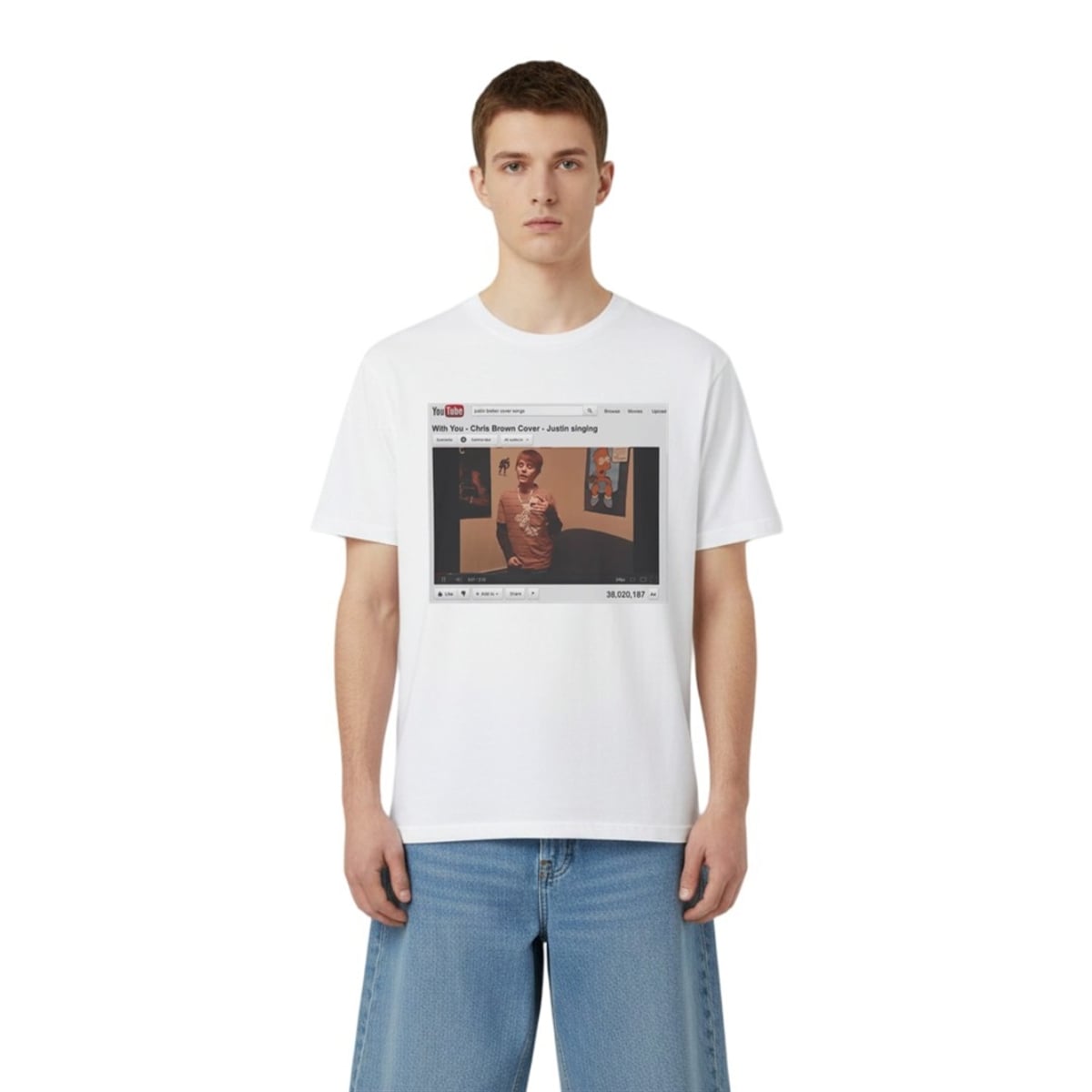 This visually striking graphic tee brings a legendary digital milestone into the physical world. The front graphic meticulously replicates the vintage YouTube layout, complete with the legacy search bar, the retro play buttons, and the mind-boggling view count that marked Bieber’s early ascent. At the center is the unforgettable still frame of a young Justin Bieber, capturing his signature early hairstyle and earnest expression as he performs. It is not just apparel; it is a visual time capsule. The design speaks volumes without saying a word, allowing you to showcase your appreciation for one of the most significant viral moments in modern music history.