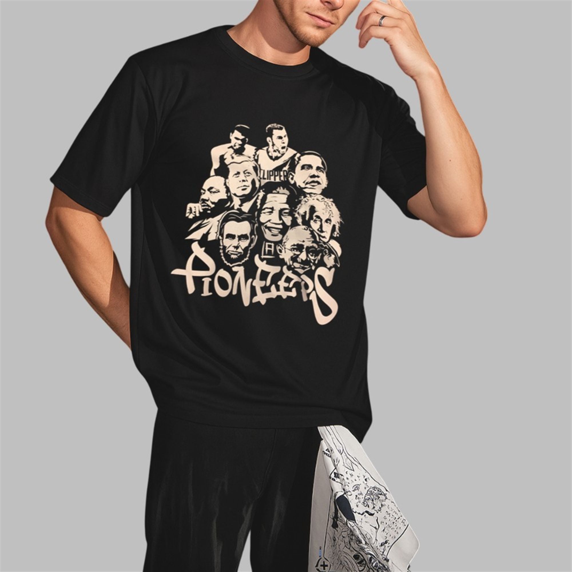 The PIONEERS Shirt is not just merchandise; it is a collage of greatness. The design centers on a high-contrast, monochromatic graphic printed on a black heavyweight cotton tee. The artwork utilizes a “vintage bootleg” aesthetic—a design trend that remains dominant in late 2025—which mimics the nostalgic feel of 1990s rap and sports memorabilia.