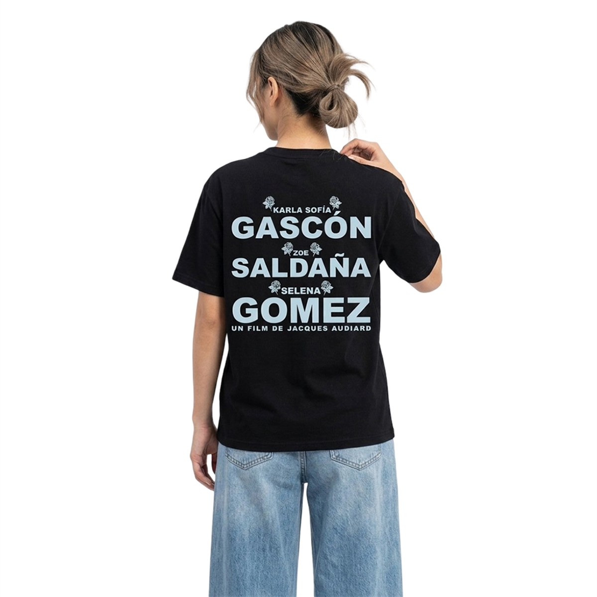The shirt is a striking piece of statement apparel that pays homage to one of the most culturally significant films of the decade. The design features a bold, stacked typographic layout, prominently displaying the names of the three lead actresses in a crisp, eye-catching font. Nestled alongside each name is a delicate rose graphic, adding a layer of symbolic depth to the stark text. Anchoring the design at the bottom is the cinematic stamp: “UN FILM DE JACQUES AUDIARD.” This layout mimics the aesthetic of classic international film posters and festival billing, transforming the wearer into a walking billboard for artistic cinema. It is a visual celebration of female empowerment, complex storytelling, and the magic of the movies, stripped down to its most recognizable and impactful elements.
