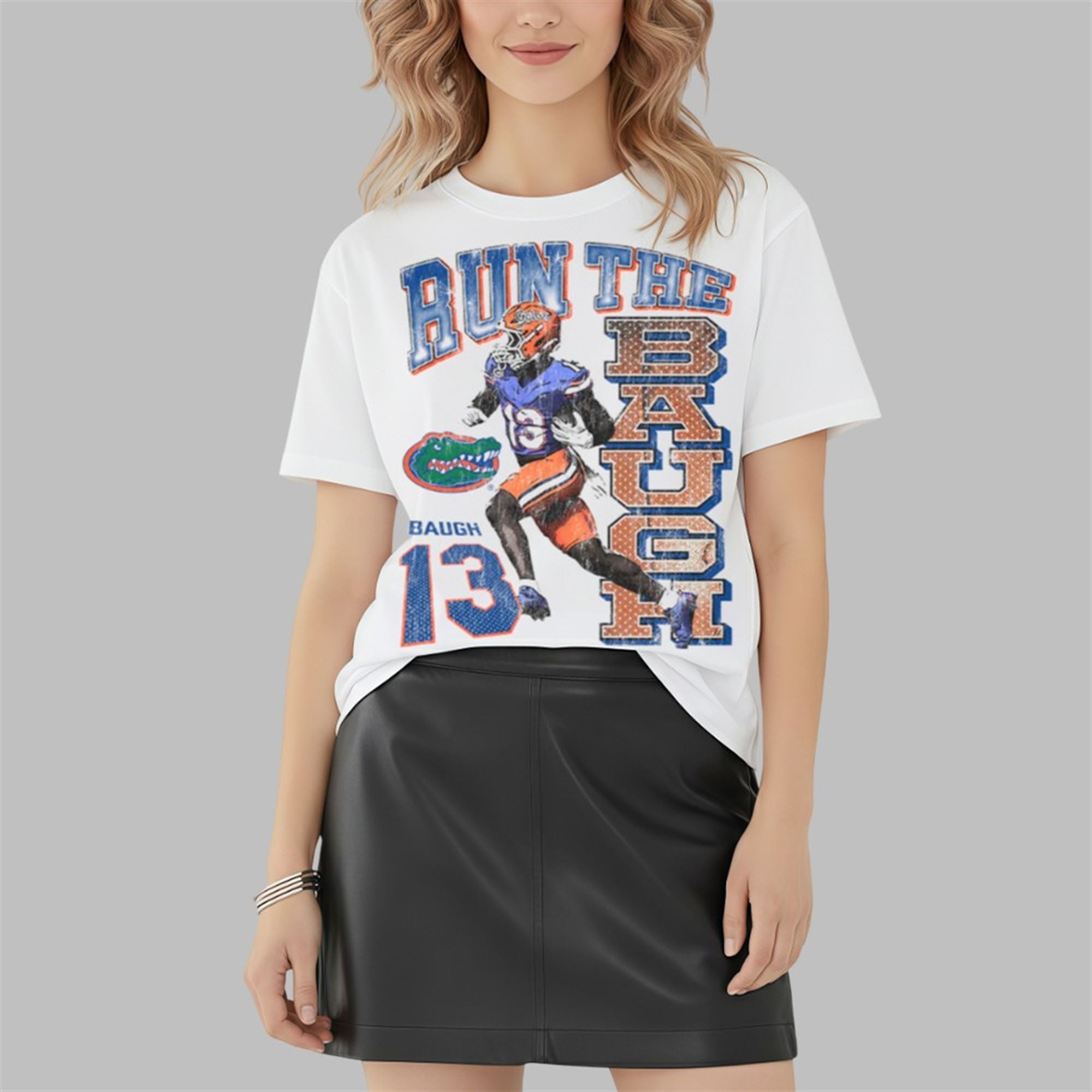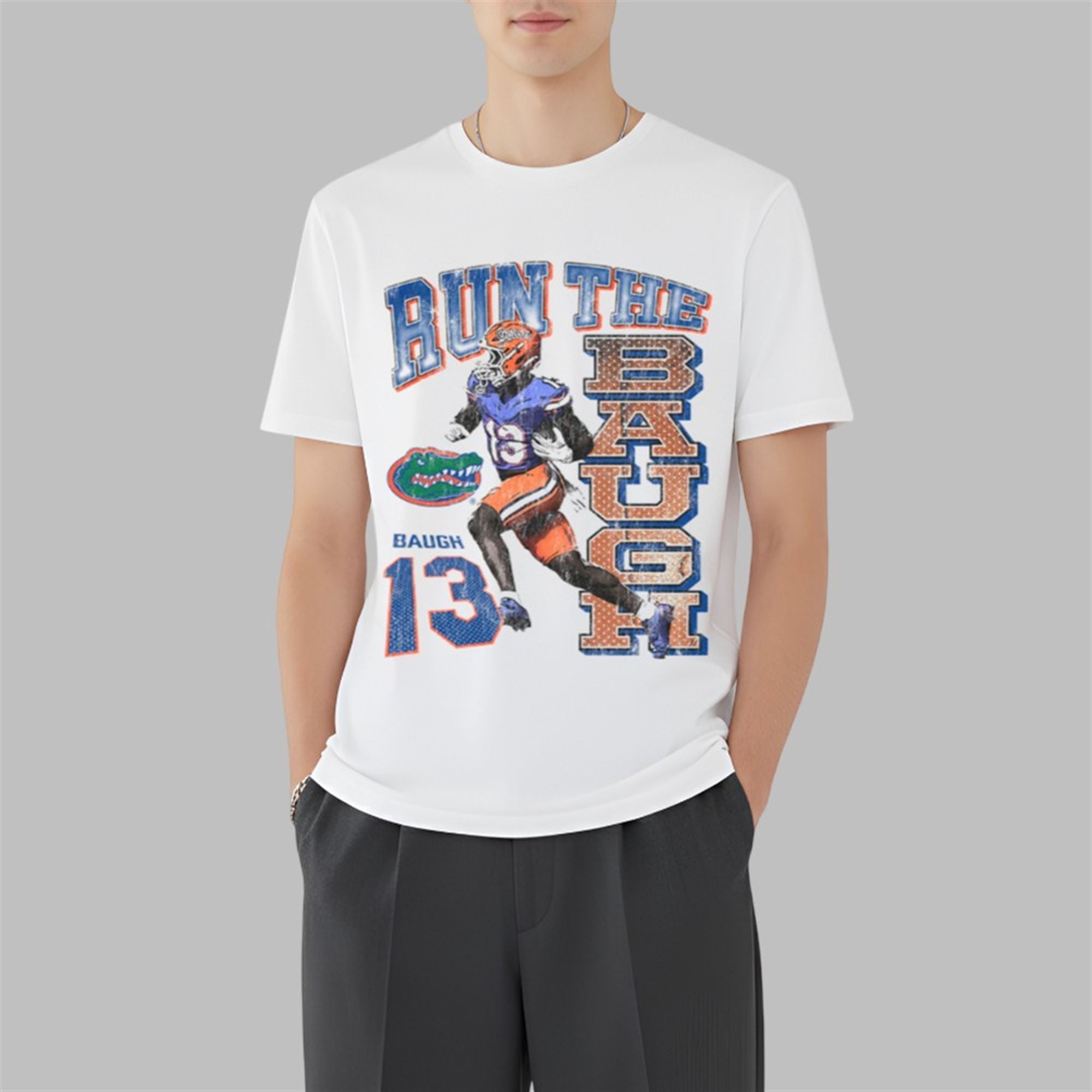 The design features a striking, retro-style graphic of Jadan Baugh (#13) in action, tearing through the defense in the classic blue and orange. The slogan “RUN THE BAUGH” is emblazoned across the front in a bold, vertical and horizontal layout, mimicking the popular “90s rap tee” aesthetic that dominates current streetwear trends. With “BAUGH 13” and the iconic Gator head logo seamlessly integrated into the distressed print, this shirt captures the grit and glory of Florida football.