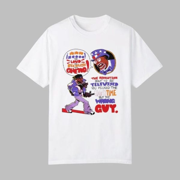 This Kendrick Lamar Too Loud Too Reckless Too Ghetto Shirt isn’t just a t-shirt; it’s a statement. The design showcases Kendrick in a dynamic pose. The bold colors and cartoon style perfectly reflect the energy and message of his music, celebrating themes of resilience, social justice, and self-belief. The use of speech bubbles that include the phrase “Too Loud Too Reckless Too Ghetto, CHERO!” The shirt says, “Our reputation bout to be, Televised, You picked the, Wrong Time, Be the, Wrong, Guy”.