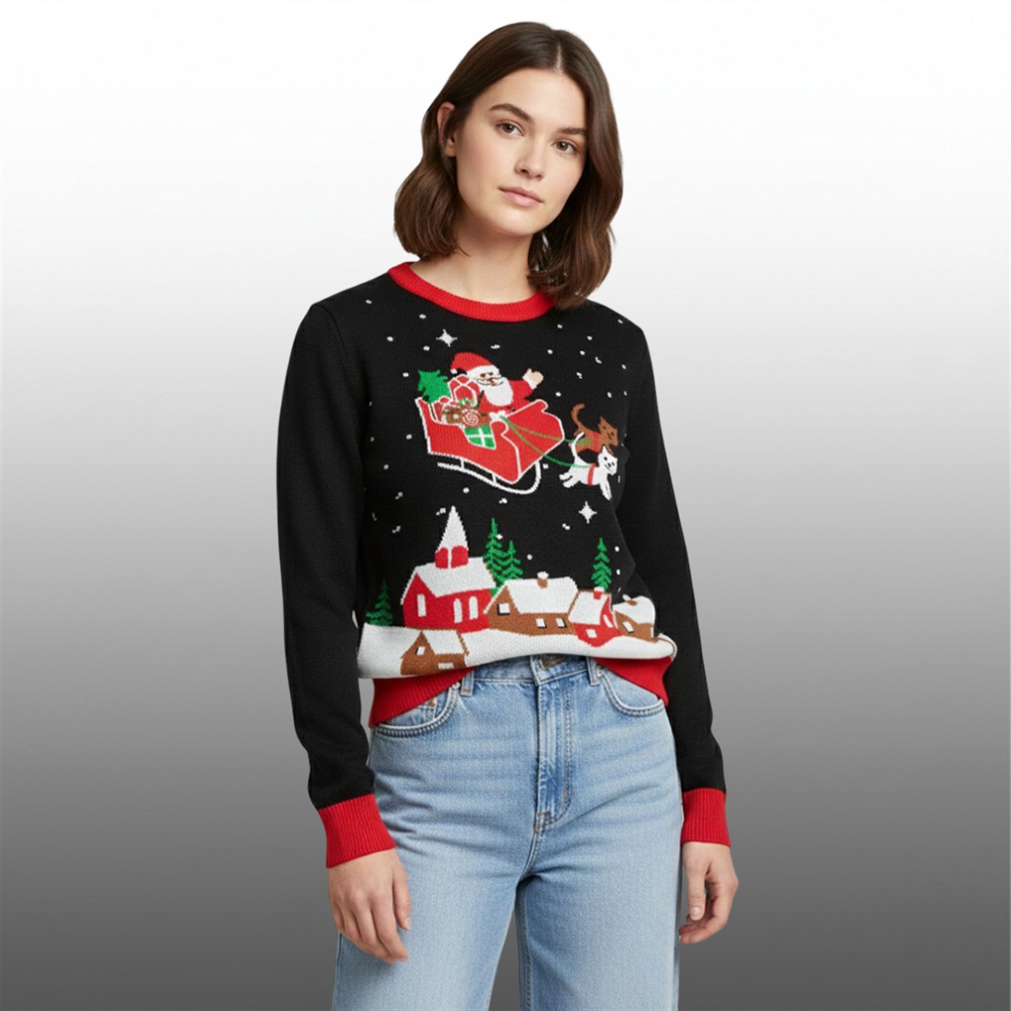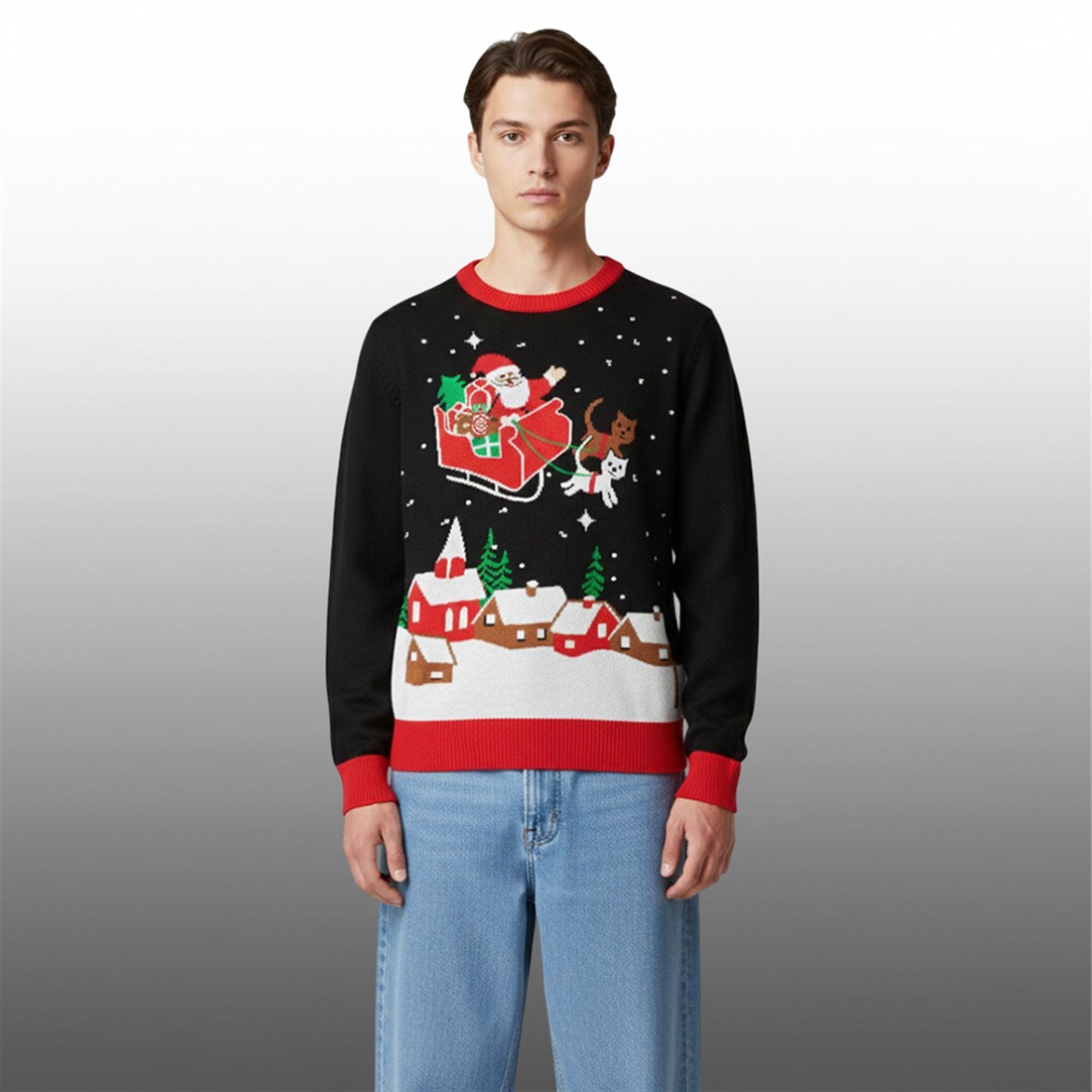 When it comes to holiday fashion, standing out is key. The Meowy Christmas Sleigh Sweater offers a hilarious departure from standard holiday motifs. Set against a deep midnight-black background, the vibrant knit graphic depicts a snowy Christmas Eve scene with a twist: Santa Claus is zipping over a quaint winter village, but his sleigh isn’t pulled by Dasher or Dancer. Instead, a team of spirited cats leads the way! This witty design resonates instantly with pet owners and anyone with a sense of humor, ensuring you win “Best Dressed” at any Ugly Christmas Sweater party.
