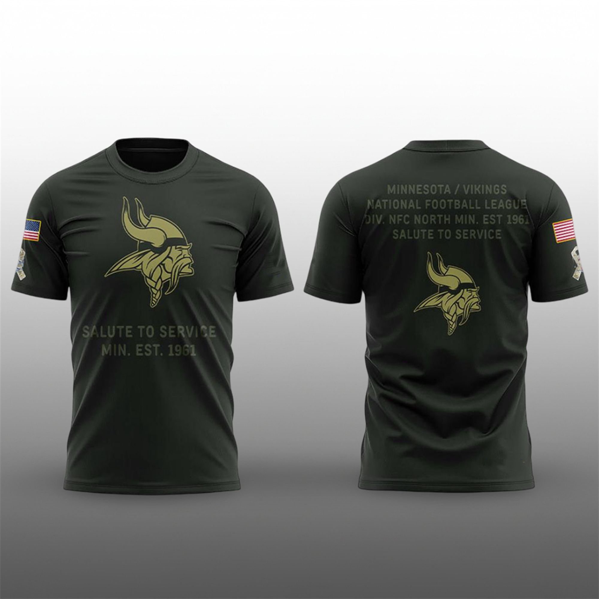 Full Back Graphic: Unlike simpler designs, this hoodie features a full text graphic on the back, identifying the team and its heritage: “MINNESOTA / VIKINGS,” “NATIONAL FOOTBALL,” “DIV. NFC NORTH MIN. EST 1961,” and “SALUTE TO SERVICE.”