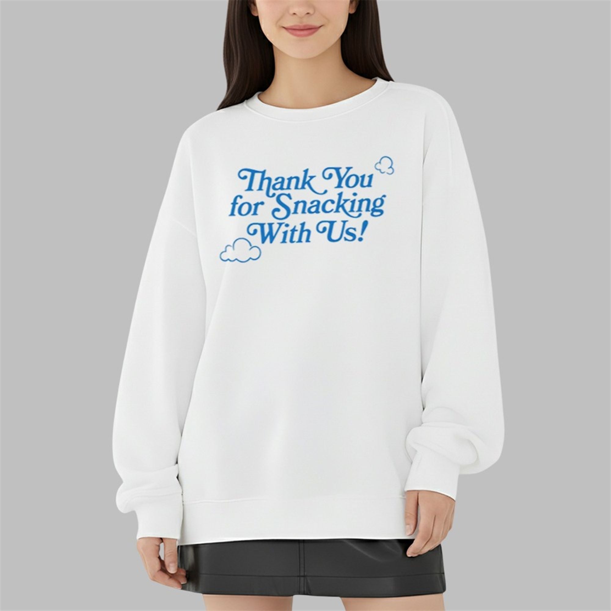 Featuring a crisp white base with a nostalgic, diner-inspired blue font “Thank You for Snacking With Us” and whimsical cloud accents, this shirt perfectly embodies the “snack queen” aesthetic Khloe has championed in late 2025. Whether you’re binge-watching The Kardashians, grabbing a bag of protein popcorn, or just looking for a conversation-starting graphic tee, this piece delivers effortless Calabasas cool. It’s not just merchandise; it’s a mood—celebrating self-care, good snacks, and unapologetic indulgence.