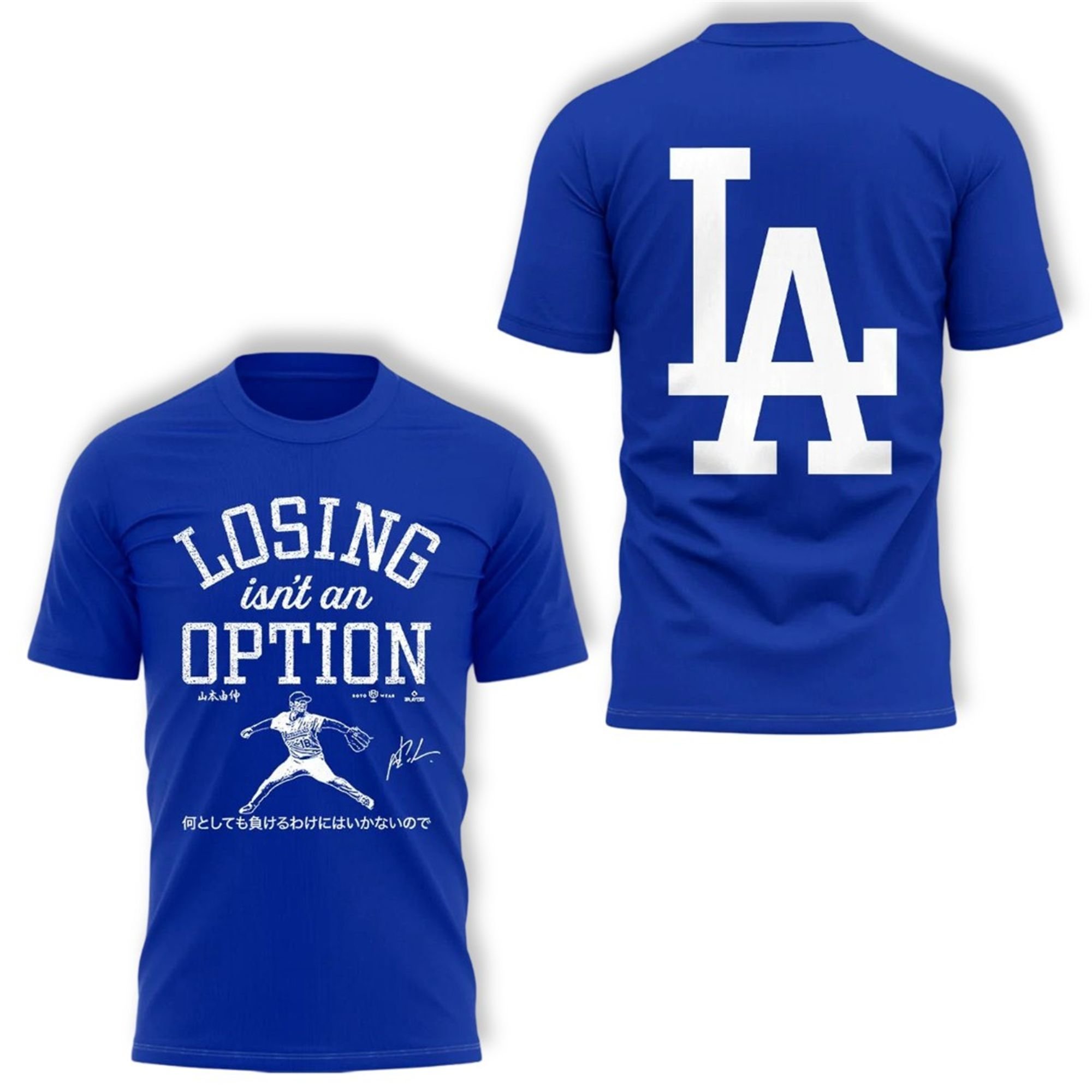 When ace Yoshinobu Yamamoto stood before the media during the high-stakes NLDS, he laid down the gauntlet. His iconic phrase, “何としても負けるわけにはいかないので” (Nantoshitemo makeru wake ni wa ikanai node), instantly translated into the powerful English declaration that headlines this shirt: “LOSING isn’t an OPTION.” It’s a quote that defined his dominant performance and became the slogan for the Dodgers’ entire 2025 World Series campaign.