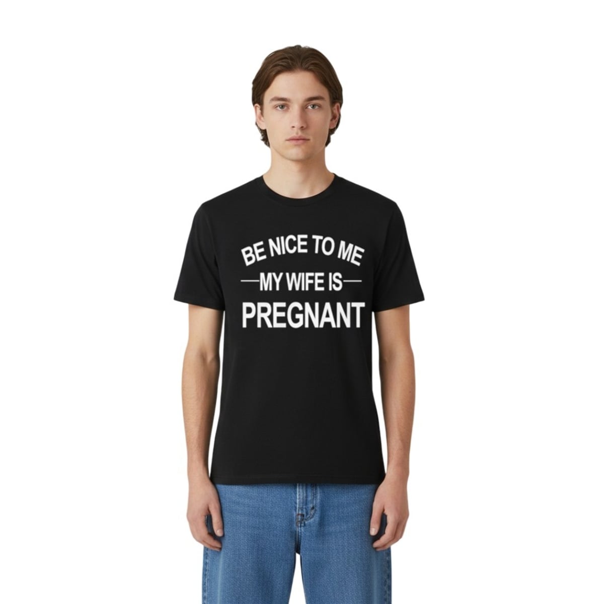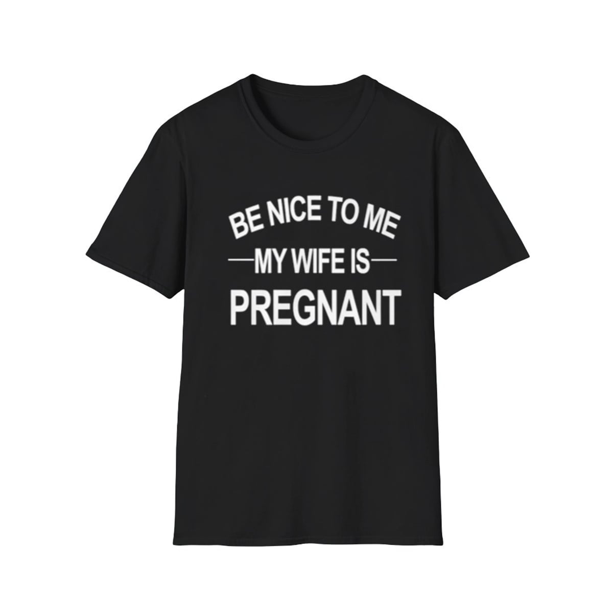 The shirt features the phrase “BE NICE TO ME — MY WIFE IS — PREGNANT” in stark, easy-to-read lettering. It is a walking billboard of comedic relief designed specifically for the modern expectant father. By wearing this, you are instantly communicating your current life status to the world, inviting sympathetic nods from fellow parents and laughs from friends. It is a celebration of the unique dynamic between expecting partners, perfectly capturing the supportive—and sometimes frantic—role of the dad-to-be.