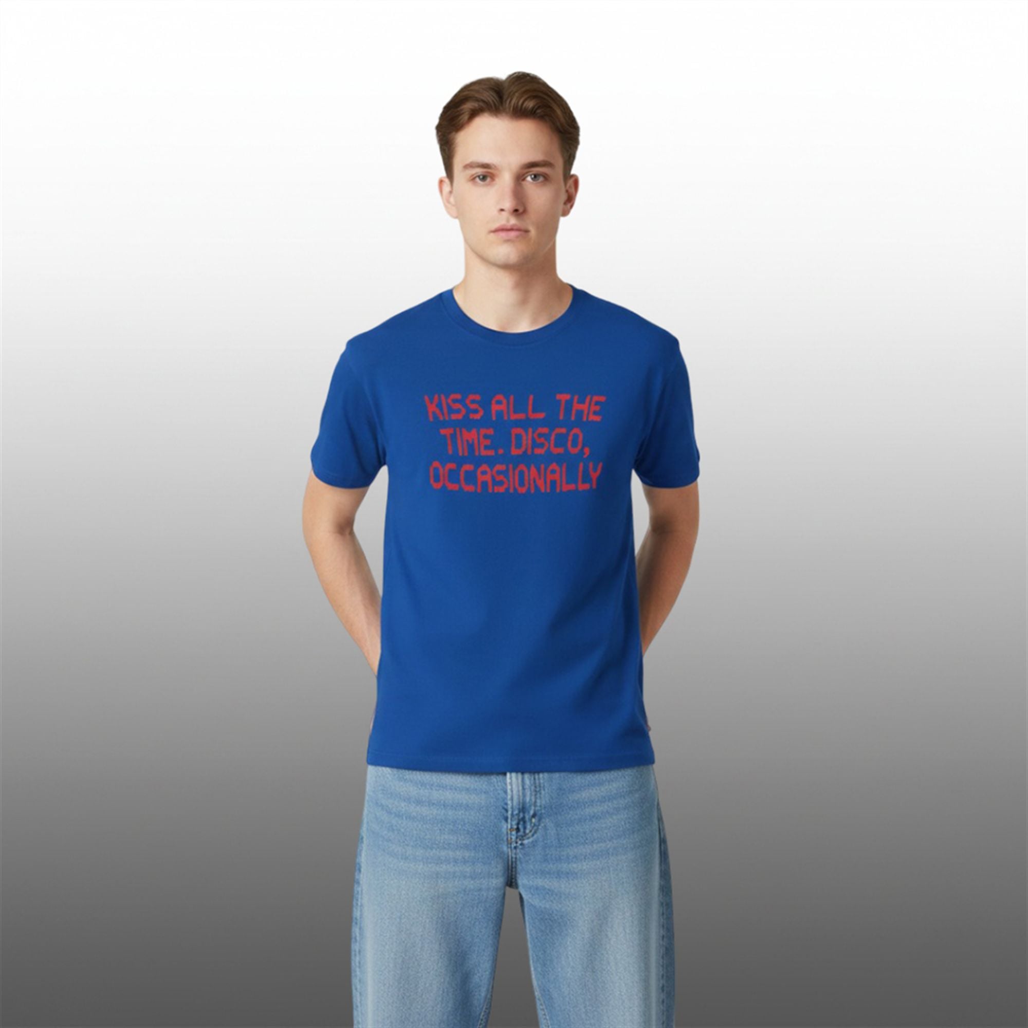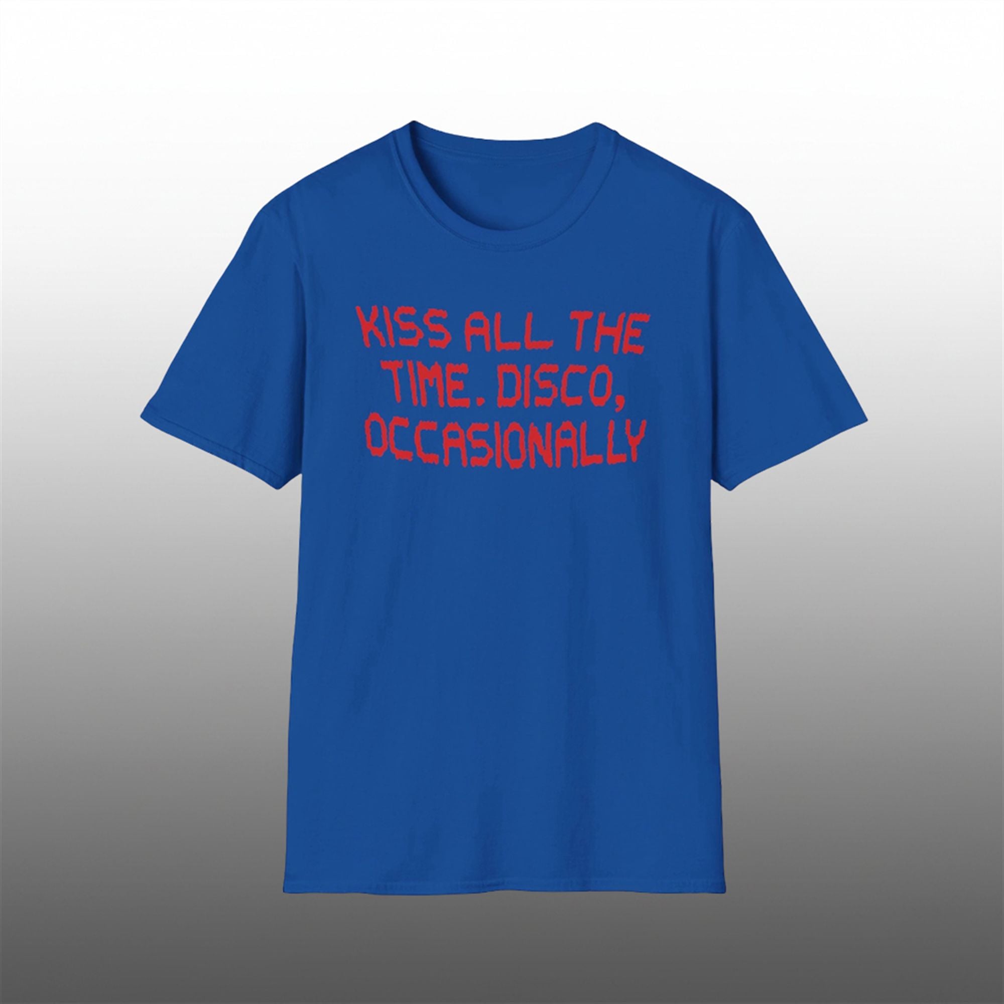 The shirt is designed for the individual who wears their heart on their sleeve—quite literally. In an era where fashion is increasingly used to signal personal values and humor, this shirt cuts through the noise with a slogan that is both charming and cheeky. The design features a handwritten-style font in a striking red hue, which pops aggressively against the cool blue base. This color theory isn’t just aesthetic; it mirrors the energy of the text—passionate red for “Kissing” and cool, electric blue for “Disco.” It is a visual representation of a balanced life.