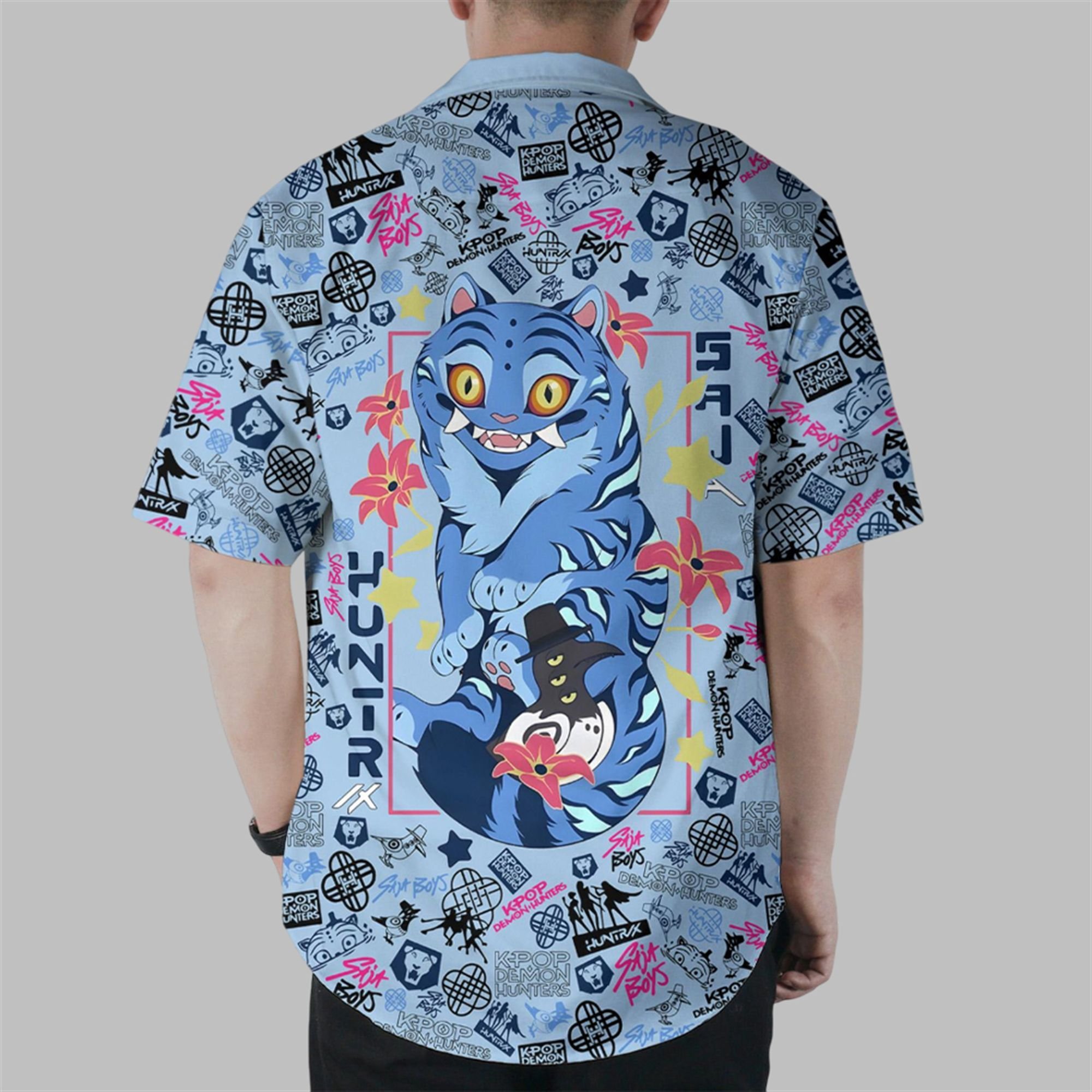Unleash your inner fan and embrace a style that’s loud, proud, and unapologetically fun with the Kpop Huntrix Saja Boys Derpy Tiger Hawaiian Shirt. This ensemble is more than just clothing—it’s a tribute to the electrifying world of the Saja Boys, designed for those who live and breathe K-pop. Every inch of this set is bursting with energy, featuring a custom all-over print that seamlessly blends iconic Saja Boys silhouettes, graffiti-style logos, and abstract patterns on a cool, light blue background.