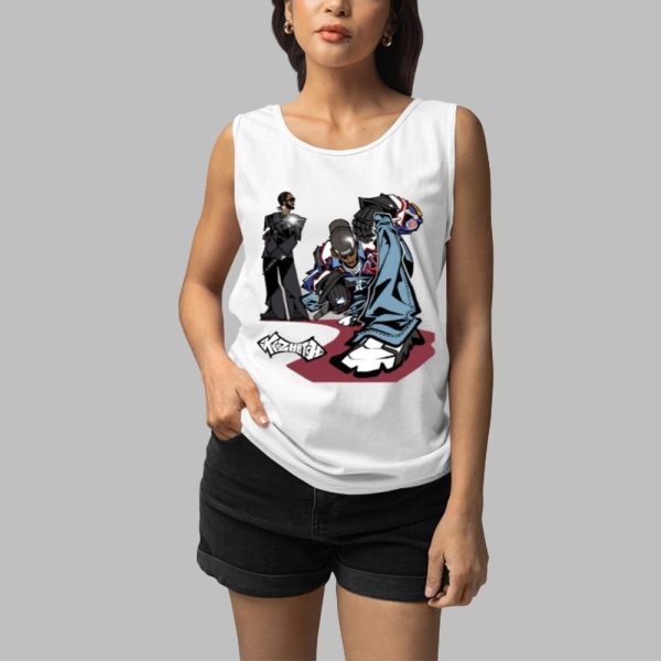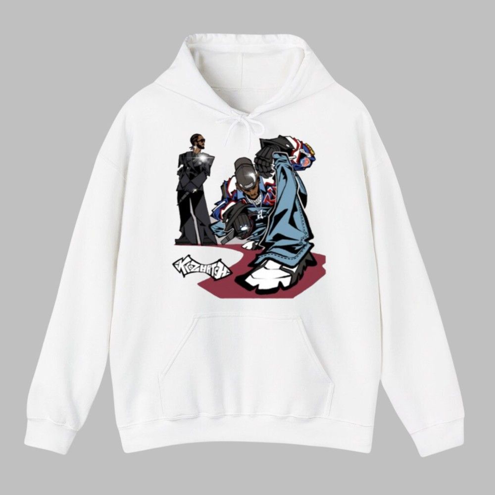This Krozhatch Kendrick Lamar Hey Drake Shirt features a striking, full-color graphic print that immediately draws the eye. The artwork depicts three figures in a dynamic, almost comic-book style. The detail, it displays silhouetted figures with the main, center focus being a character kneeling, appearing to adjust oversized, futuristic footwear, is reminiscent of Kendrick Lamar. The other poses, and the logo, add to that vibe.