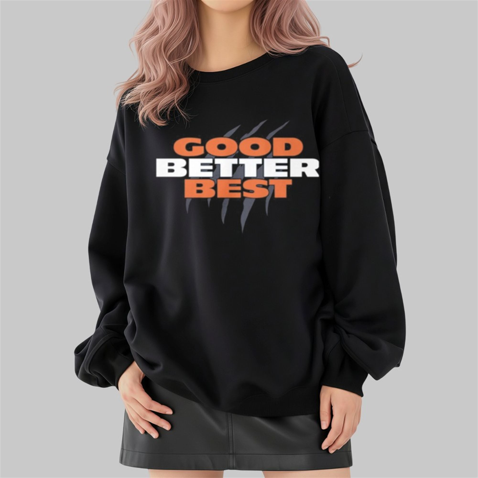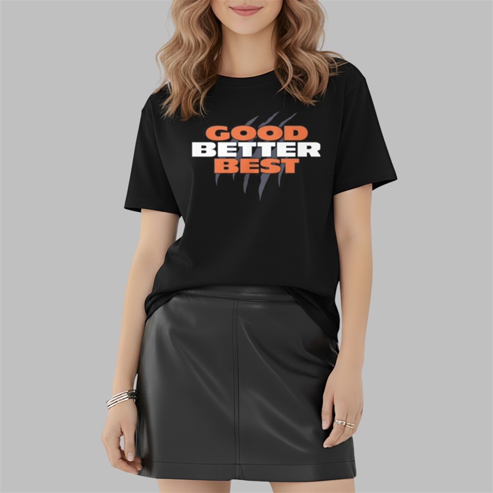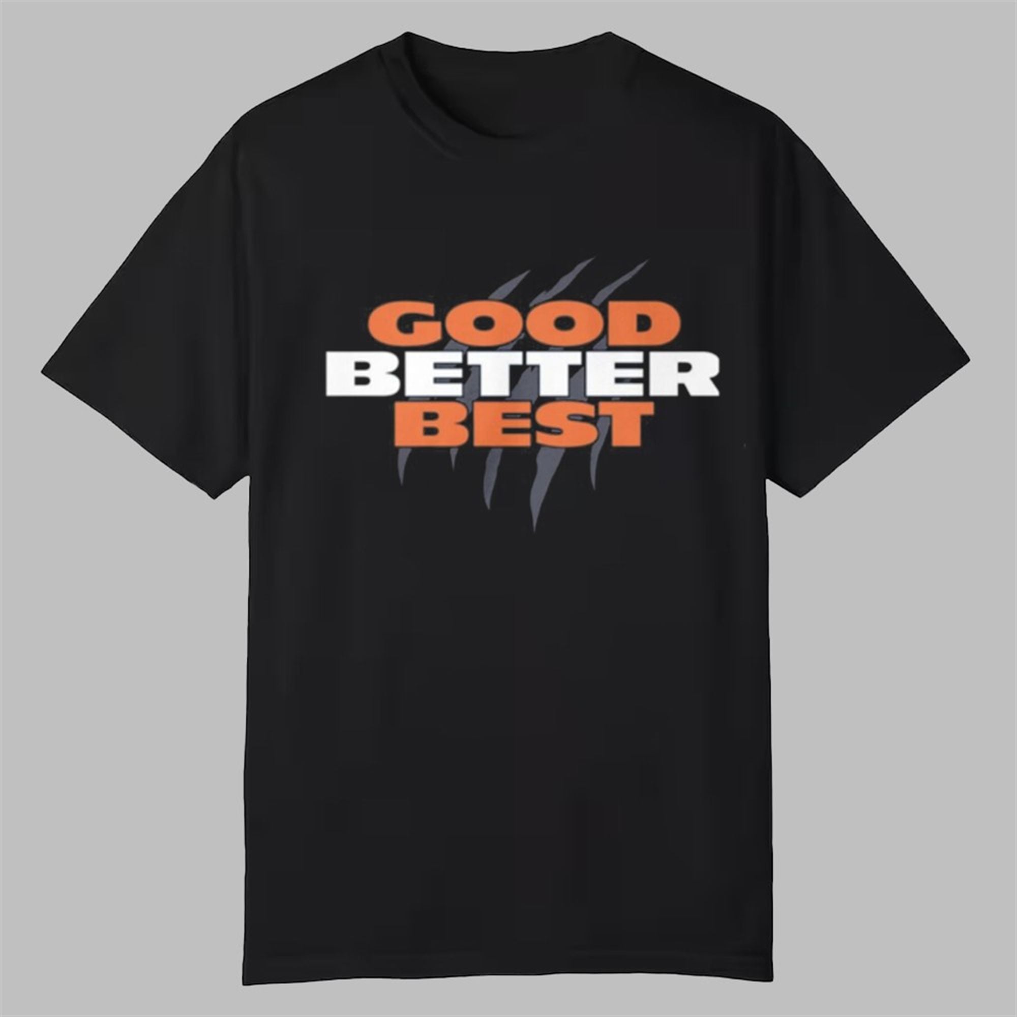 The shirt features the iconic locker room mantra—”GOOD, BETTER, BEST“—boldly stacked in the team’s signature orange and white typography. The text is set against a backdrop of fierce, jagged claw marks, symbolizing the reawakened aggression of the “Monsters of the Midway.” Whether you’re tailgating in the South Lot or catching the latest Angry Runs segment, this tee serves as a badge of honor for fans who believed in the rebuild.