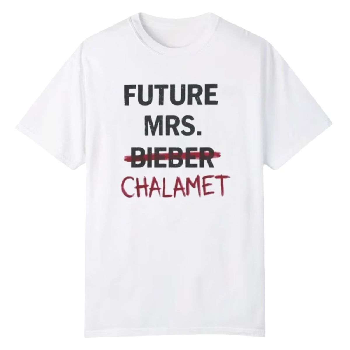 The shirt is more than just apparel; it is a wearable piece of internet history. This visually striking top features bold, capitalized black text reading “FUTURE MRS. BIEBER.” However, the word “BIEBER” is aggressively crossed out with a striking red line, and the name “CHALAMET” is written directly underneath in a contrasting, rebellious red, hand-painted style font.
