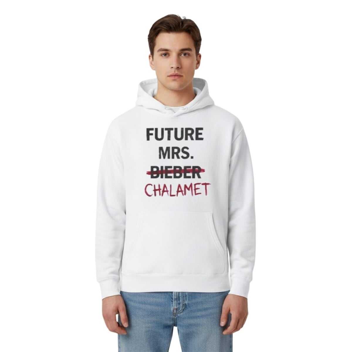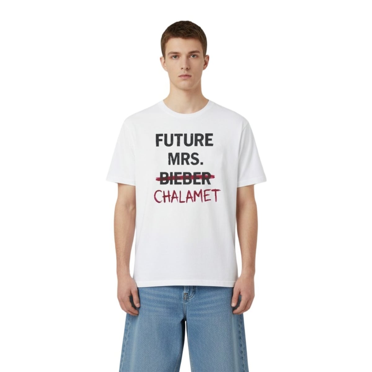 To understand the genius of this shirt, you have to understand the timeline of modern celebrity crushes. For over a decade, “Future Mrs. Bieber” was the ultimate pop-culture slogan, representing the peak of the 2010s fan-girl era. By crossing out “Bieber” and replacing it with “Chalamet,” the shirt playfully acknowledges moving on from a past generation’s ultimate heartthrob to fully claiming today’s reigning Hollywood “It Boy,” Timothée Chalamet.