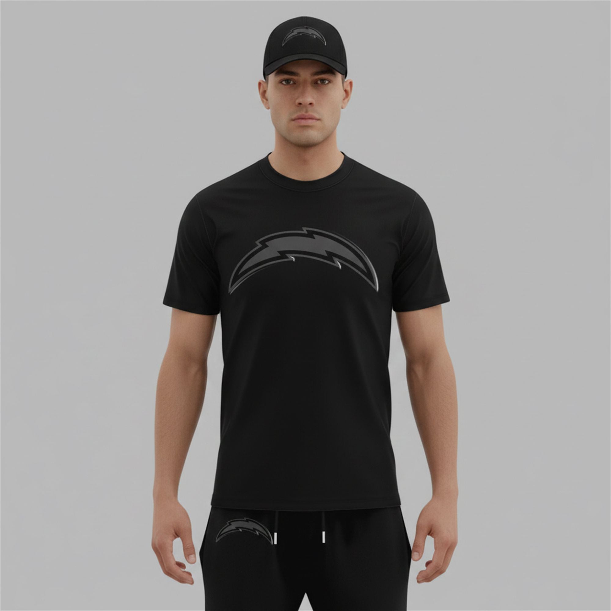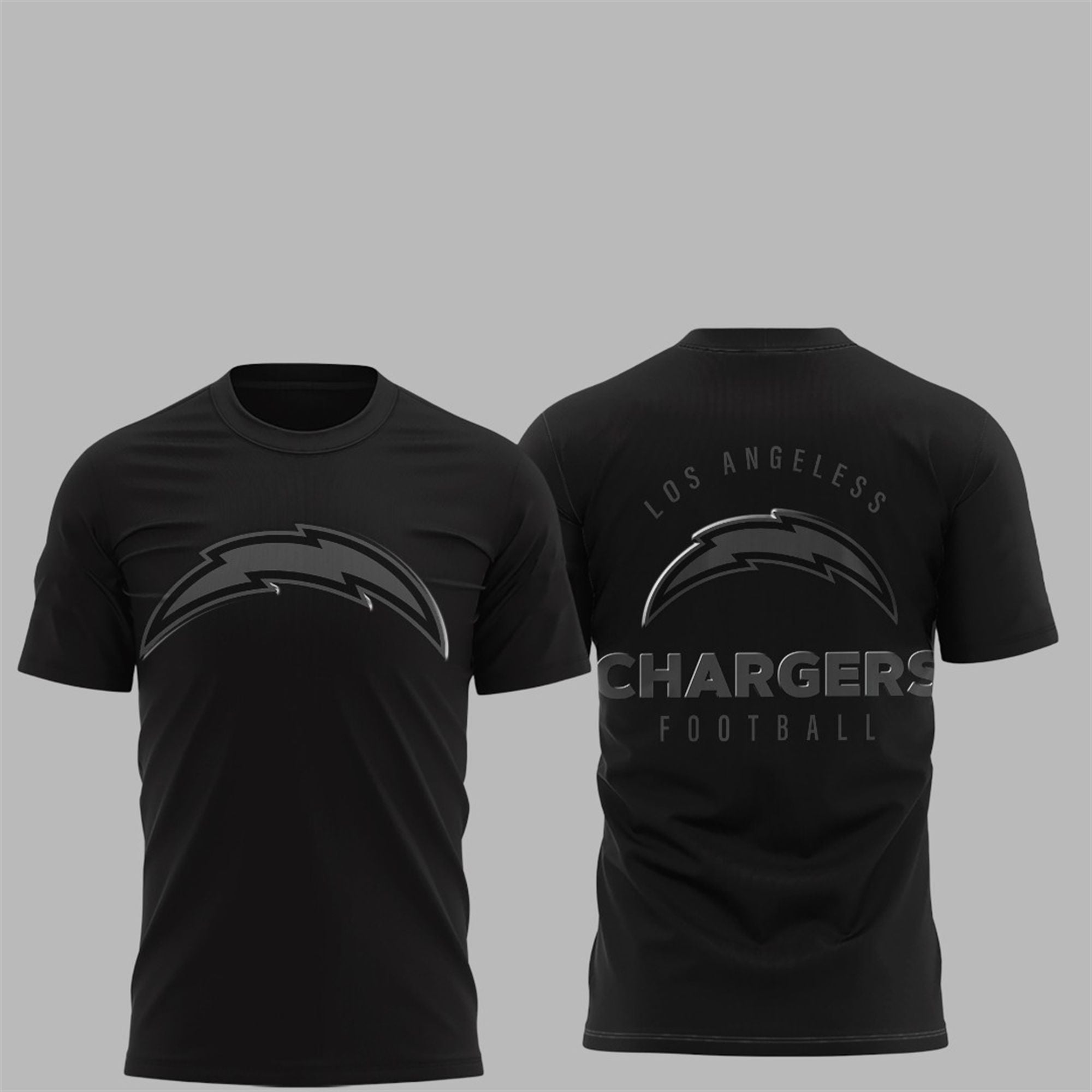 The shirt redefines what it means to support your team. While the Chargers are famous for their Powder Blue, this special edition 2025 release taps into the “Dark Mode” aesthetic that has taken the football by storm. The front of the shirt features a centered, stealth-grey rendition of the iconic Chargers Lightning Bolt, rendered with a 3D metallic effect that pops against the solid black background.