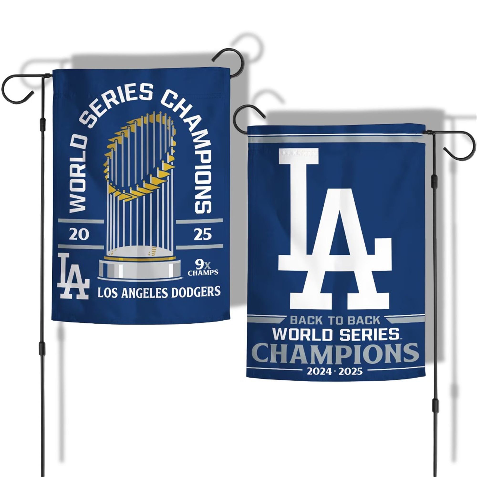 Featuring the iconic “LA” logo, the flag proudly displays the “Back to Back World Series Champions” title, anchoring it with the historic 2024-2025 dates. One design even highlights the coveted Commissioner’s Trophy and proudly proclaims “9x Champs,” reminding everyone of the franchise’s storied legacy. The bold team colorsāDodger Blue, whiteāare rendered in vivid, fade-resistant detail, ensuring your championship pride flies bright all year long.