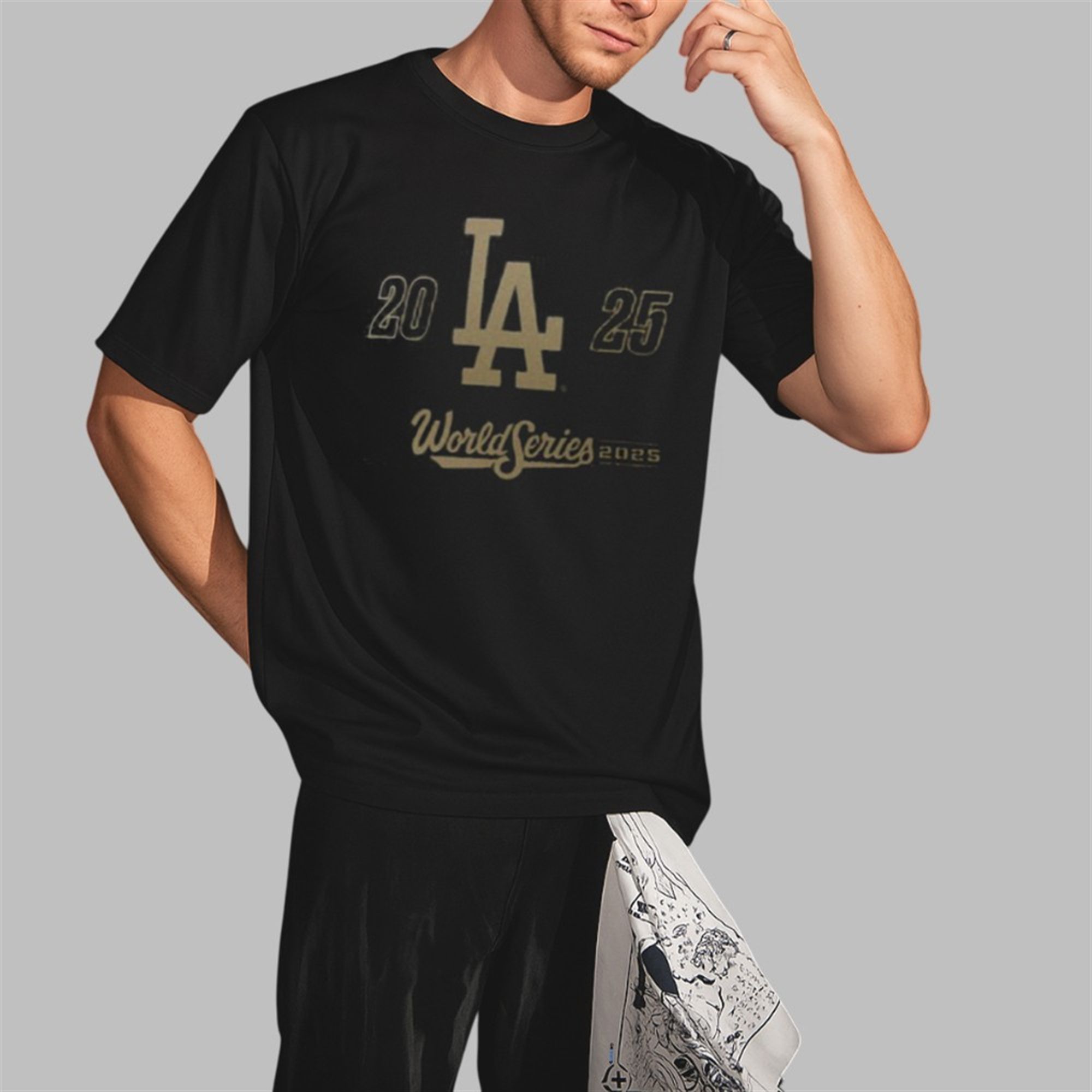 The wait is over! The Los Angeles Dodgers are the 2025 World Series Champions, and this LA Dodgers 2025 World Series Shirt is the ultimate shirt to commemorate their incredible journey and triumphant victory. Meticulously designed for the dedicated fan, this t-shirt captures the essence of a championship season. The front graphic features the iconic “LA” logo in a distinguished championship gold, flanked by the year “20” and “25” to forever mark this historic achievement. Below, the elegant “World Series 2025” script proudly proclaims their dominance. Set against a classic black backdrop, the sophisticated design makes a bold statement of pride and loyalty. This isn’t just a t-shirt; it’s the uniform for the celebration parade, the conversation starter at every gathering, and the first thing you’ll grab to remember the thrill of the final out.
