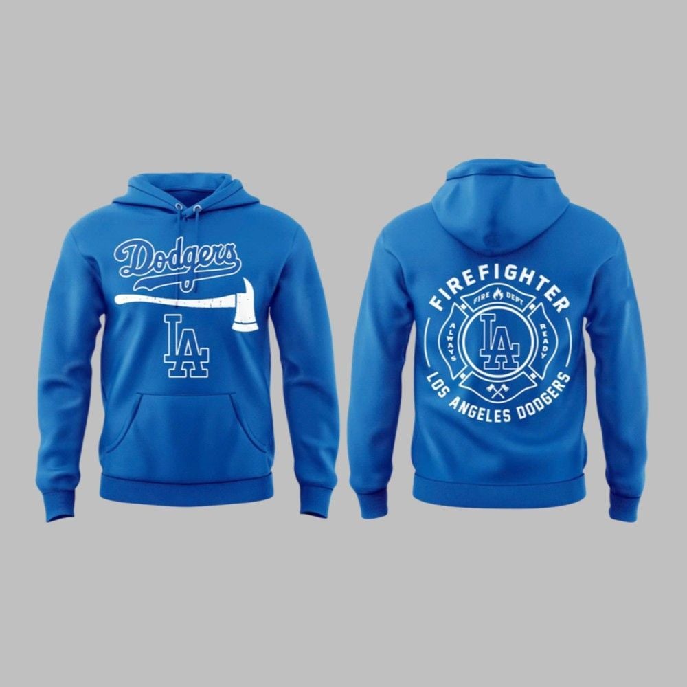 Crafted with exceptional attention to detail, this shirt stands out in both style and substance. The front features the classic “Dodgers” script logo, instantly recognizable to fans everywhere. Integrated into the design is a clean, white firefighter’s axe, symbolizing strength and readiness, positioned above the timeless “LA” monogram.