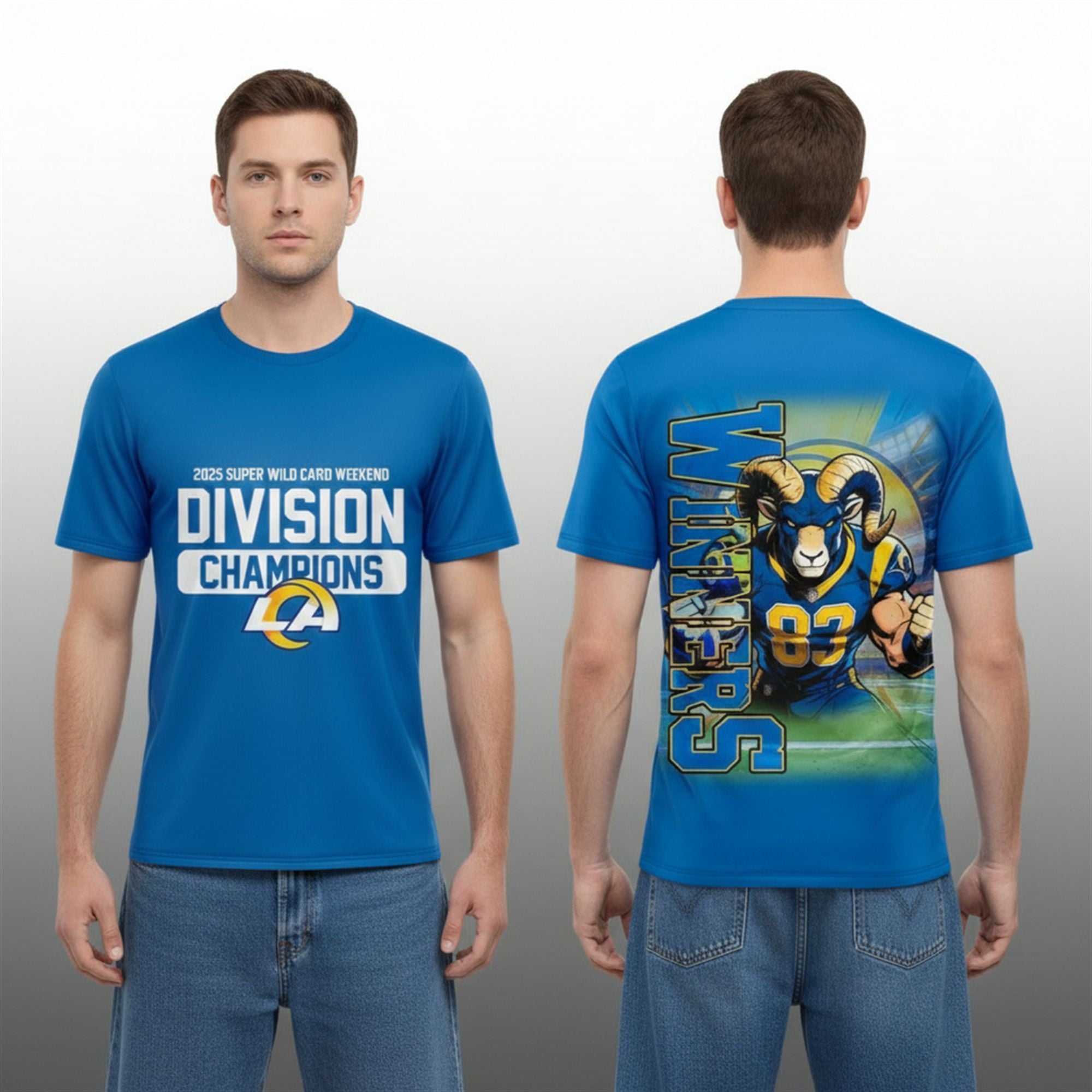 This shirt exploded on social media feeds and fan forums immediately following the game because it perfectly captured the raw emotion of the Rams’ upset victory. The “Mascot Mode” graphic on the back resonated deeply with younger fans on TikTok and Instagram, who turned the aggressive Ram stance into a trending meme symbolizing “unstoppable energy.” Furthermore, the unique combination of celebrating both the Wild Card round and the Division title on a single item sparked a massive debate and engagement online, driving curiosity and high demand for this specific design over standard generic merchandise.
