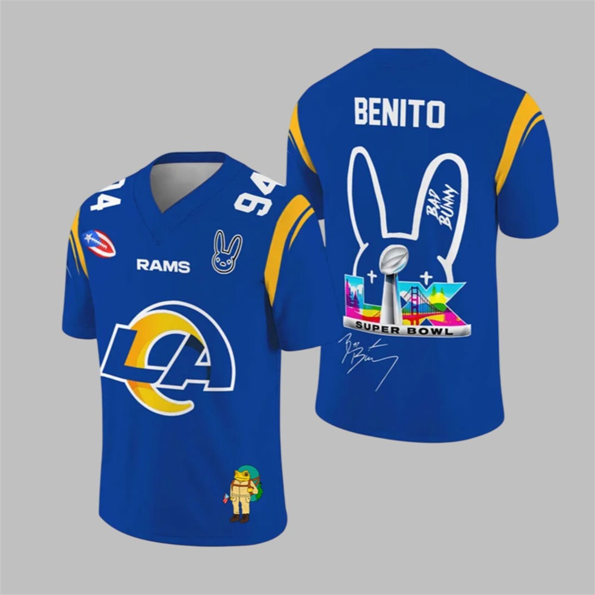 The design is loaded with details you won’t find anywhere else. The front proudly displays the iconic LA Rams logo and “RAMS” wordmark in the team’s signature Sol yellow and blue. But look closer, and you’ll see the details that set this piece apart: Bad Bunny’s unmistakable bunny logo on the chest and a playful, pop-culture graphic accent on the sleeve, giving it a unique streetwear edge.