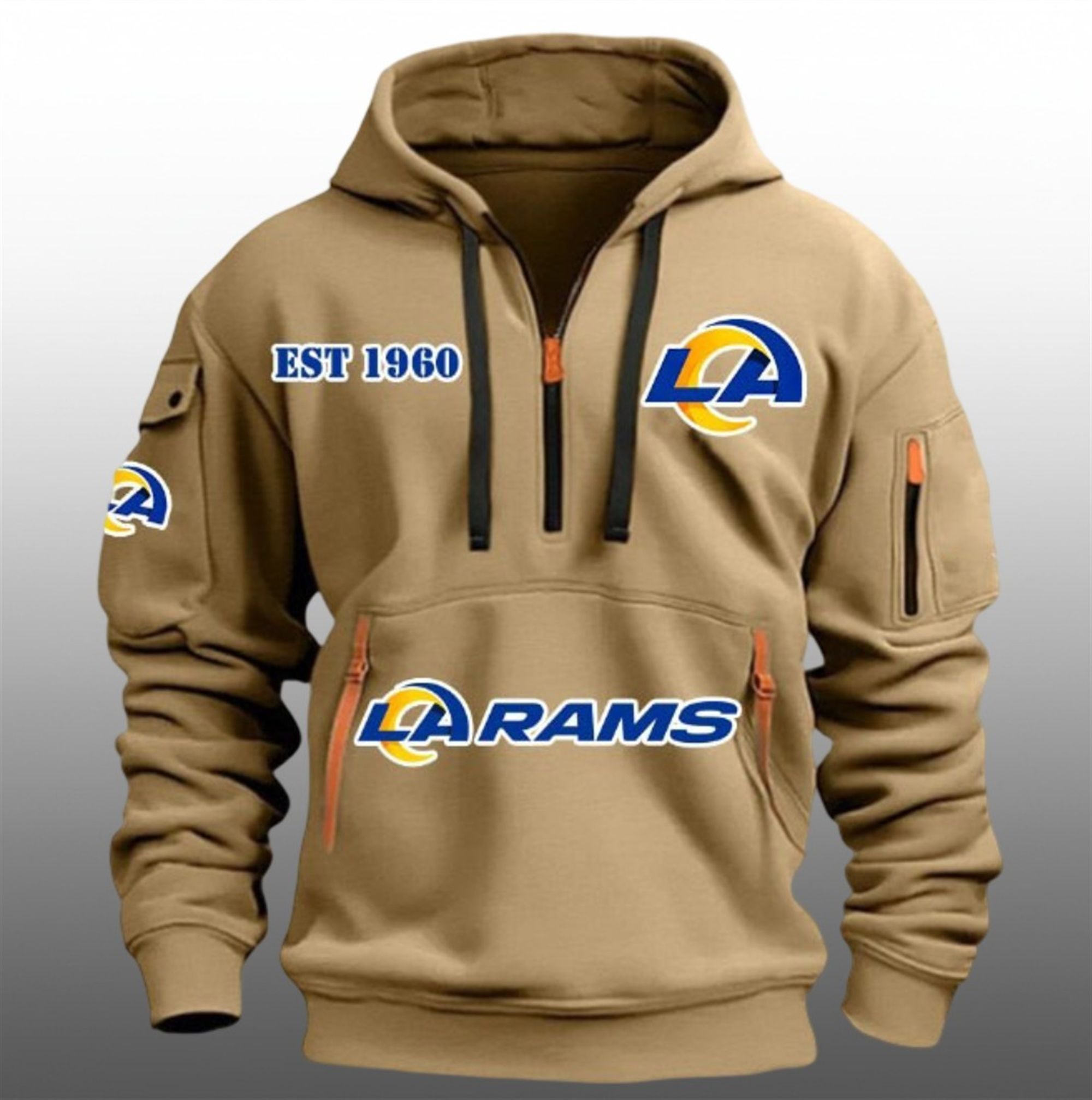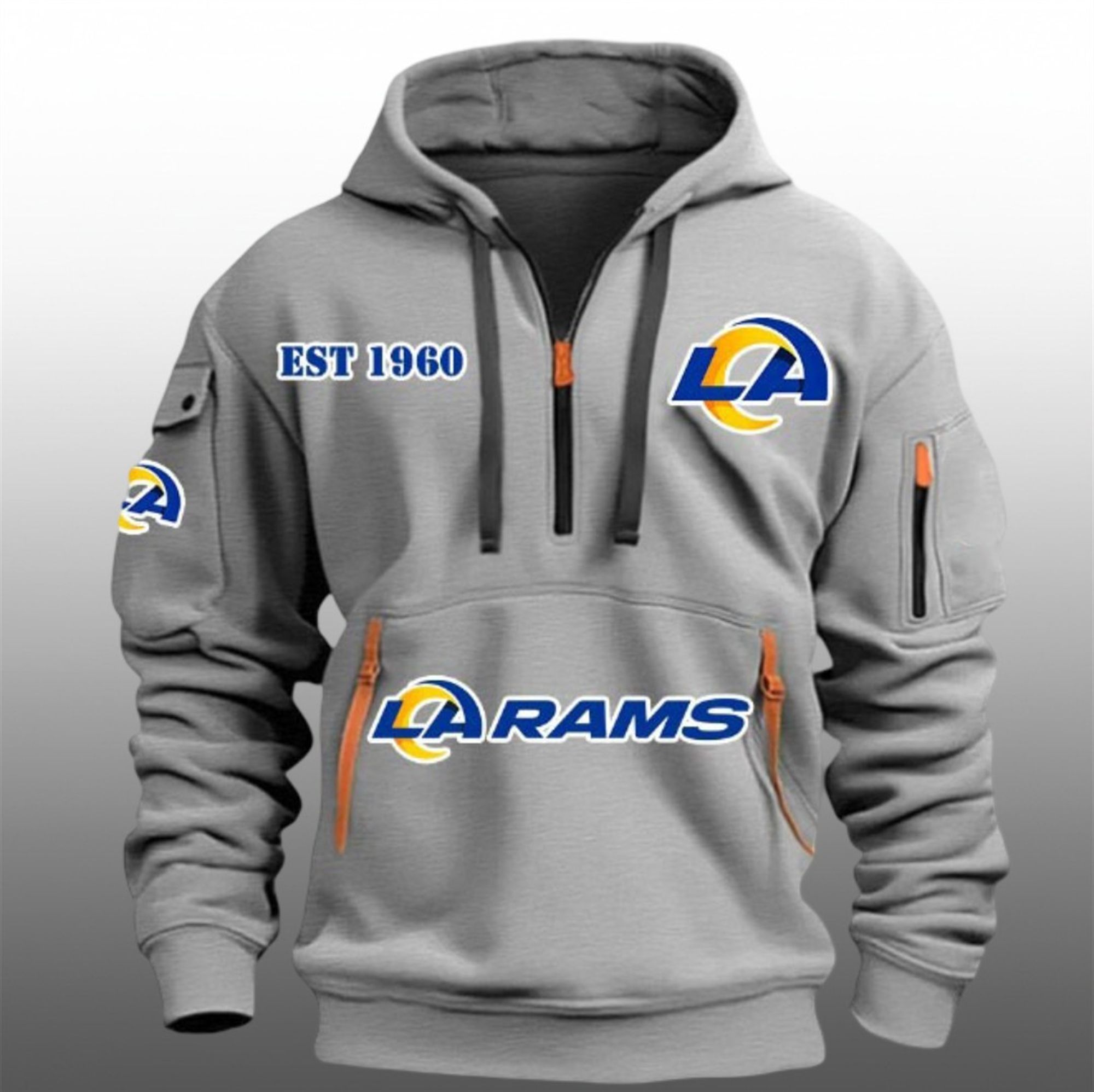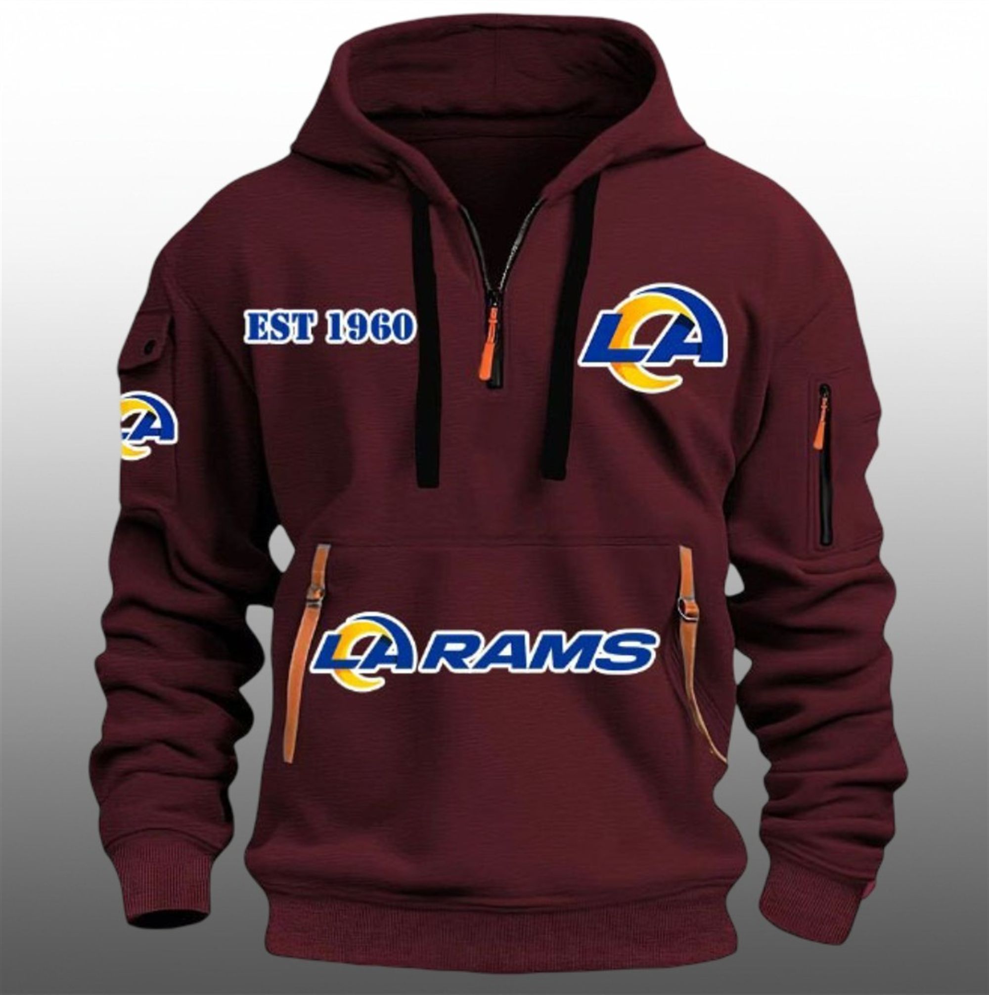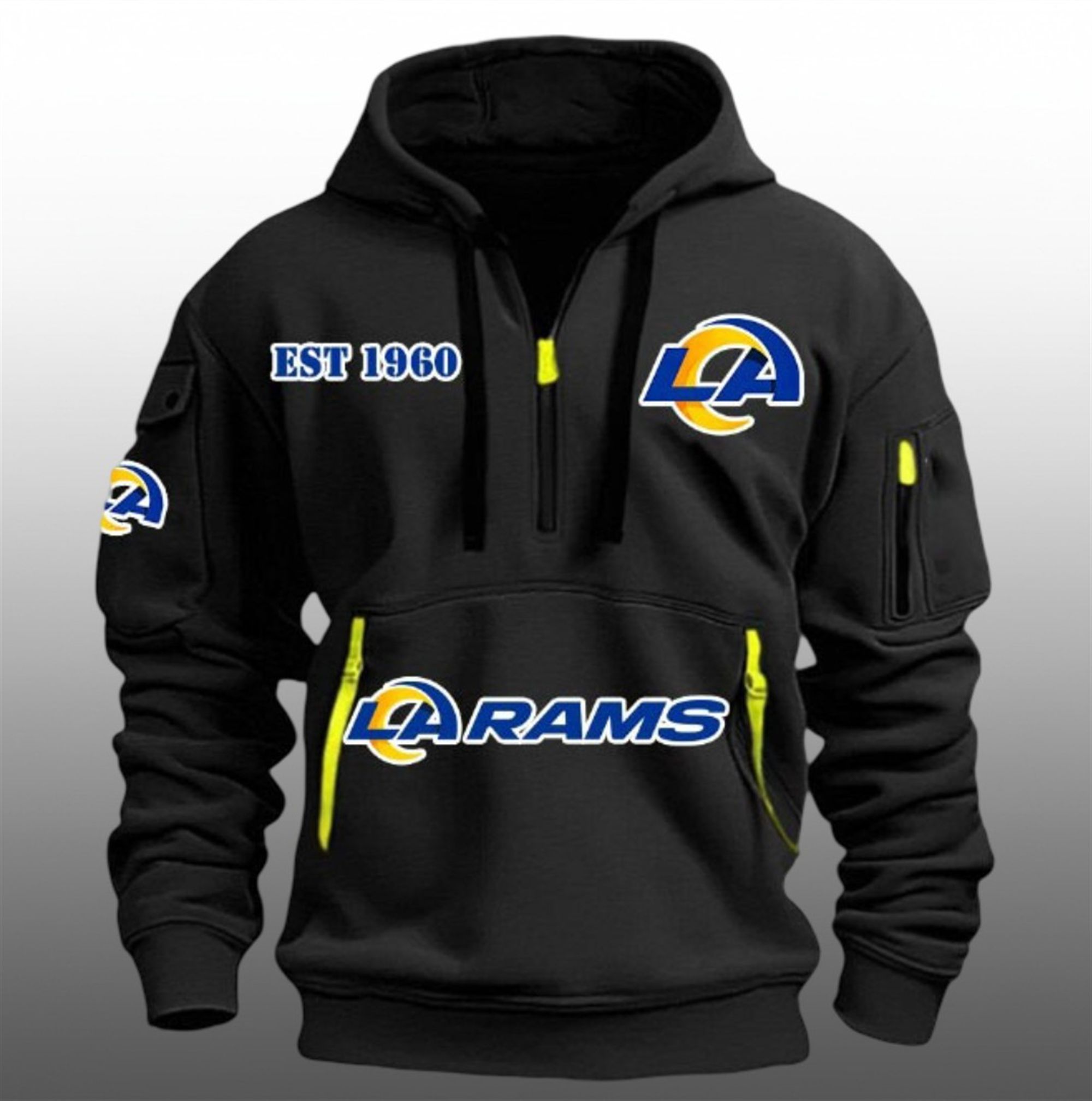 levate your game day rotation with the LA Rams EST 1960 Quarter Zip Hoodie, a piece that redefines standard fan apparel. This dynamic hoodie merges the iconic history of the Rams franchise with a modern, utility-inspired aesthetic that stands out in any crowd.