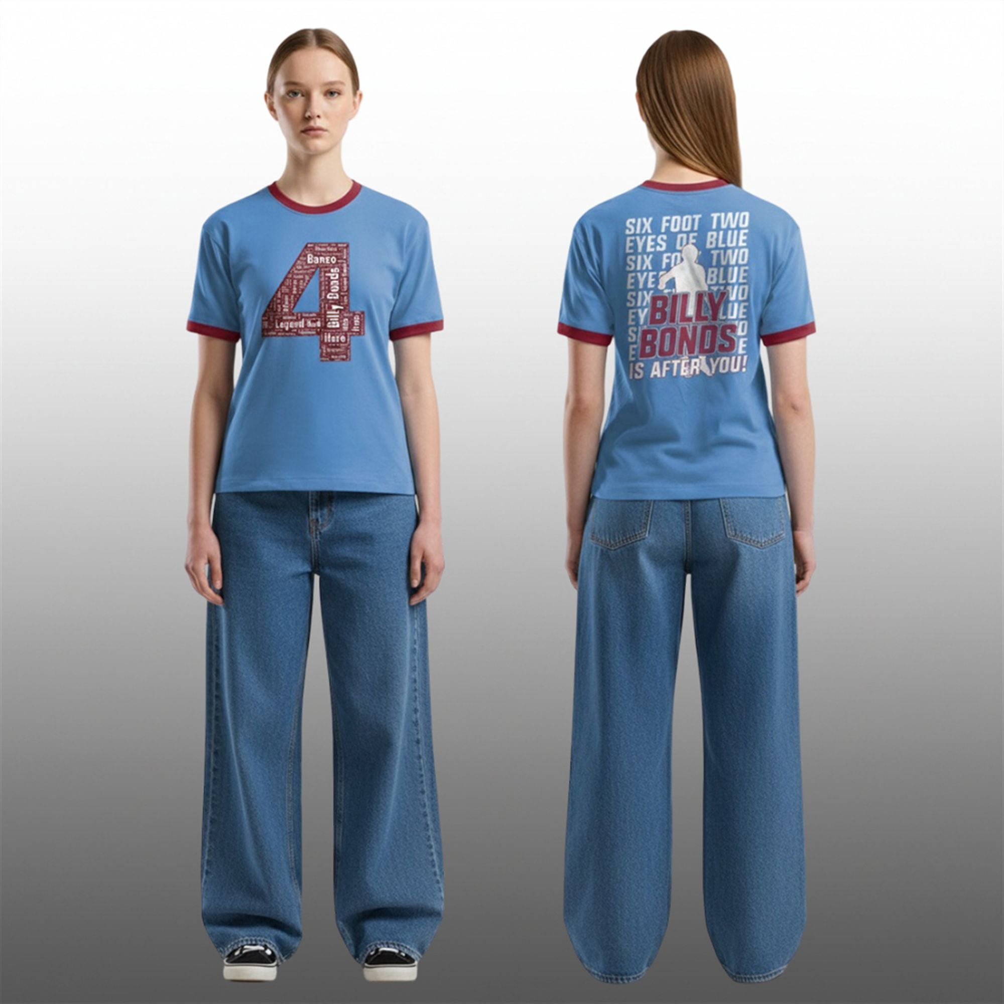 The Back: Turn around, and you’ll stop people in their tracks with the iconic chant that terrified opposition players: “SIX FOOT TWO, EYES OF BLUE, BILLY BONDS IS AFTER YOU!” Accompanied by a silhouette of the man himself in action, it captures the intimidating presence he brought to every game.