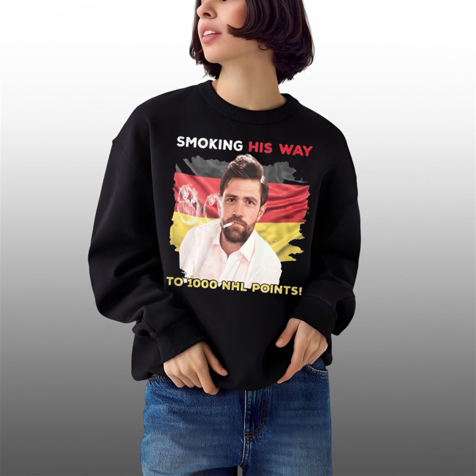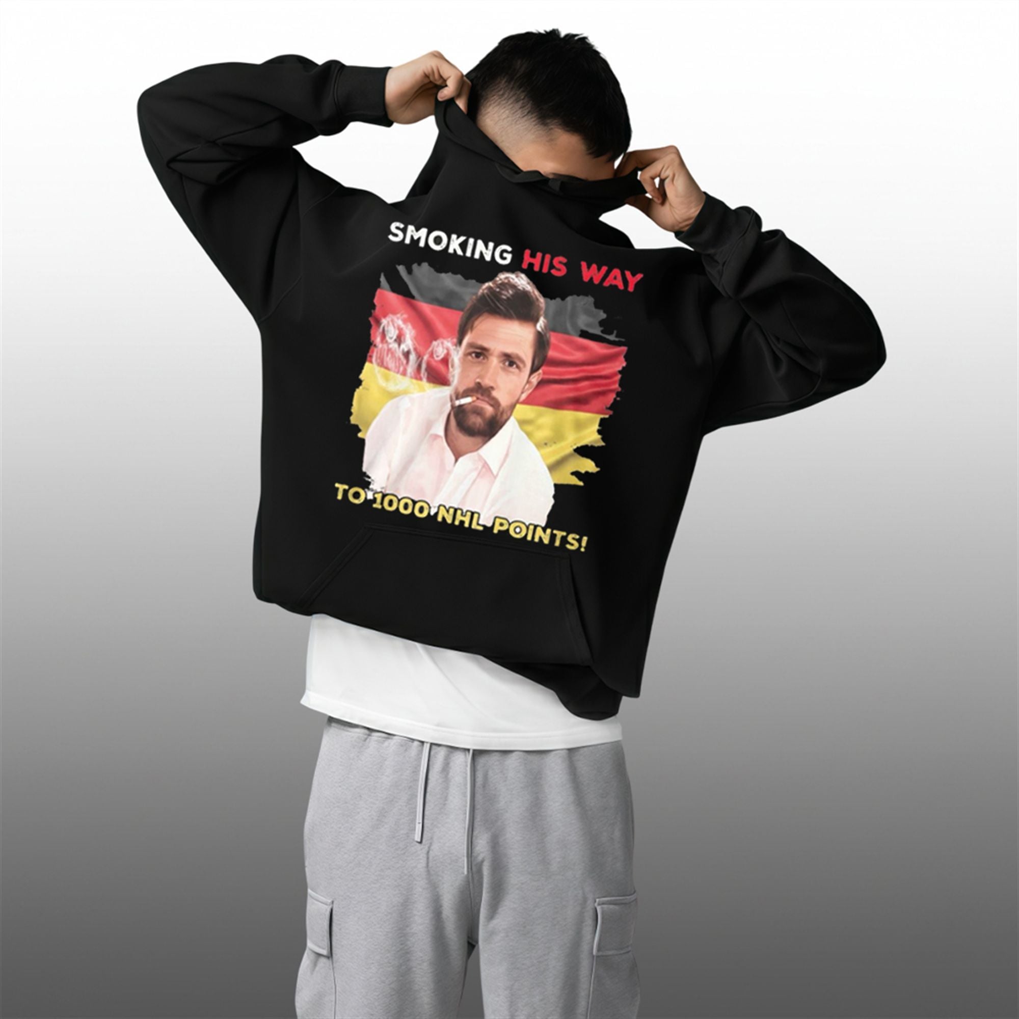 The design of this shirt is bold, gritty, and unmistakably unique. It showcases a high-quality, stylized graphic of Leon Draisaitl from his now-famous viral wedding photo, complete with a cigarette and a nonchalant expression, set against the backdrop of the German flag. The text “SMOKING HIS WAY TO 1000 POINTS!” plays on the double meaning: acknowledging his “smoking hot” performance on the ice while nodding to the “bad boy” charm of the viral image. It’s a snapshot of a player at the peak of his powers, looking relaxed even as he rewrites the record books.