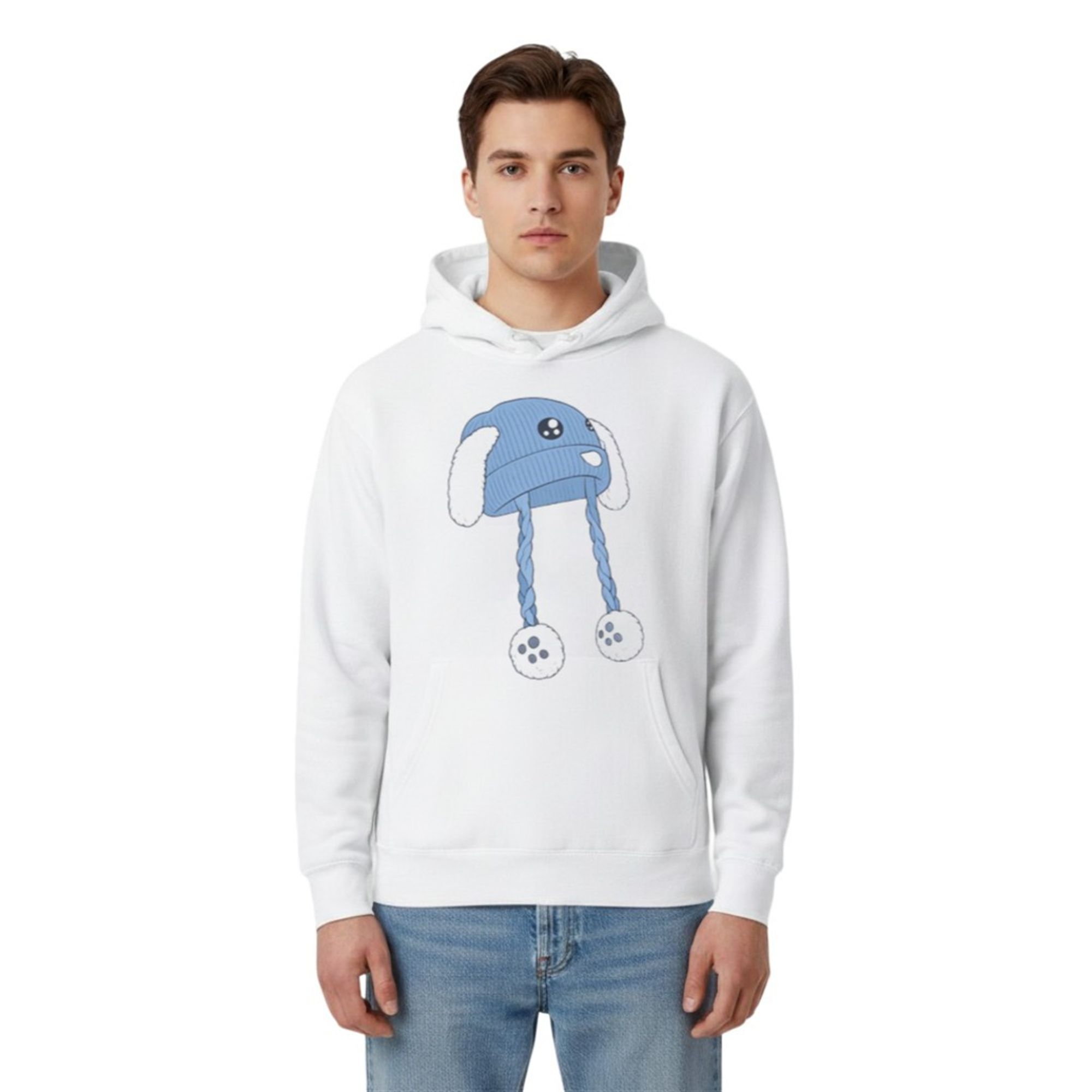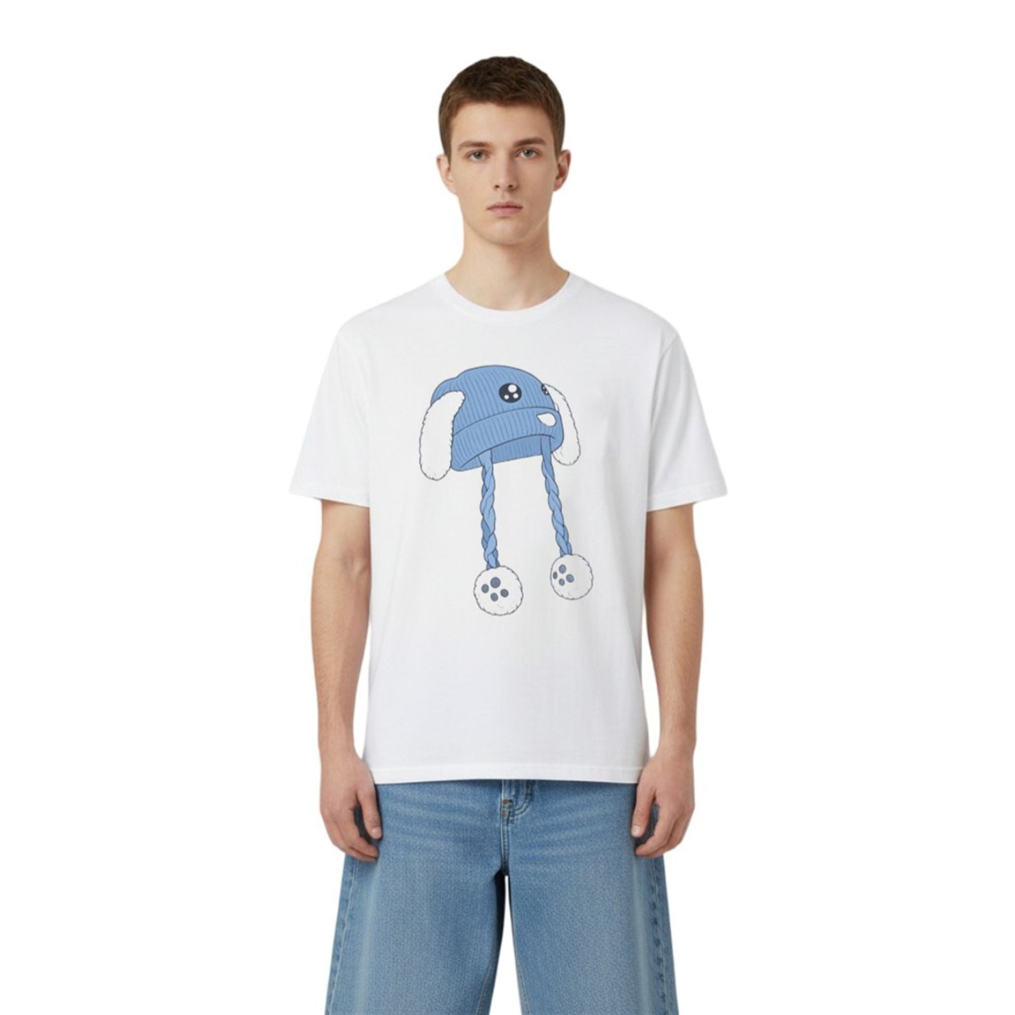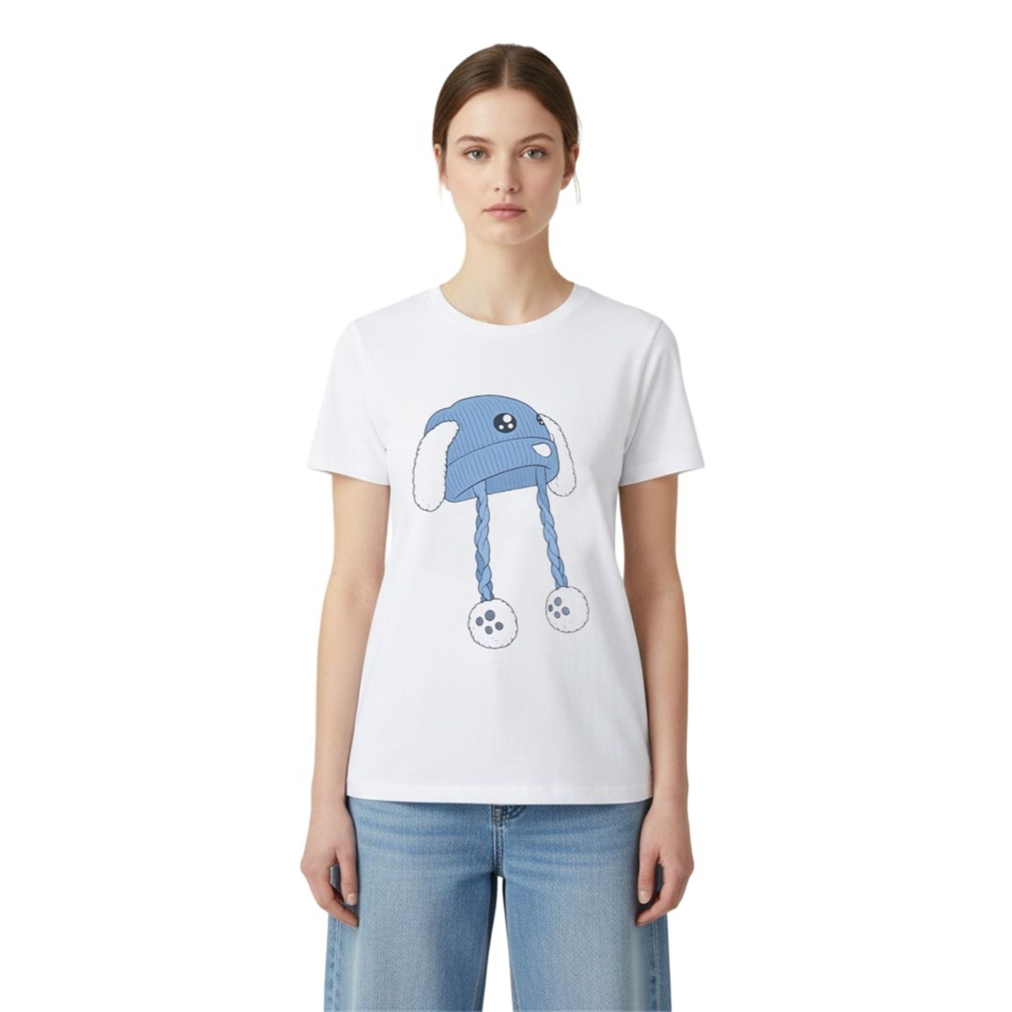 The shirt stands out because it masters the art of contrast. At first glance, the centerpiece of the design is a charming, illustrated blue beanie. The graphic is detailed with playful elements: large, expressive eyes on the brim, soft white bunny ears drooping to the sides, and long, braided tassels ending in fluffy pom-poms. It evokes a sense of nostalgia, warmth, and character design often found in indie games and animation.