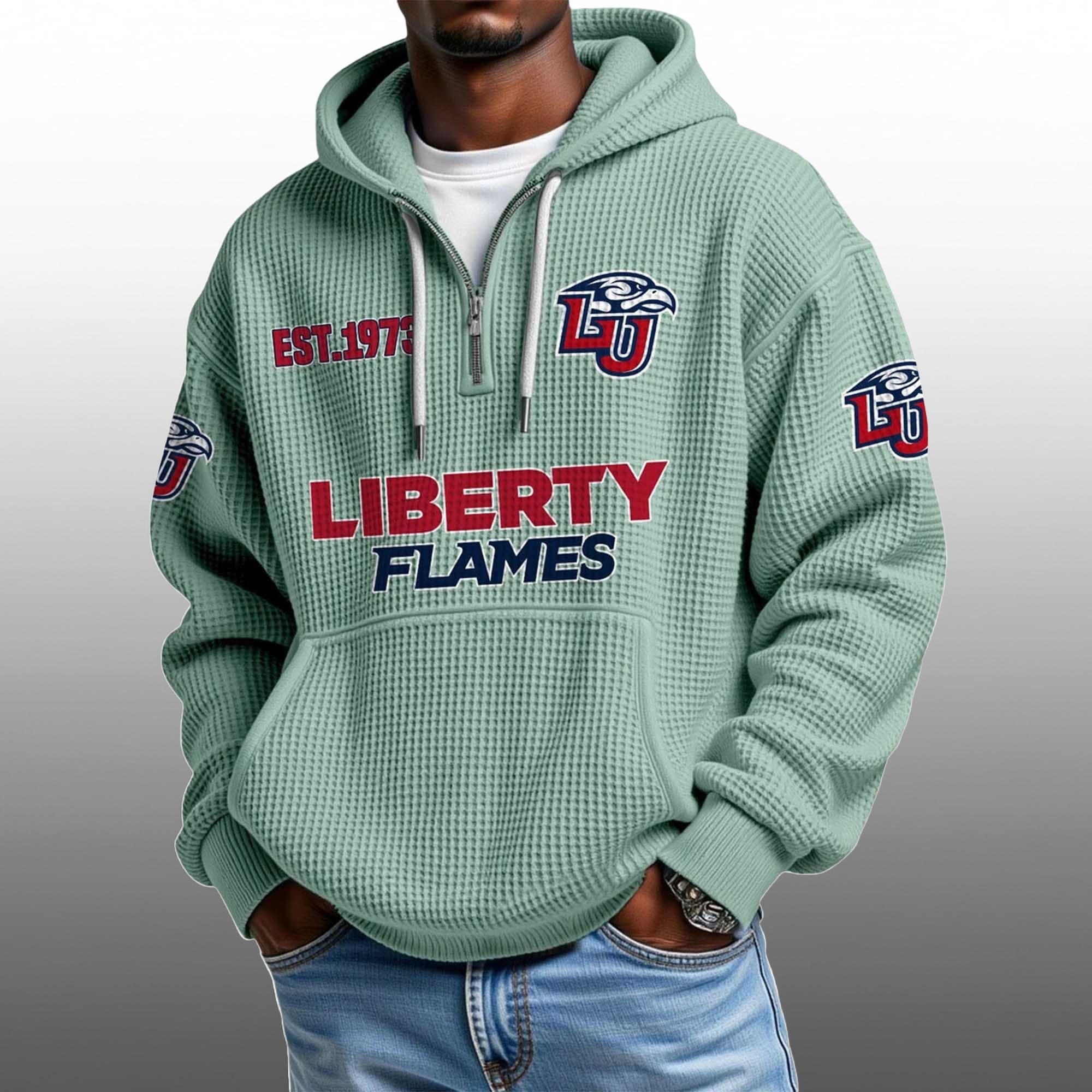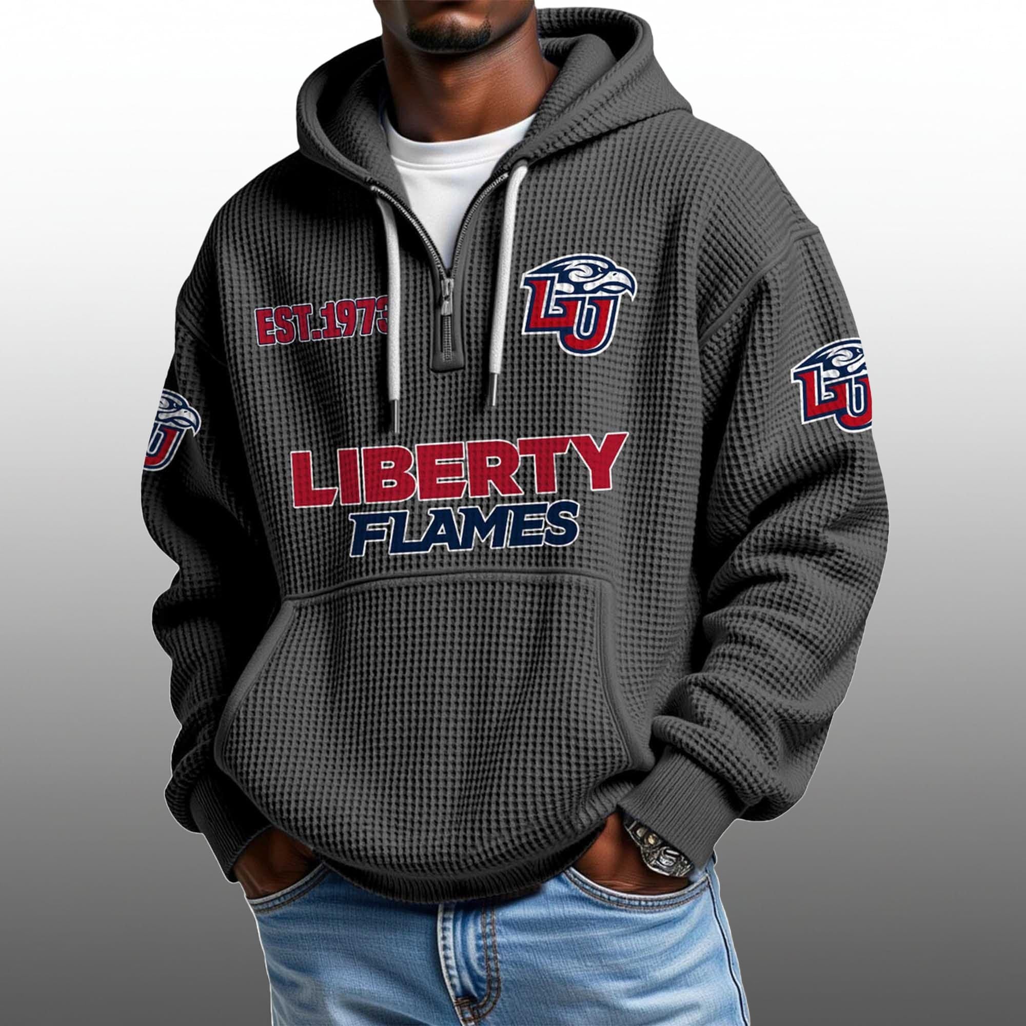 Gear up specifically for Bowl Season and winter gamedays with the ultimate layer of warmth. The Liberty Flames Football EST 1973 Quarter-Zip Waffle Hoodie combines heritage-inspired design with modern comfort. It’s the top choice for fans who want to represent “Flames Nation” in style.
