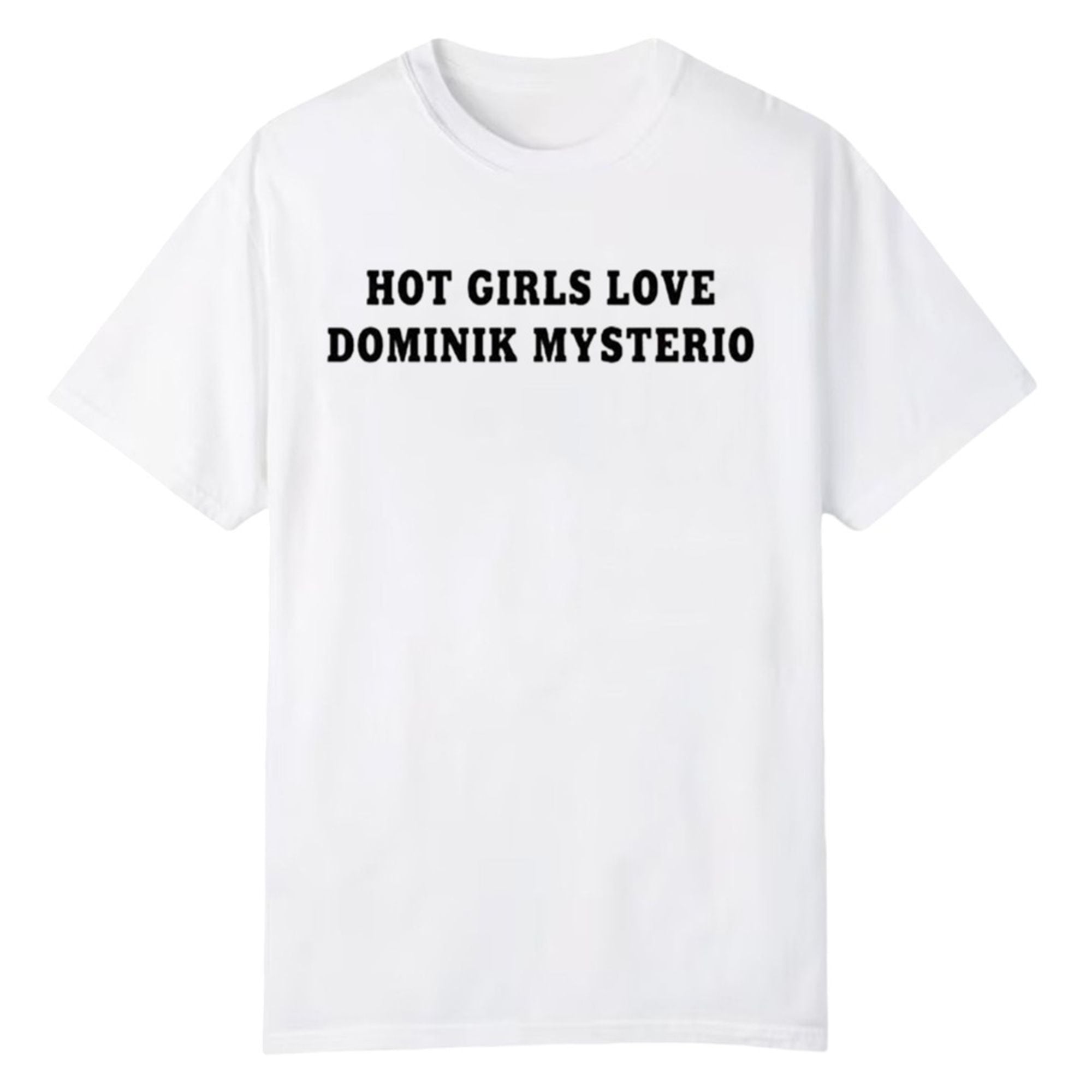 In the world of sports entertainment, fashion is often as loud as the commentary, but rarely does a single text-based design carry as much weight as this one. The shirt features a minimalist yet striking aesthetic that mimics the exact look worn by the Women’s World Champion. The design relies on bold, serif typography centered on a crisp white background “Hot Girls Love Dominik Mysterio”, ensuring maximum readability from the nosebleed section to the front row.