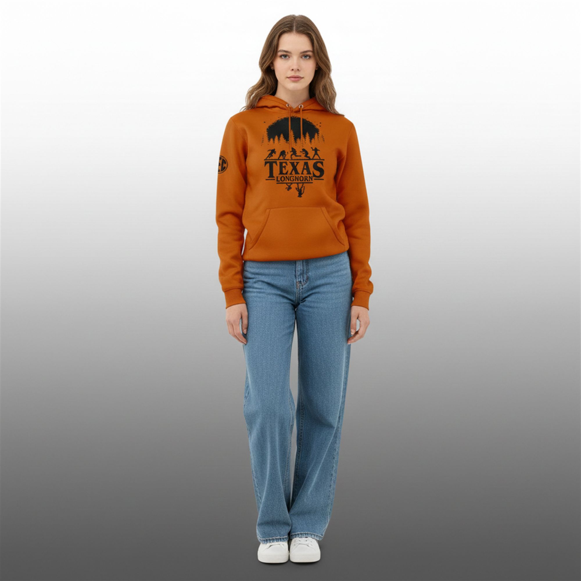 This isn’t your average bookstore hoodie. The Texas Longhorns Stranger Things Hoodie is a meticulously designed tribute to two massive cultural phenomenons. The front features the classic “TEXAS LONGHORN” text stylized in the famous red-outlined, retro serif font synonymous with the show. Above the text, a hauntingly cool silhouette design replaces the typical pine trees of Hawkins with a blend of football players in action and the iconic kids-on-bikes motif, all set against a dark, mysterious forest backdrop.