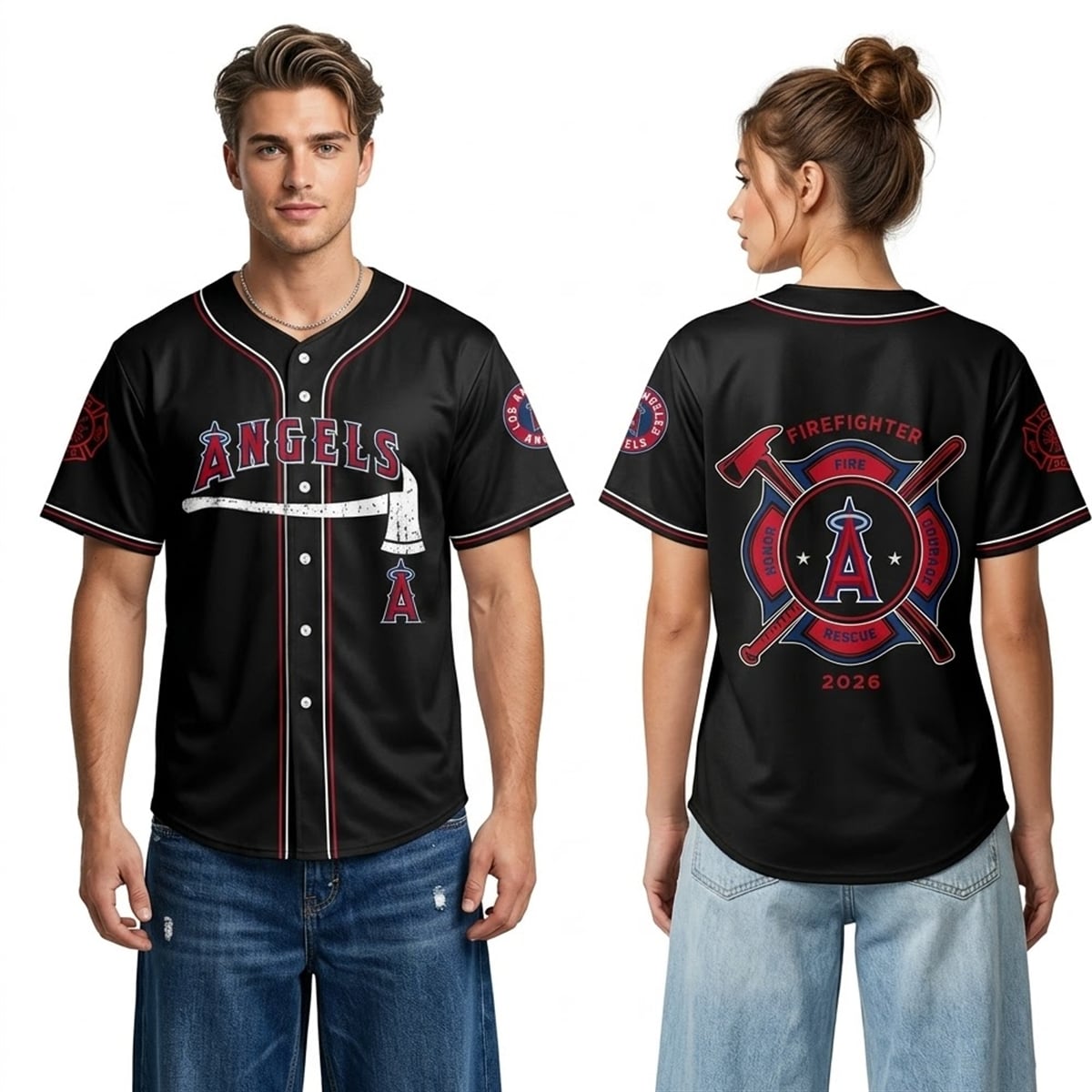The jersey features a deep black base accented by sharp red and white piping along the placket and sleeve cuffs. The front of the garment showcases the classic “ANGELS” wordmark styled with red and blue borders, situated directly above a striking, distressed white graphic of a firefighter’s axe. The iconic Halo ‘A‘ logo is subtly placed near the lower hem. The reverse side is a true visual masterpiece: it boasts a large, custom-designed Maltese cross emblem boldly displaying the words “FIRE,” “RESCUE,” “HONOR,” and “COURAGE.” At the very center lies the Angels’ logo, perfectly layered over a crossed baseball bat and firefighter axe, solidly anchored by the commemorative year “2026” in bold red typography.