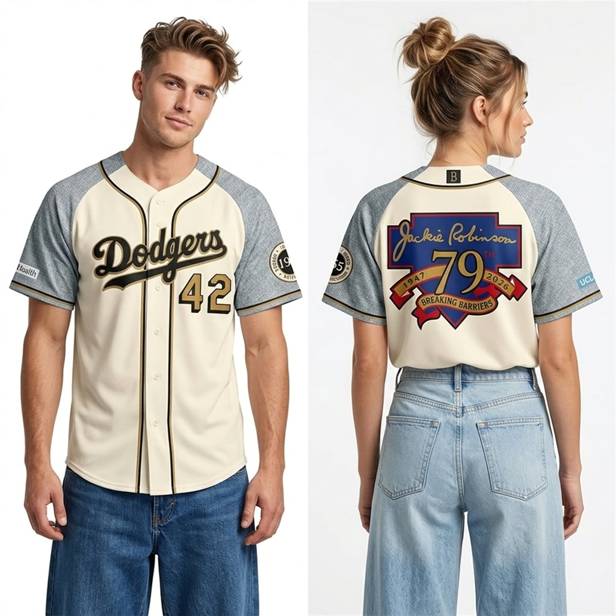 The jersey is a visual triumph that beautifully bridges the gap between mid-century baseball aesthetics and modern streetwear sensibilities. The front of the garment presents a classic cream-colored base, anchored by the iconic “Dodgers” script in a striking black and gold colorway, accompanied by the universally revered number 42. The sleeves provide a bold visual contrast, featuring a unique, textured heather-grey appearance adorned with commemorative circular patches that mark the specific milestones of this historic franchise.