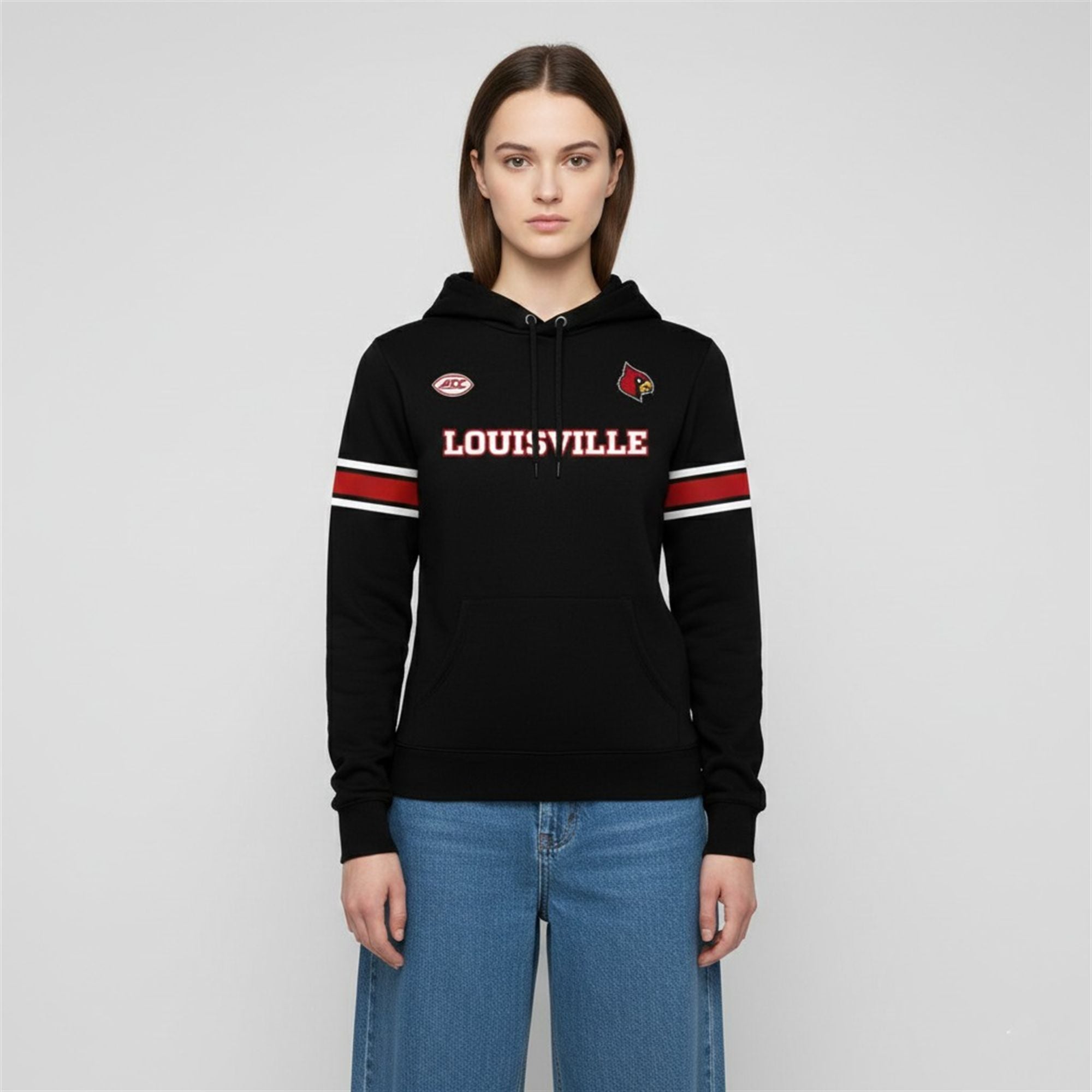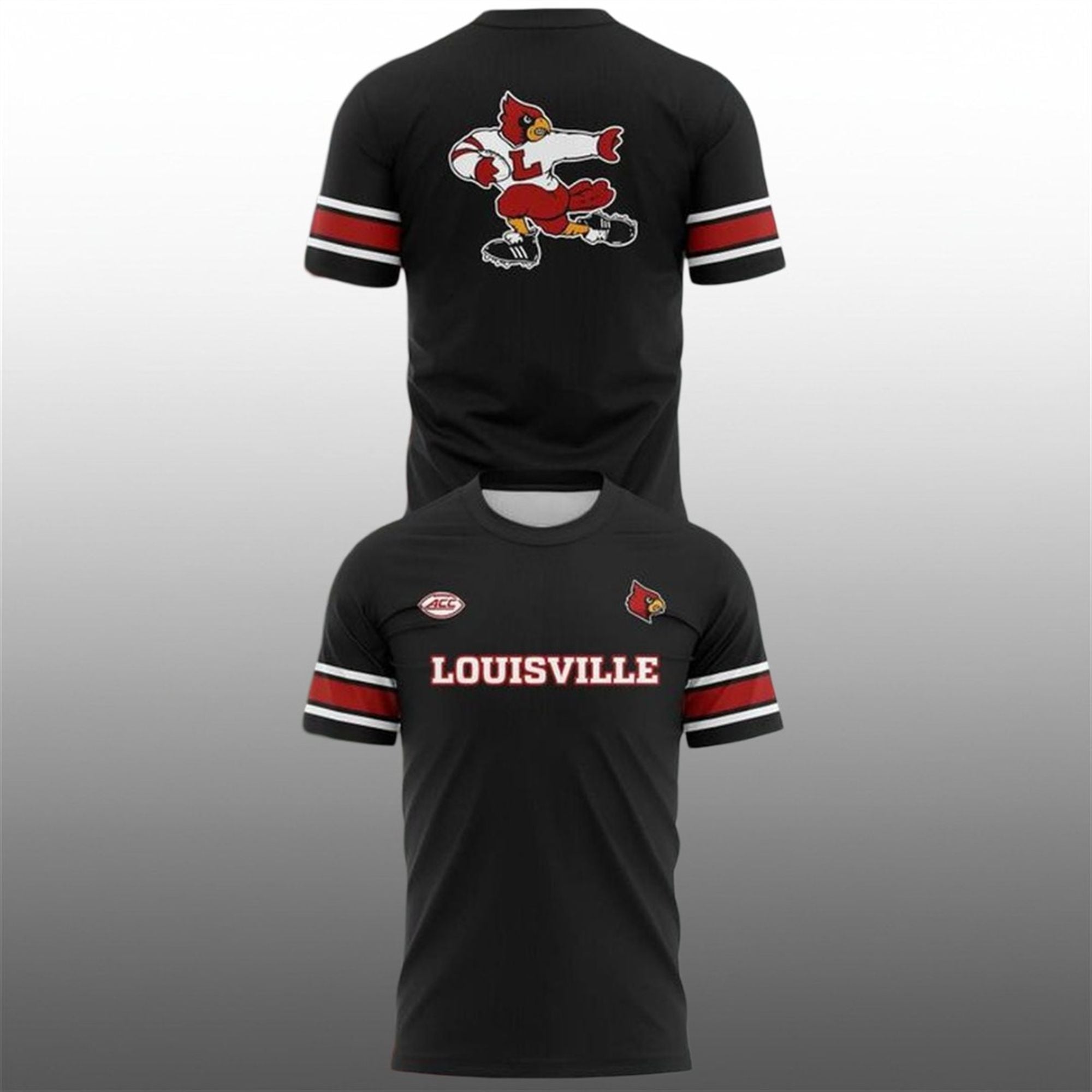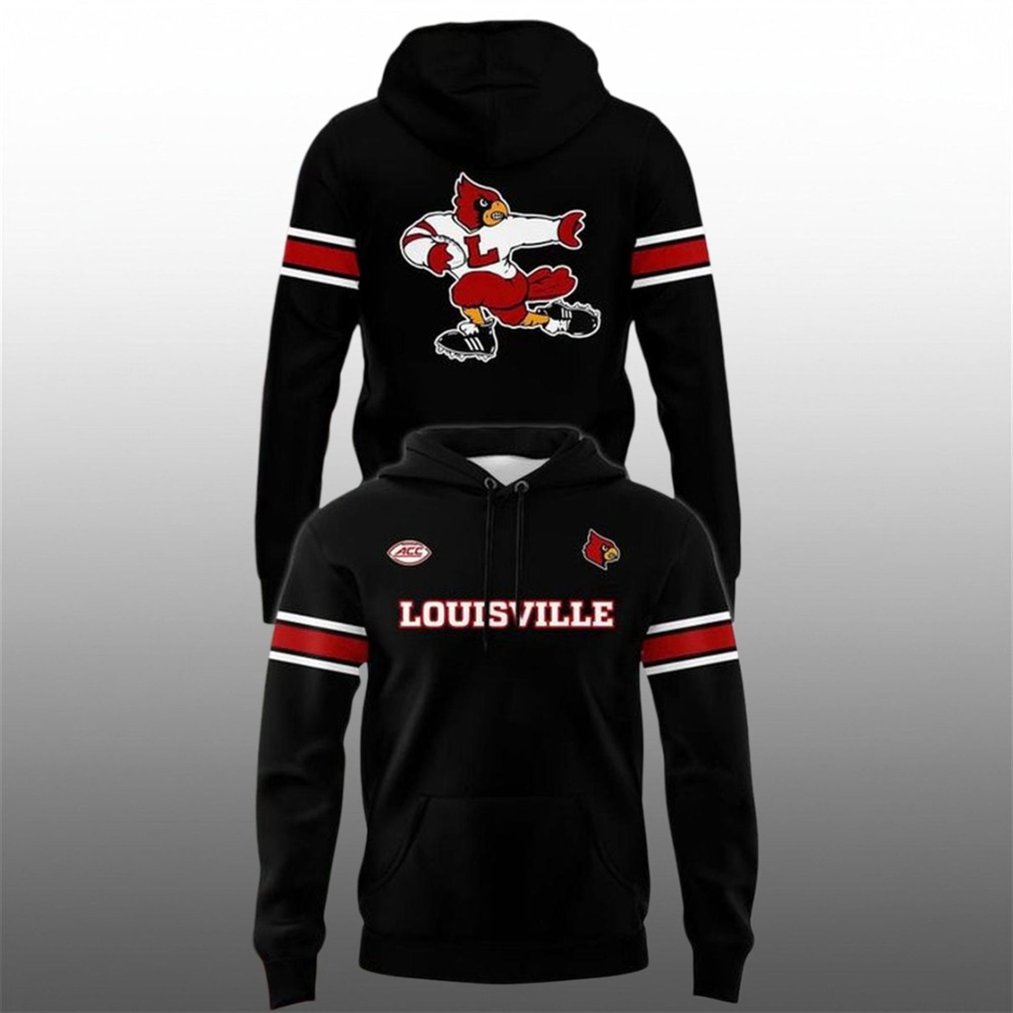 The Louisville Cardinals have a storied history of intense night games, where the energy is palpable and the stakes are high. This hoodie is the uniform for those moments. It features a striking, high-contrast design that pops against the black background. The front showcases the bold “LOUISVILLE” block lettering accompanied by the modern Cardinal head logo and the ACC conference patch, signaling collegiate affiliation. However, the true showstopper is on the back: a large-scale, retro rendition of Louie the Cardinal executing a powerful stiff-arm maneuver, reminiscent of vintage varsity aesthetics.