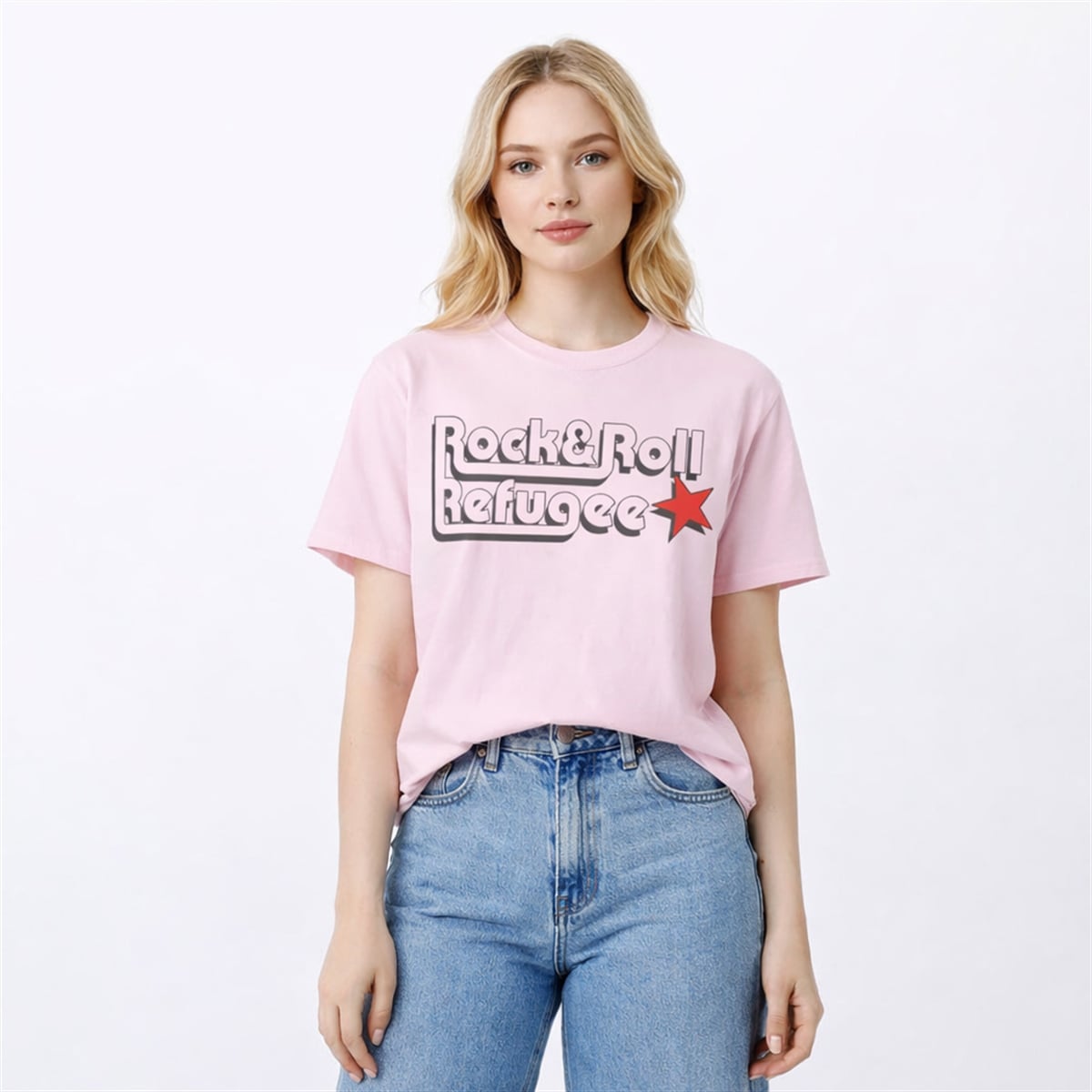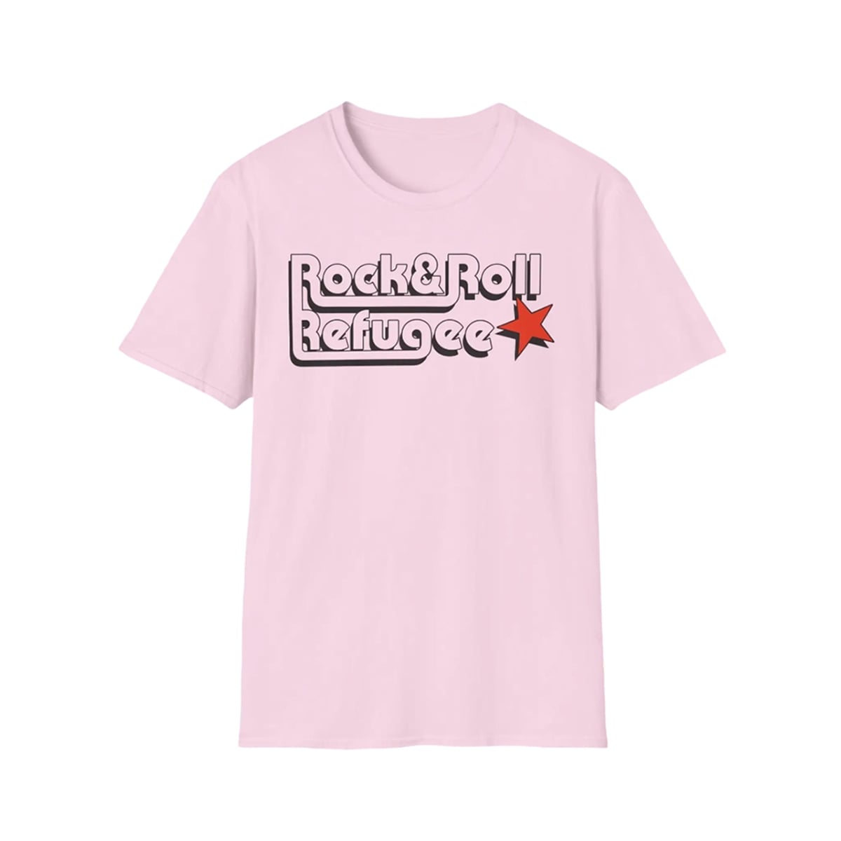 The shirt is a visual masterpiece that celebrates the golden era of music merchandise. Set against a uniquely soft pink backdrop, the design features a striking, multi-dimensional retro font that spells out “Rock & Roll Refugee.” The typography utilizes distinct drop-shadowing and outlined letterforms to create a pop-art effect reminiscent of 1970s band posters. Anchoring the text is a bold, sharply angled star—a timeless symbol of the rock genre. This specific visual combination creates a striking contrast, making the graphic pop instantly to the eye and ensuring it stands out in any crowd.