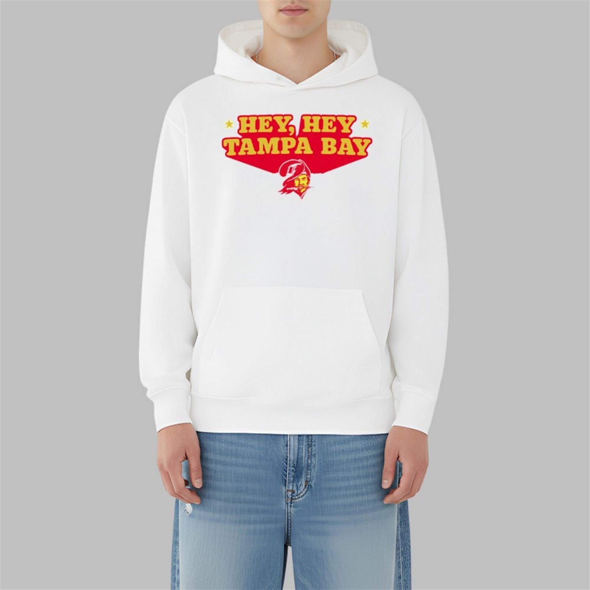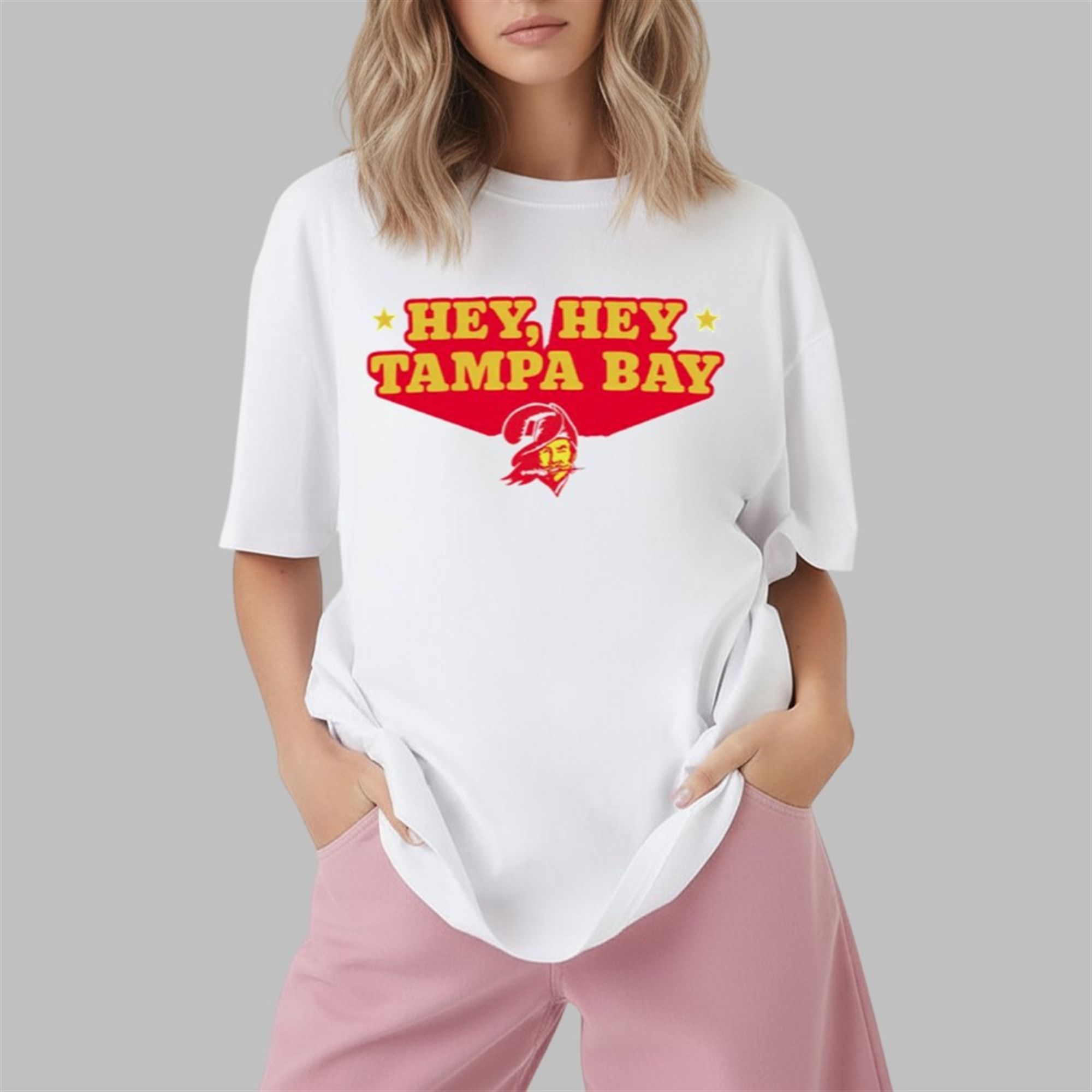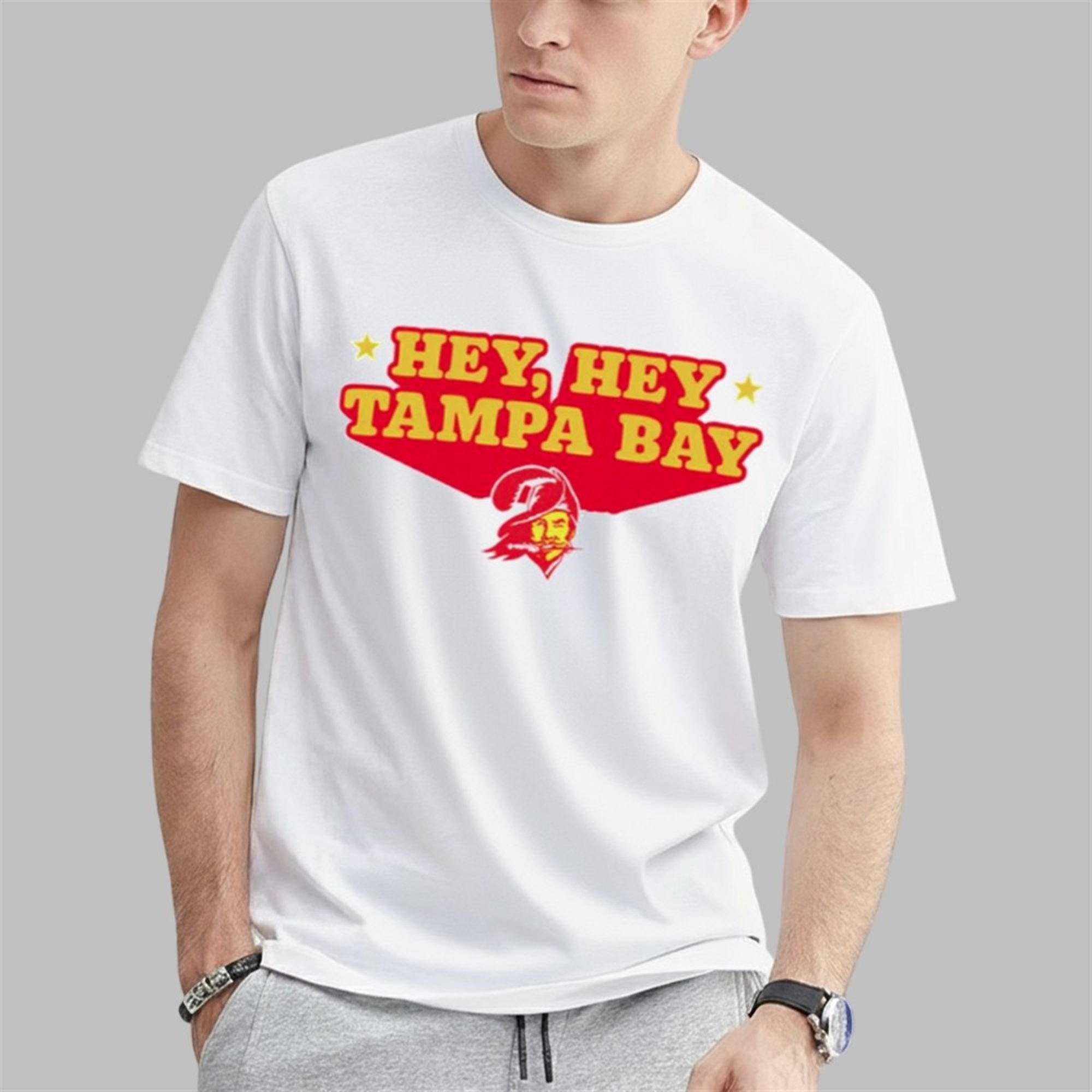 This design is a powerful throwback to the golden age of Bucs nostalgia. The phrase “Hey, Hey Tampa Bay” is the iconic title of the team’s 1979 fight song, a beloved anthem from the original “creamsicle” era. The shirt features a vibrant, retro-style font in classic team colors, all anchored by a subtle, winking Bucco Bruce logo.