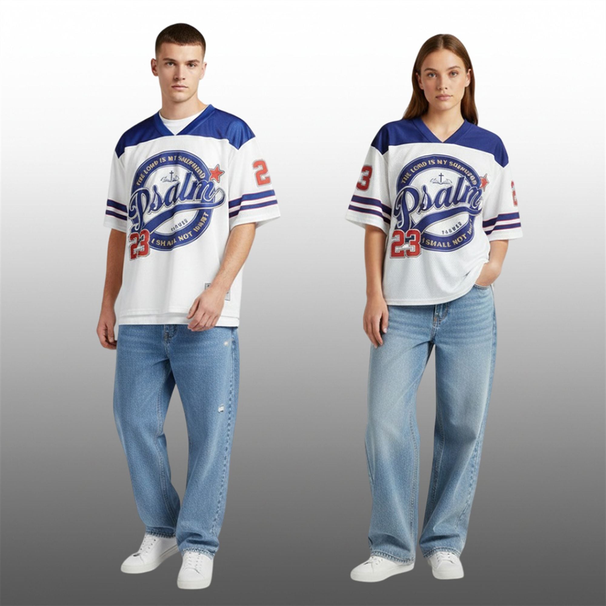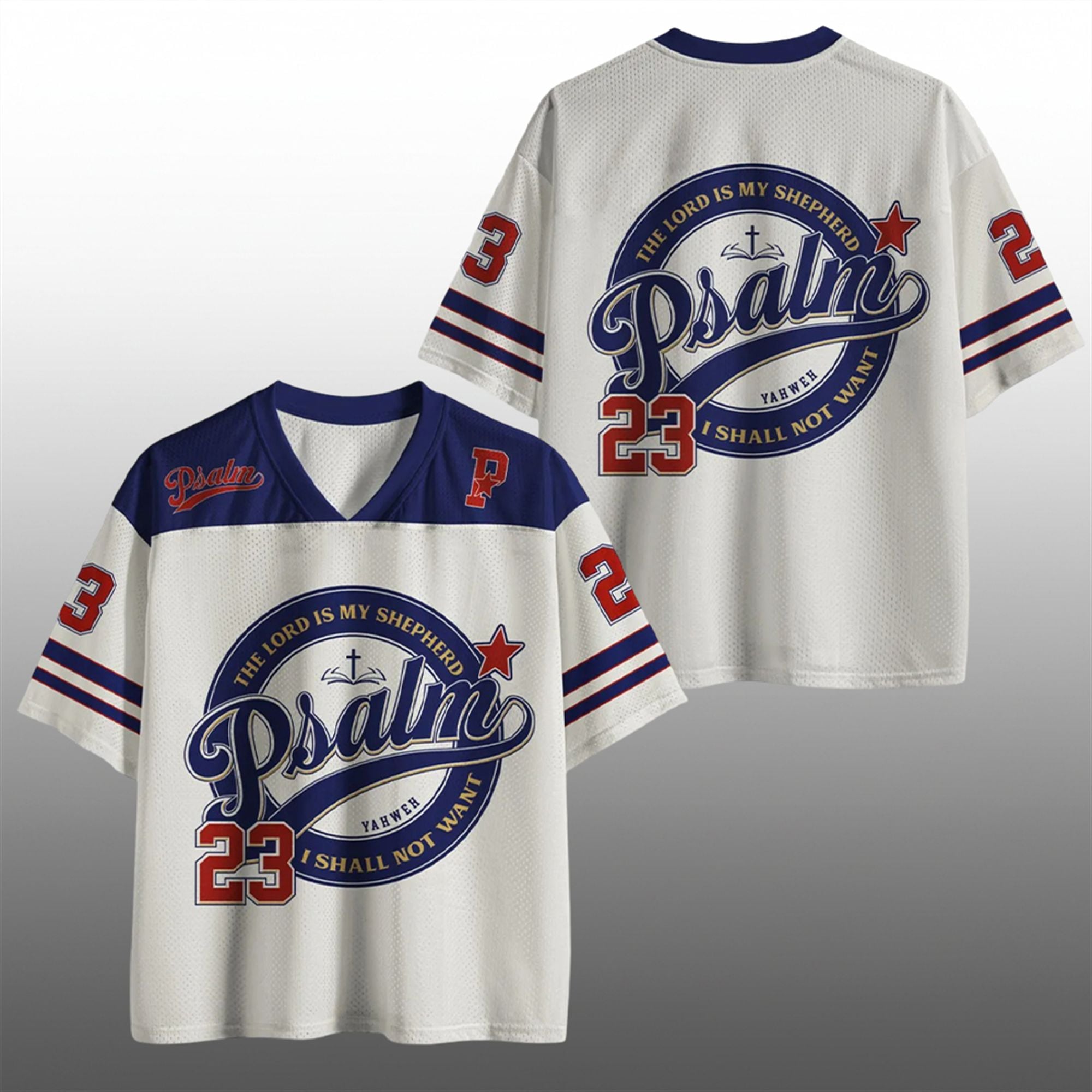 Elevate your wardrobe with the Psalm 23 Championship Mesh Jersey, a fusion of aggressive sports styling and unshakeable spiritual truth. Designed for those who admire the “Rhodes” aesthetic—bold, patriotic, and triumphant—this jersey flips the script to focus on the ultimate Victor: Yahweh.