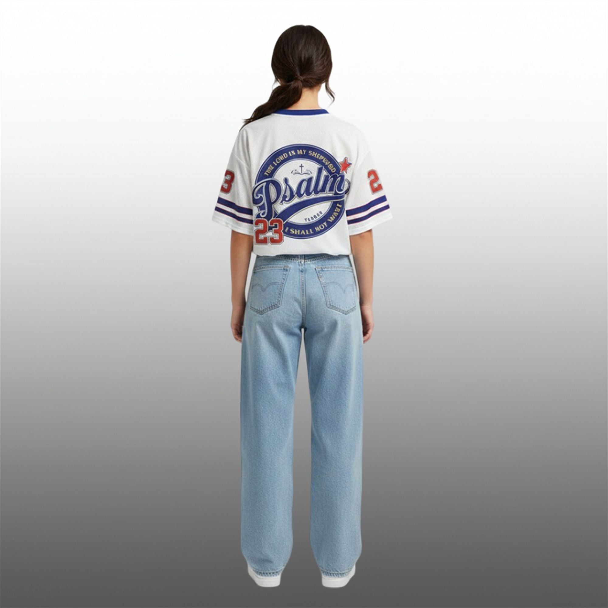 The design features a classic white body with deep navy blue shoulders and red accents, mirroring the iconic “American” colorway. The front and back display an oversized, stylized “Psalm” script logo, anchored by the number 23 to represent the most famous chapter in the Bible. With “The Lord Is My Shepherd” and “I Shall Not Want” emblazoned in a championship-ring style circle, this jersey is a reminder that your needs are met and your battles are fought by a power higher than any contender.